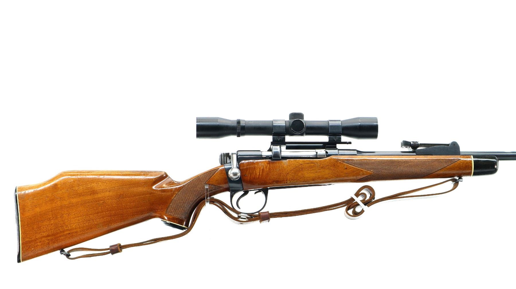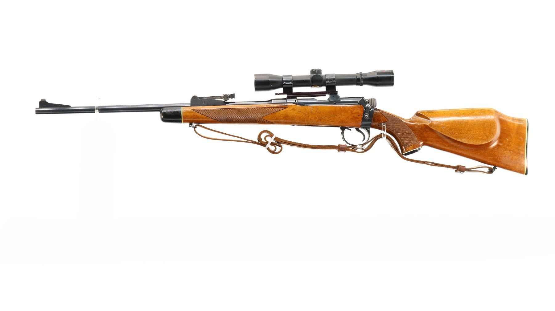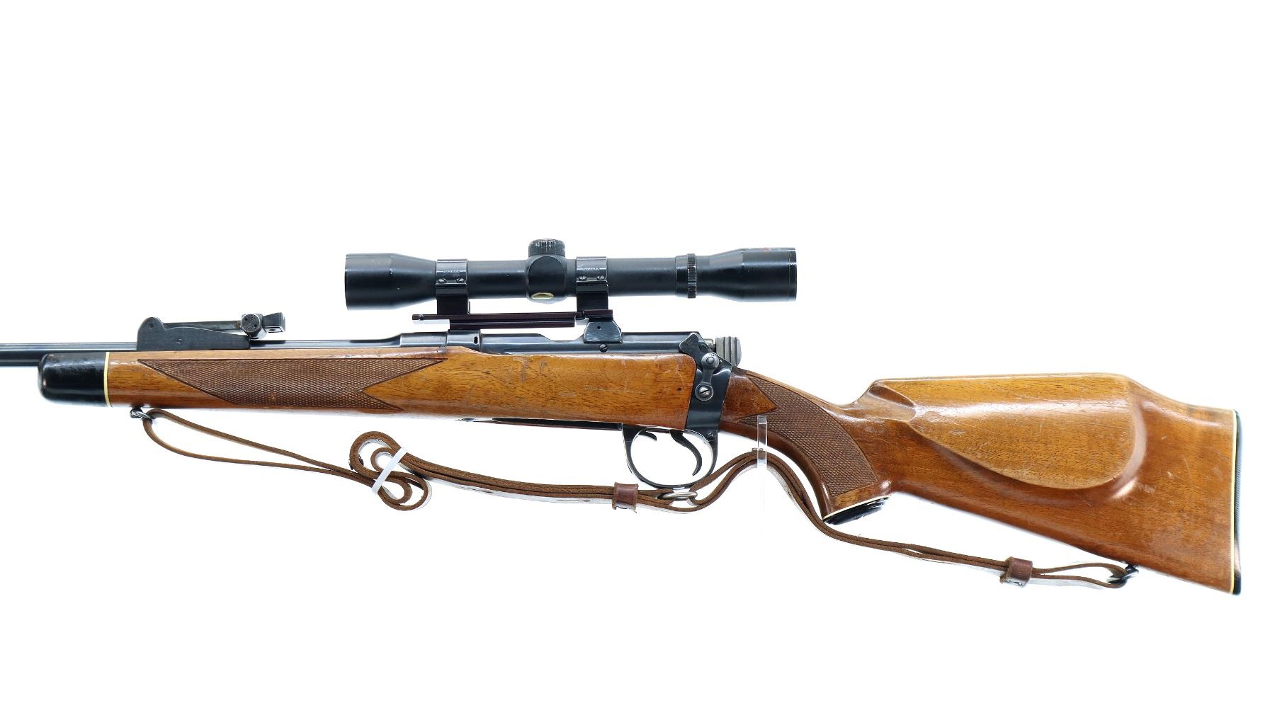 Main Description: Blade front sight with ramp, adjustable u notched rear sight, blued finish, receiver drilled and tapped with Tasco 4x32 scope installed, clear optics with fine crosshair. Bolt polished silver. Two piece Monte Carlo stocks, black polymer forend and pistol grip caps, checkered forearm and pistol grip, cheek rest, grooved black polymer butt plate, sling swivels with brown leather sling.