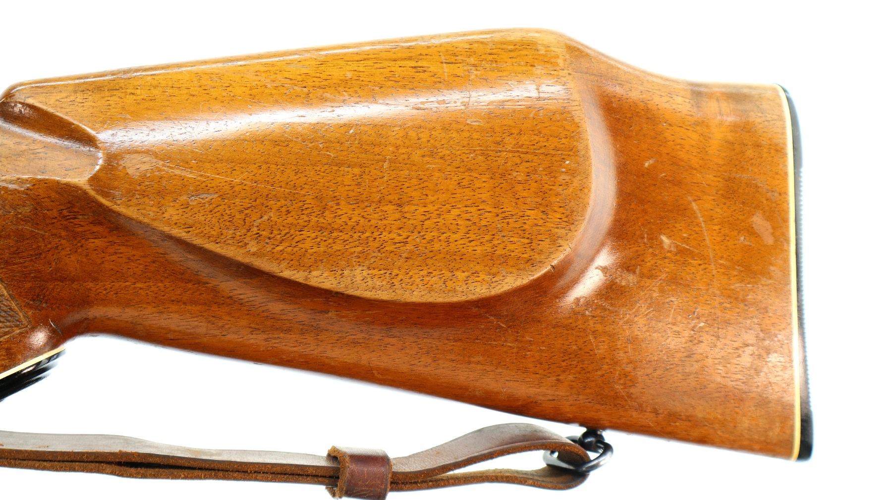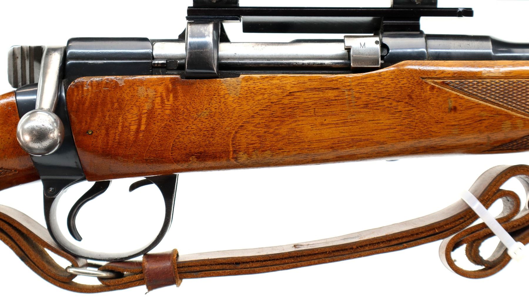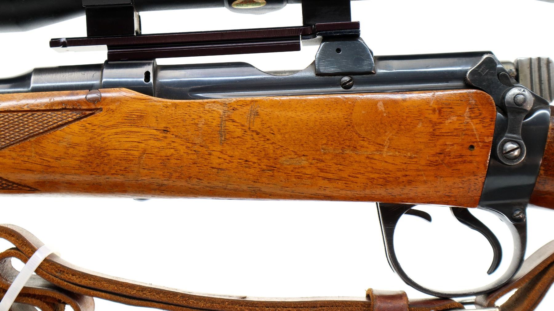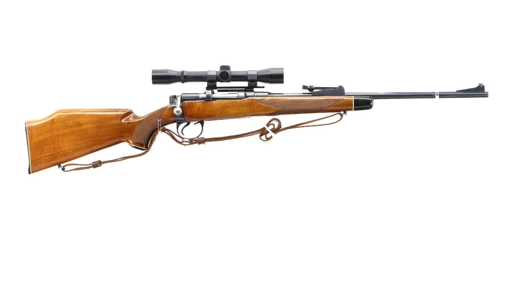 Main Description: Blade front sight with ramp, adjustable u notched rear sight, blued finish, receiver drilled and tapped with Tasco 4x32 scope installed, clear optics with fine crosshair. Bolt polished silver. Two piece Monte Carlo stocks, black polymer forend and pistol grip caps, checkered forearm and pistol grip, cheek rest, grooved black polymer butt plate, sling swivels with brown leather sling.