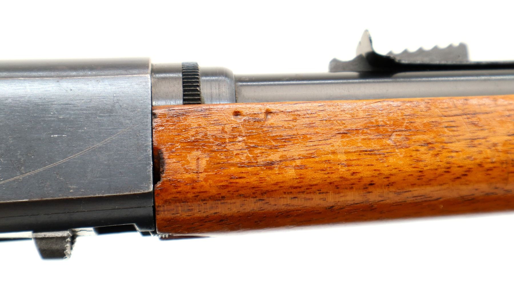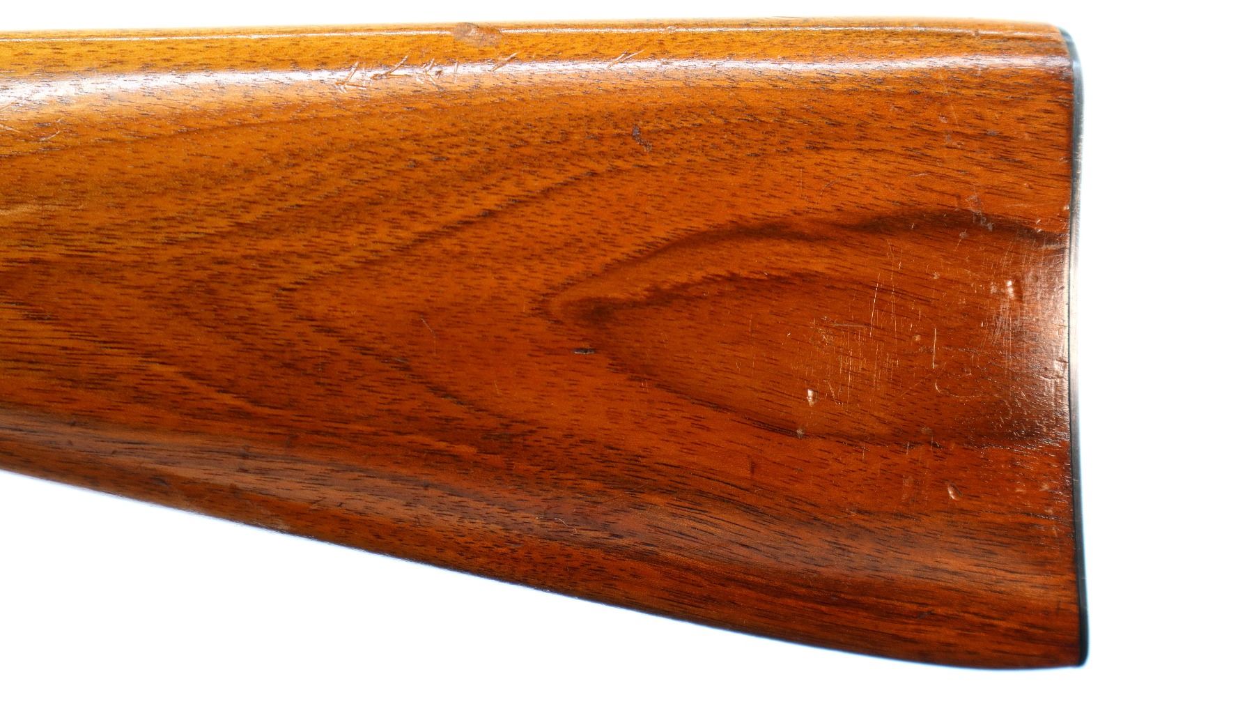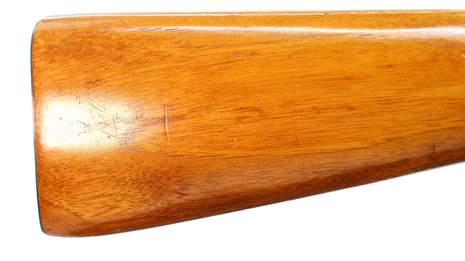 Main Description: Blade front sight, adjustable u notched rear sight, blued finish. Two piece wood stocks, pistol grip, chipped at loading port, smooth steel butt plate.