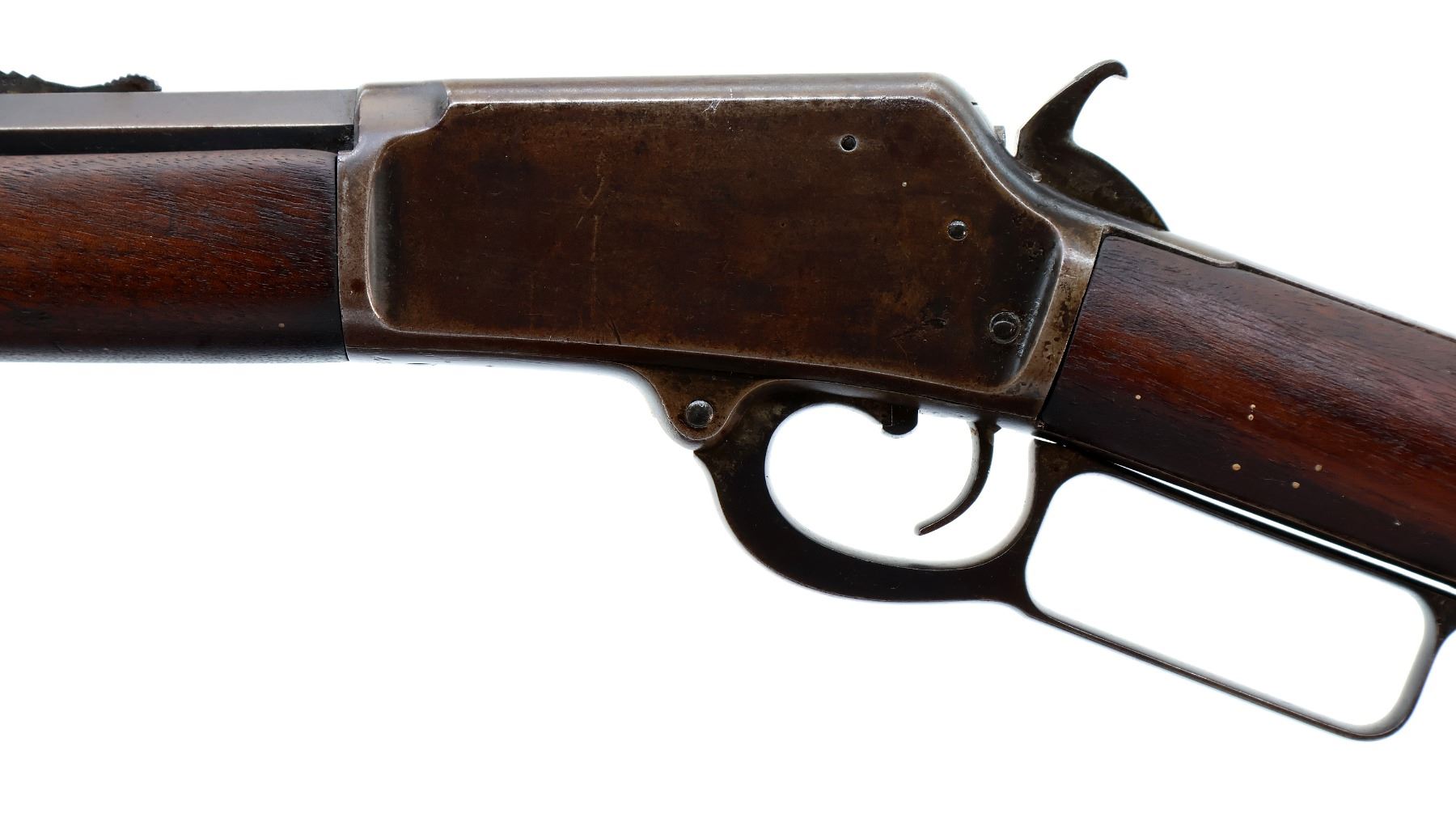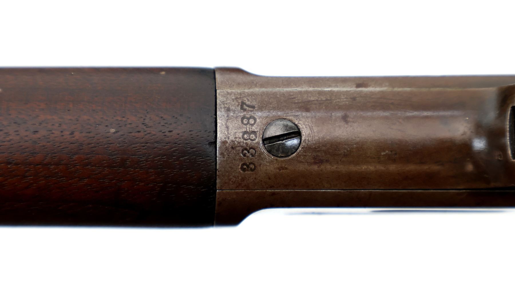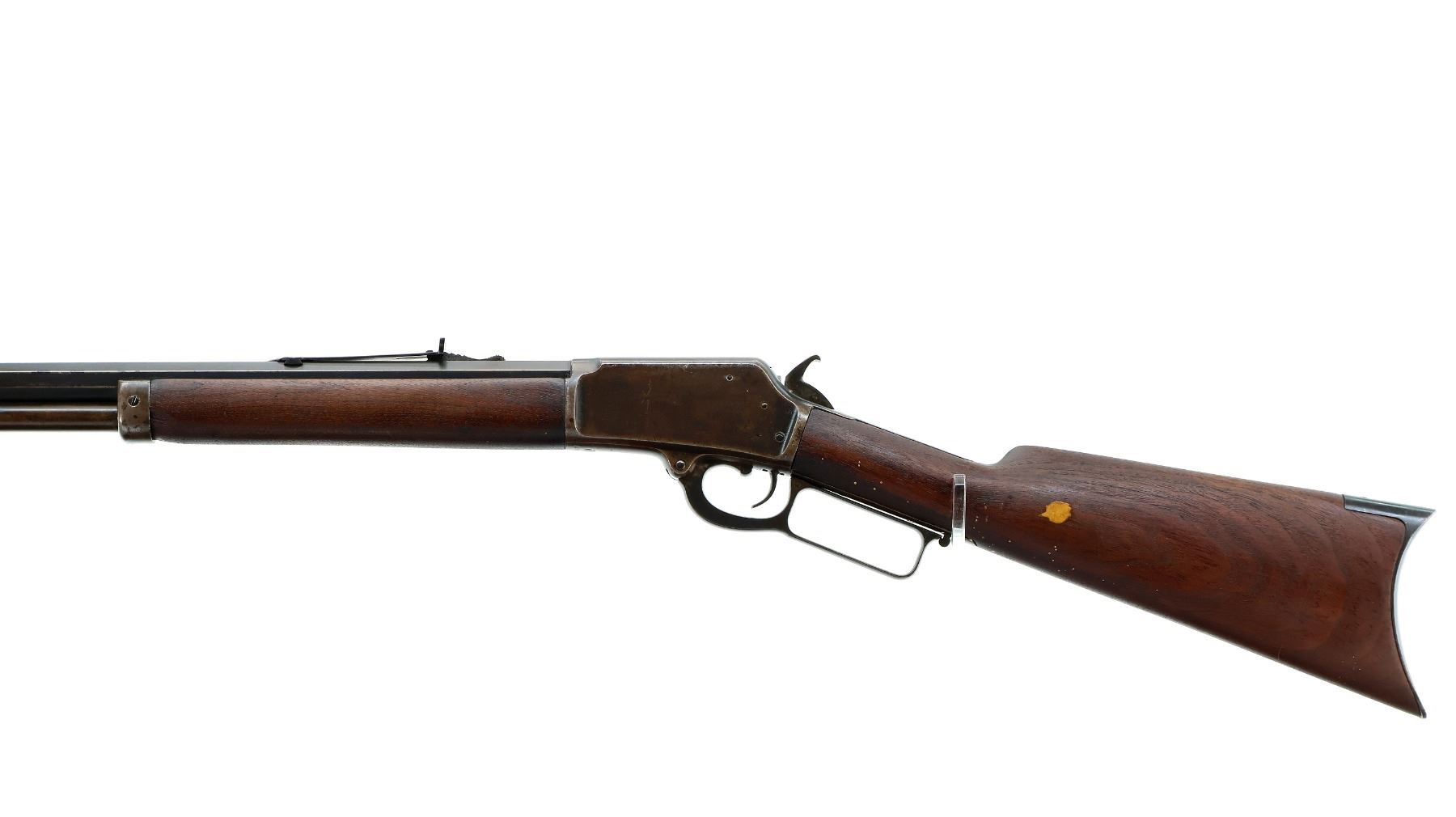 Main Description: Blade front sight, adjustable u notched rear sight, octagon barrel, checkered spur hammer. Two piece wood stocks, forearm is chipped and cracked, straight grip, chipped, cracked and repaired with new wood pieces, smooth curved steel butt plate, 2/3rd length magtube.