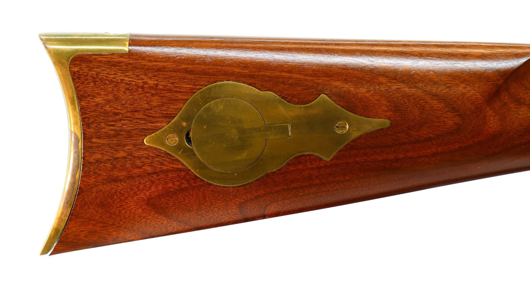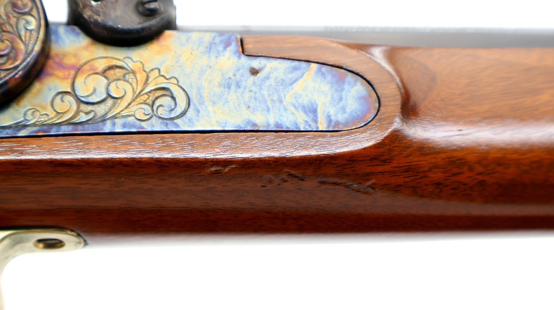 Main Description: Blade front sight, adjustable u notched rear sight, blued octagon barrel, engraved colour case hardened lock and grooved spur hammer that functions, nipple is intact, double set triggers. One piece half length wood stock, single forearm wedge, straight grip, cheek rest, smooth curved brass butt plate, patch box with jag, finger rest trigger guard and nose cap. Wood ramrod with brass tip.