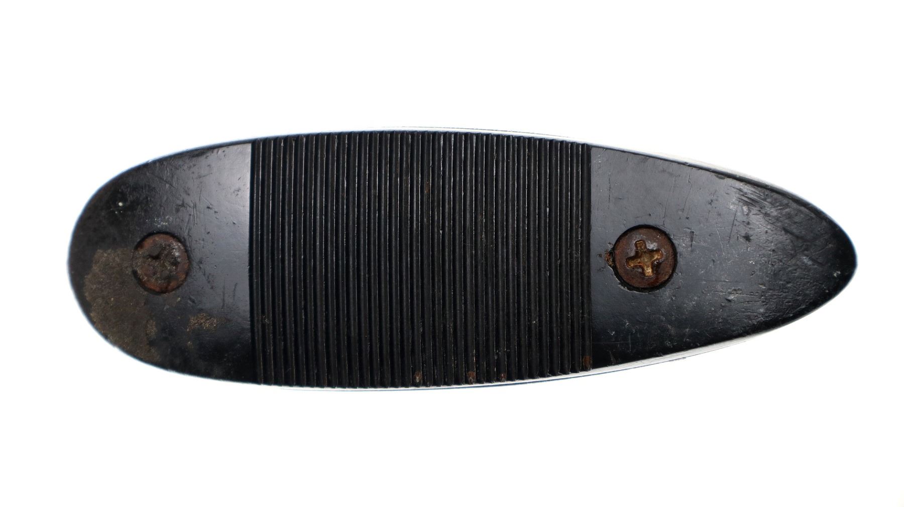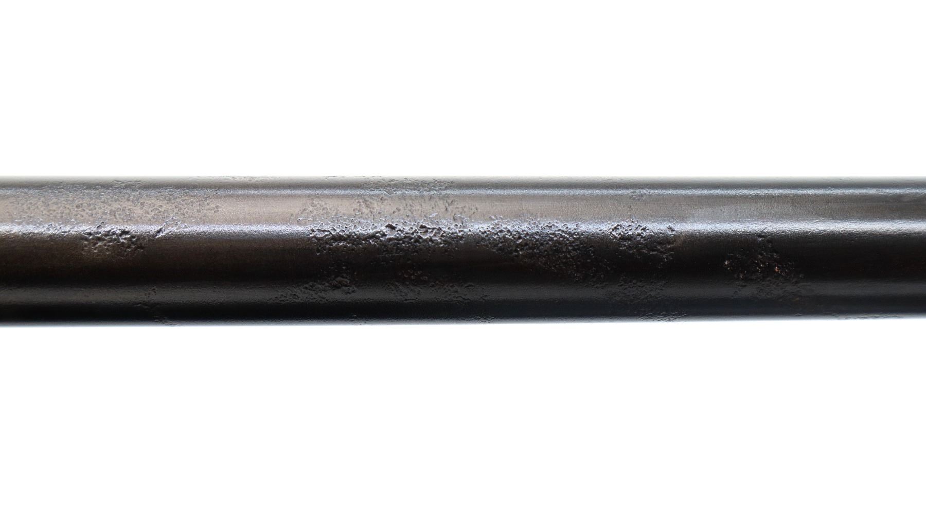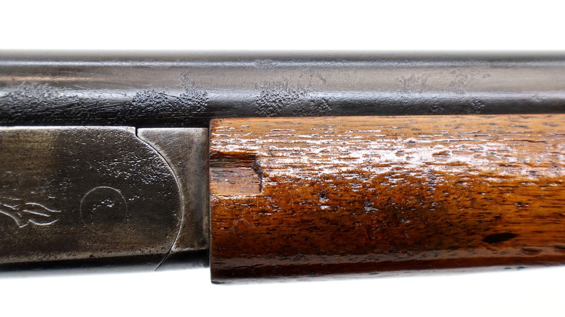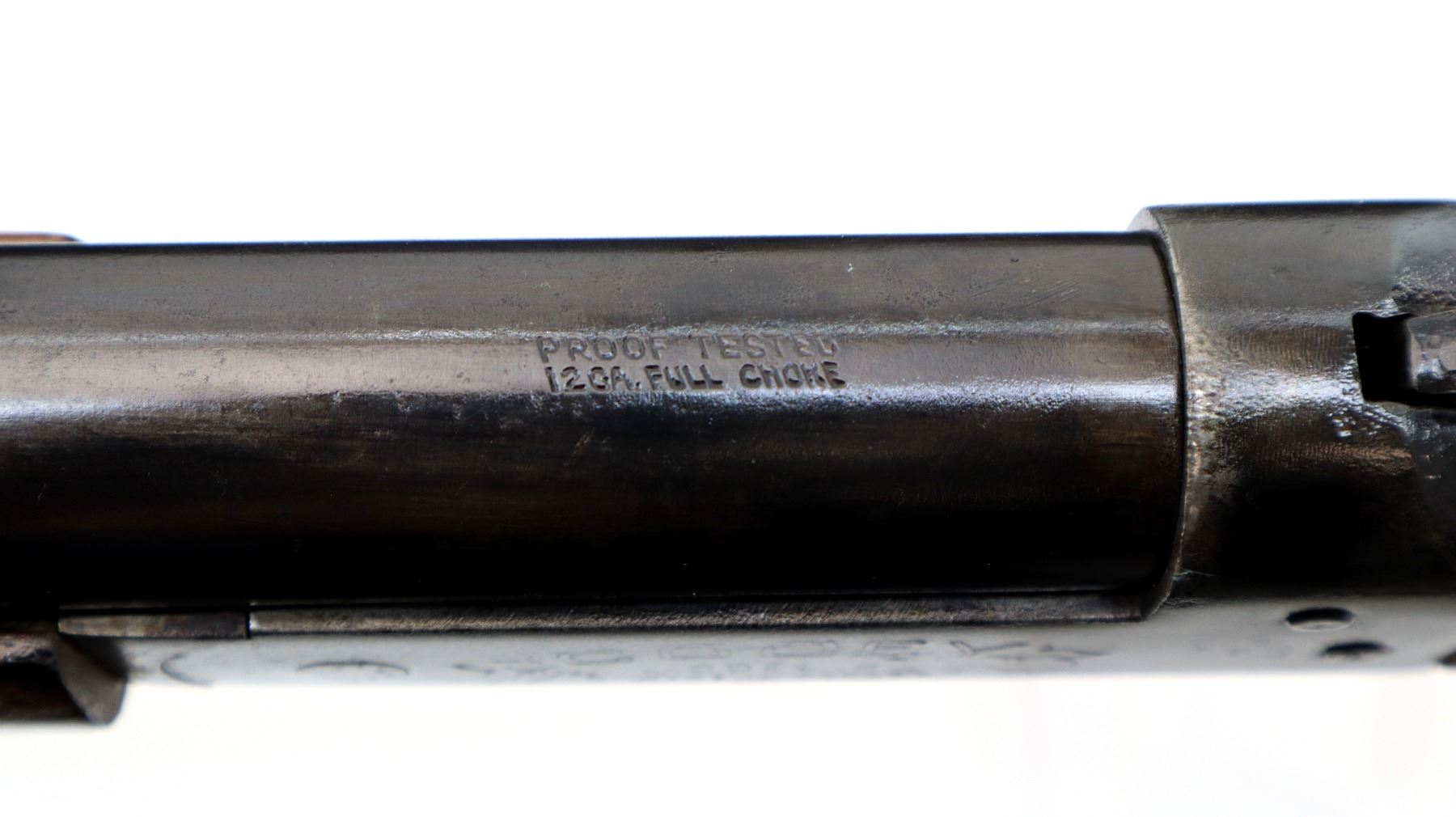 Main Description: Brass bead, metal has been reblued with pitting underneath, grooved spur hammer, ejector. Two piece wood stocks, forend is chipped and cracked, pistol grip cracked behind receiver, grooved black polymer butt plate.
