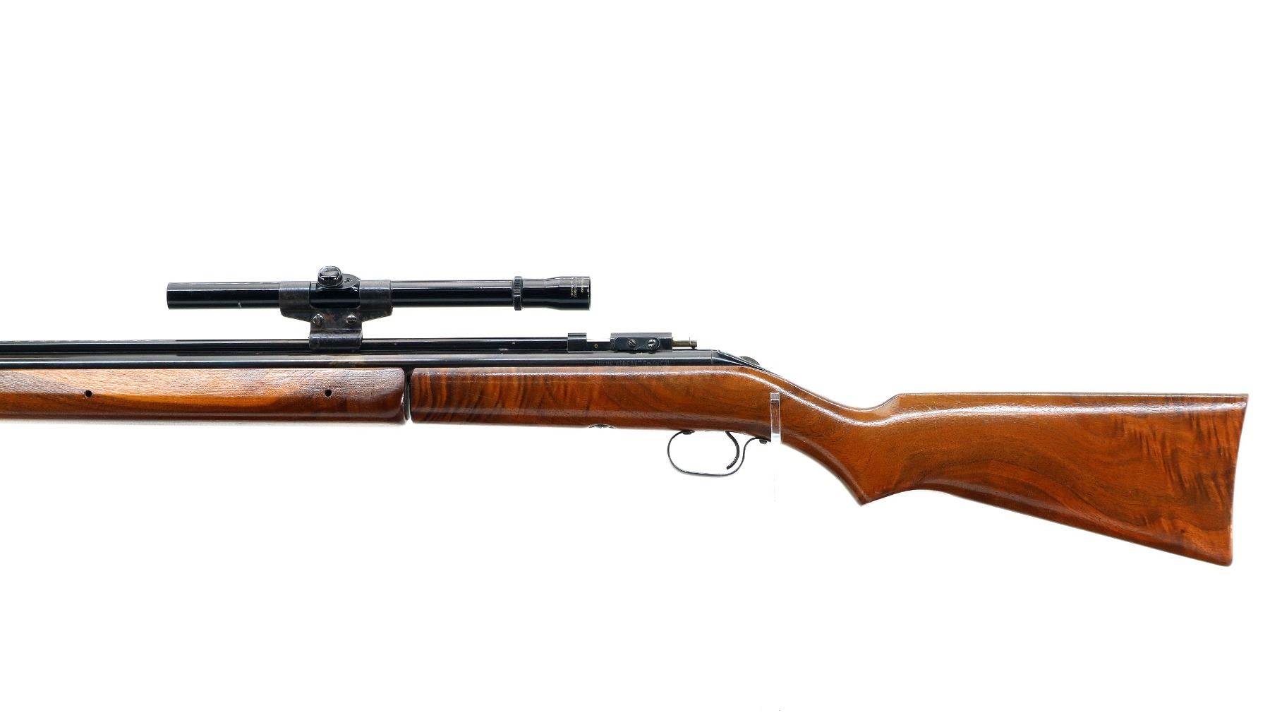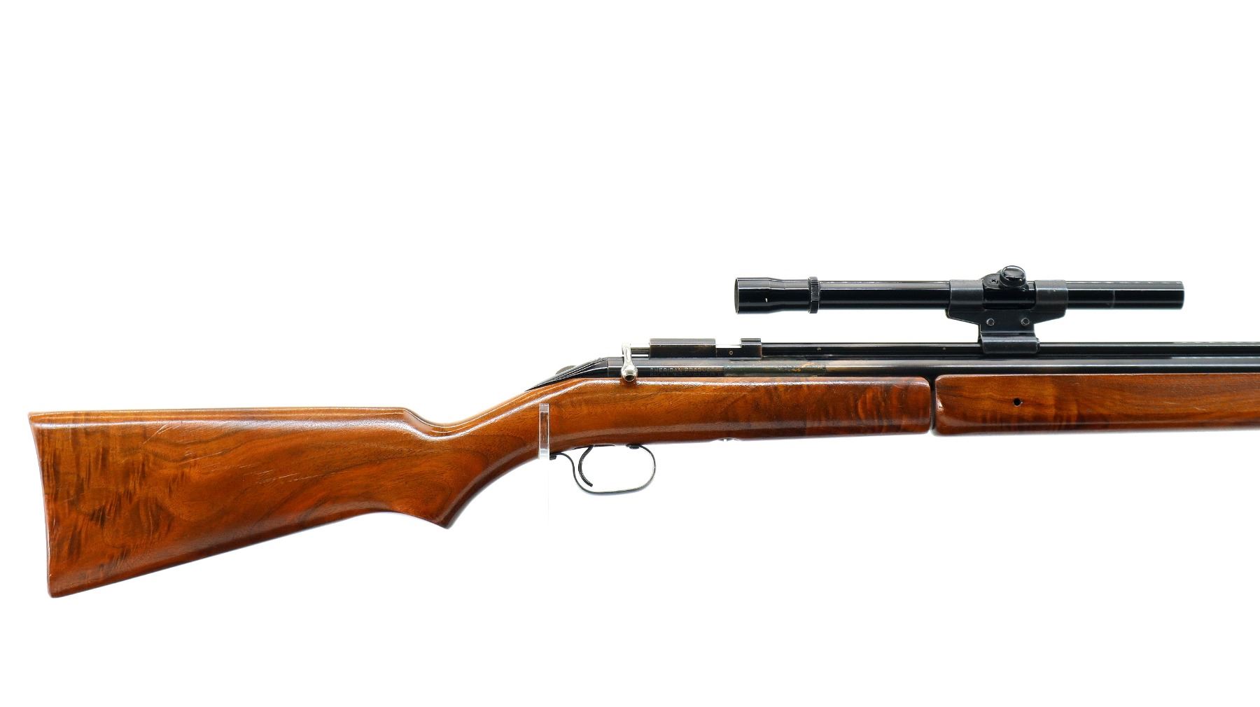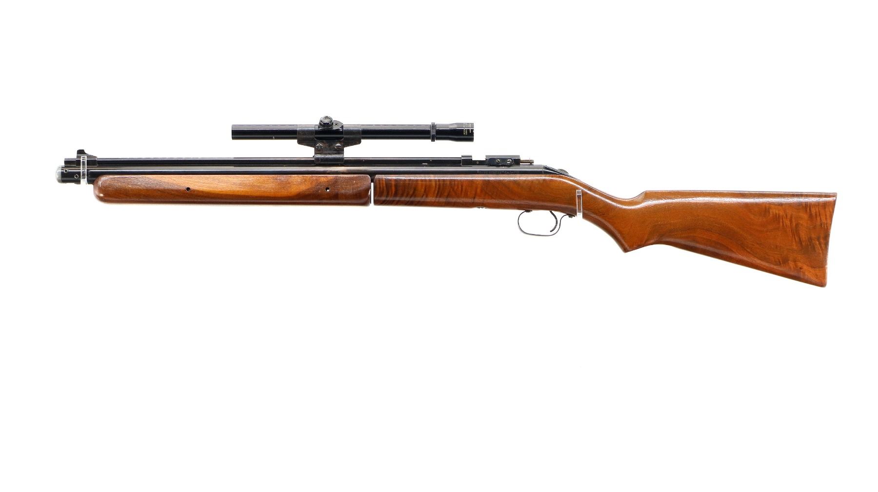 Main Description: Blade front sight, no rear sight, blued metal finish, grooved receiver, barrel has a clamp on scope mount with Crosman Arms 4x15 scope installed, clear optics and fine crosshair. Two piece wood stocks, pistol grip, smooth butt