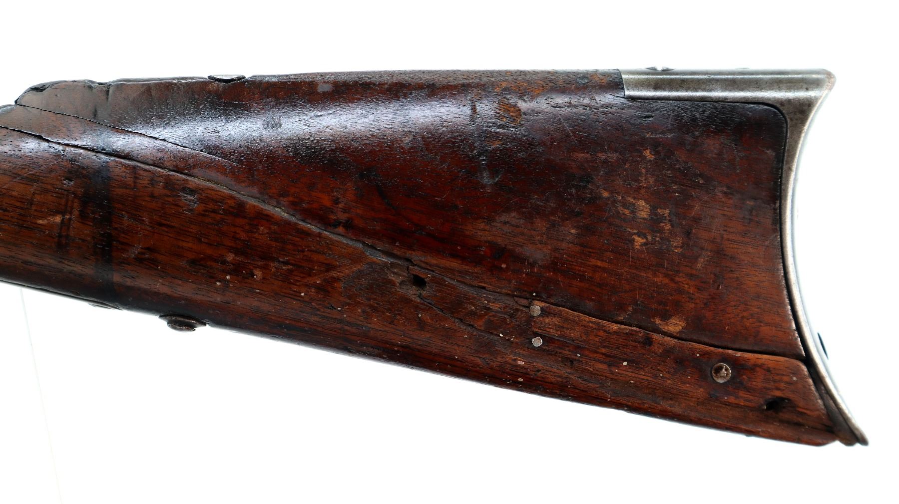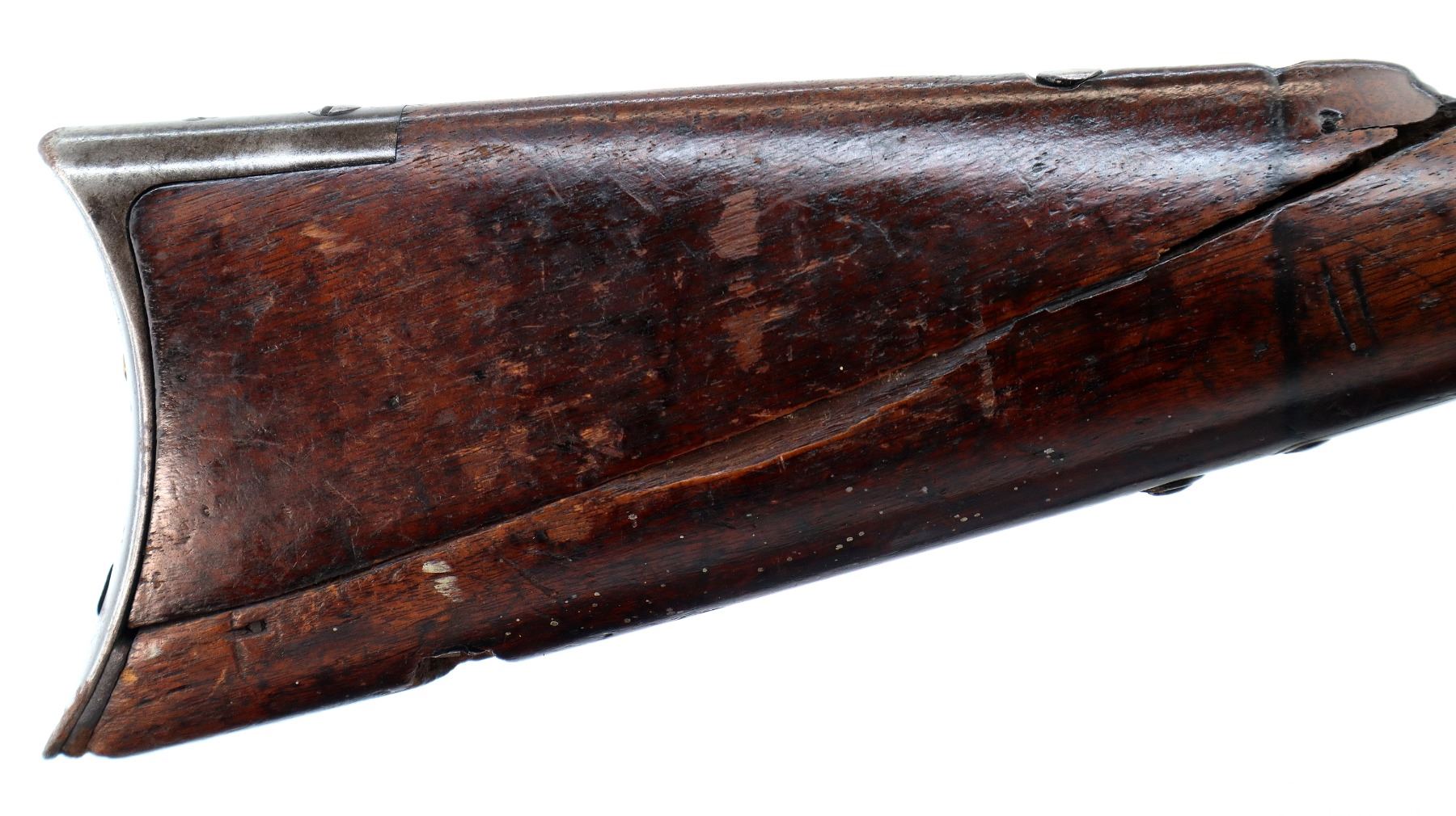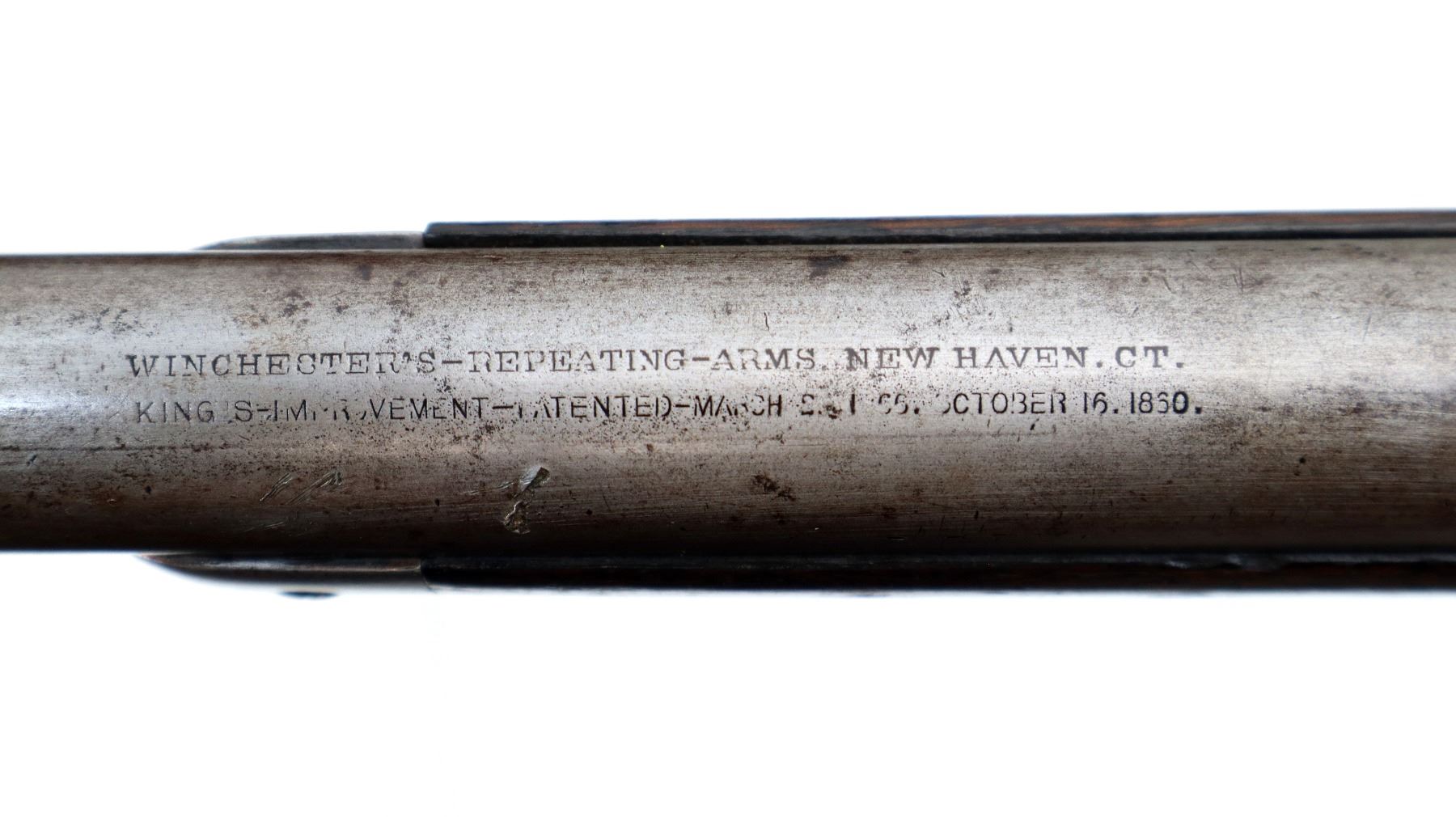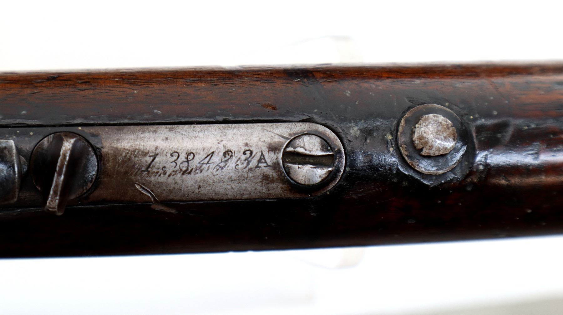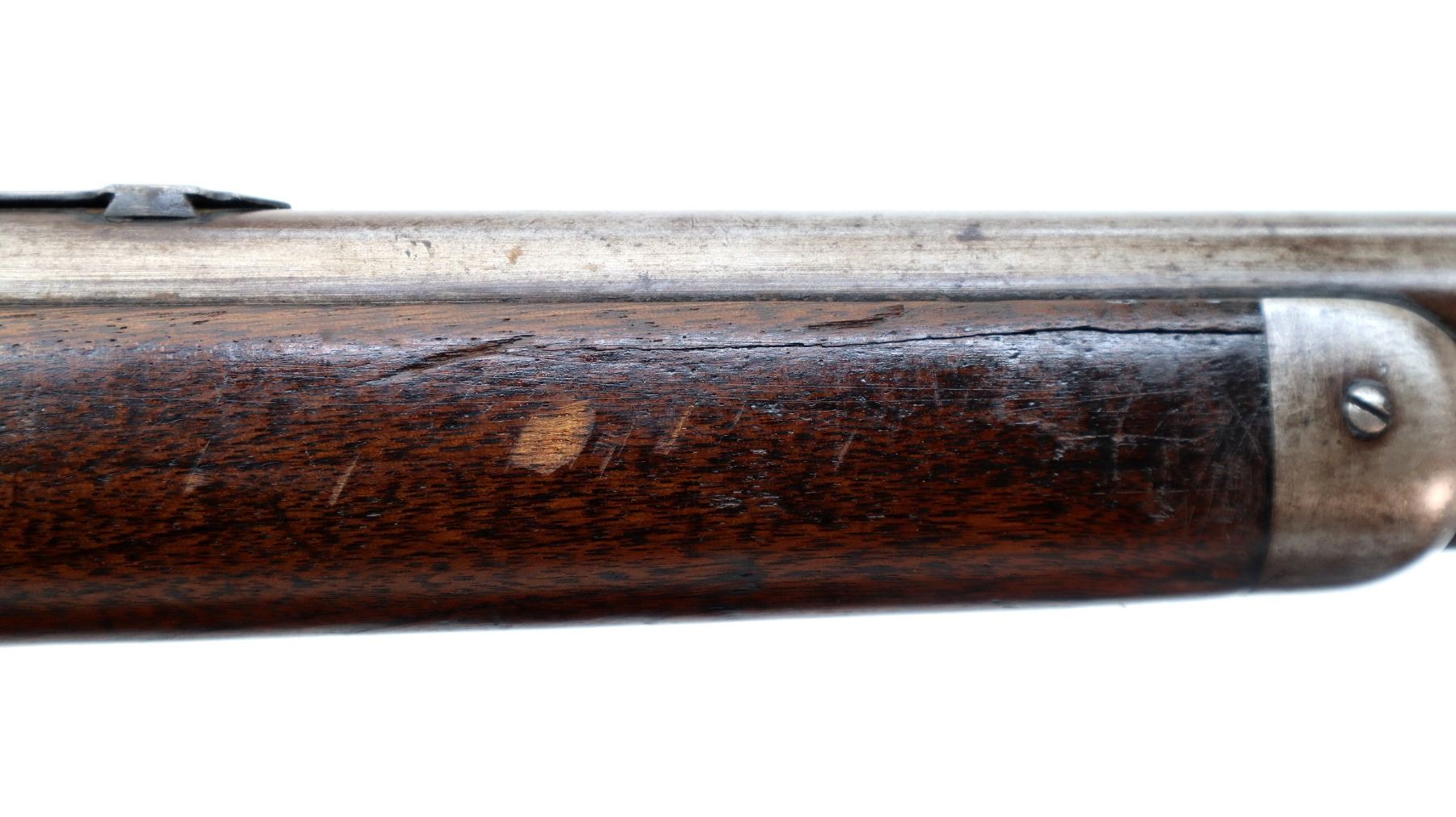 Main Description: Manufactured 1883. US Antique. Blade front sight, replaced adjustable u notched rear sight, shortened round barrel and full length magtube, sliding dust cover, mainspring is weak with checkered spur hammer. Two piece wood stocks, forearm is cracked, straight grip, stock is chipped, cracked and broken repaired with various sized nails, smooth curved steel butt plate.