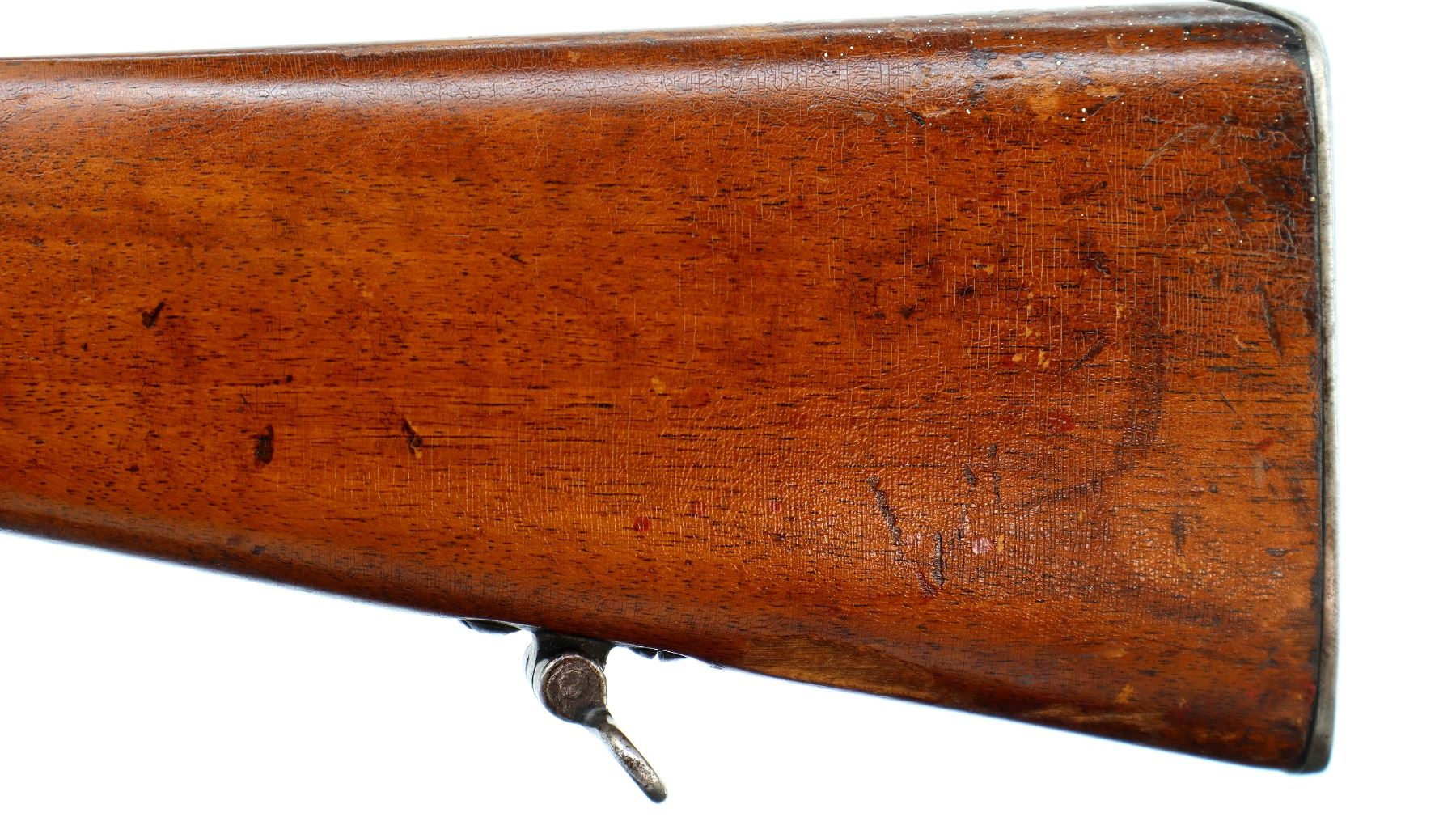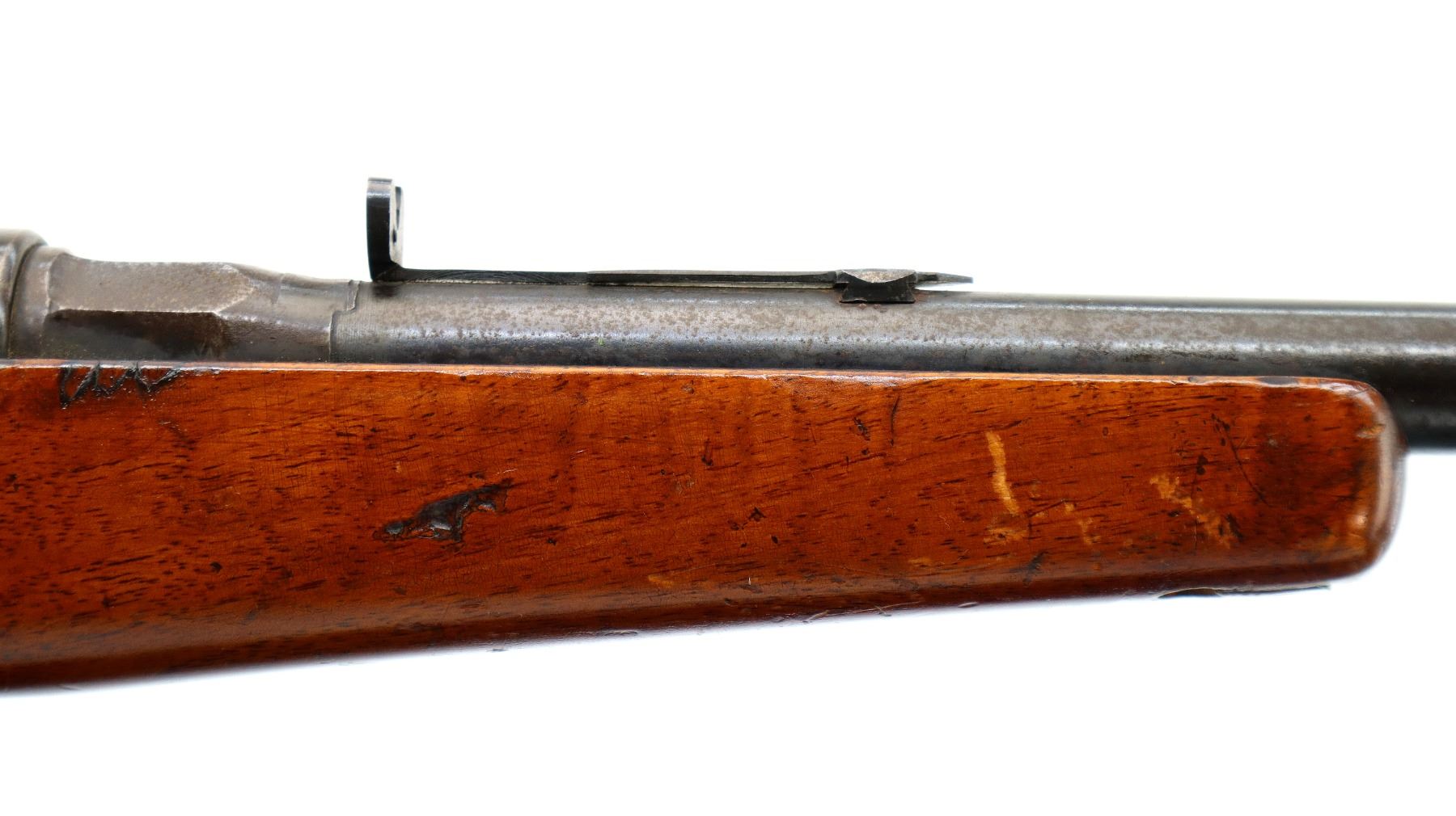 Main Description: Brass bead with ramp, u notched rear sight missing ramp, blued finish, turned down bolt handle has a fixed magazine does not use stripper clips. One piece sporterized wood stock, checkered pistol grip, smooth steel butt plate, rear sling swivel missing the front hole is present.