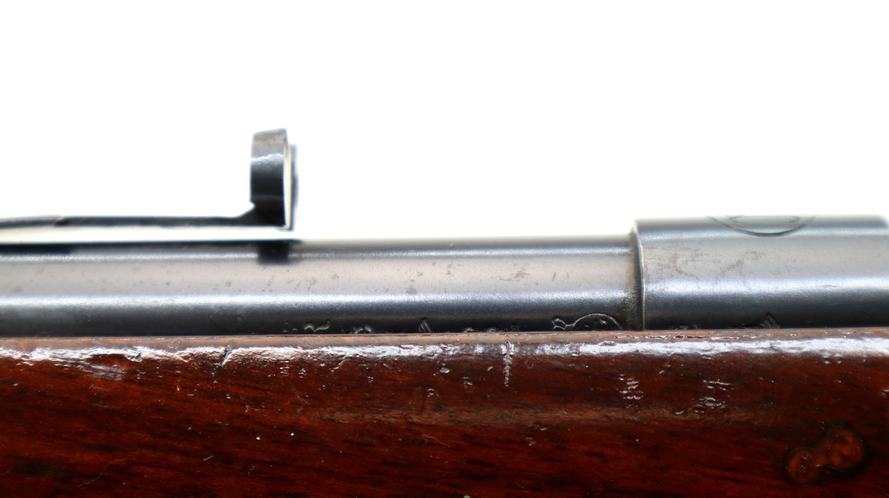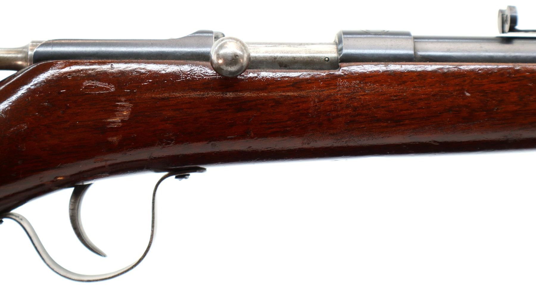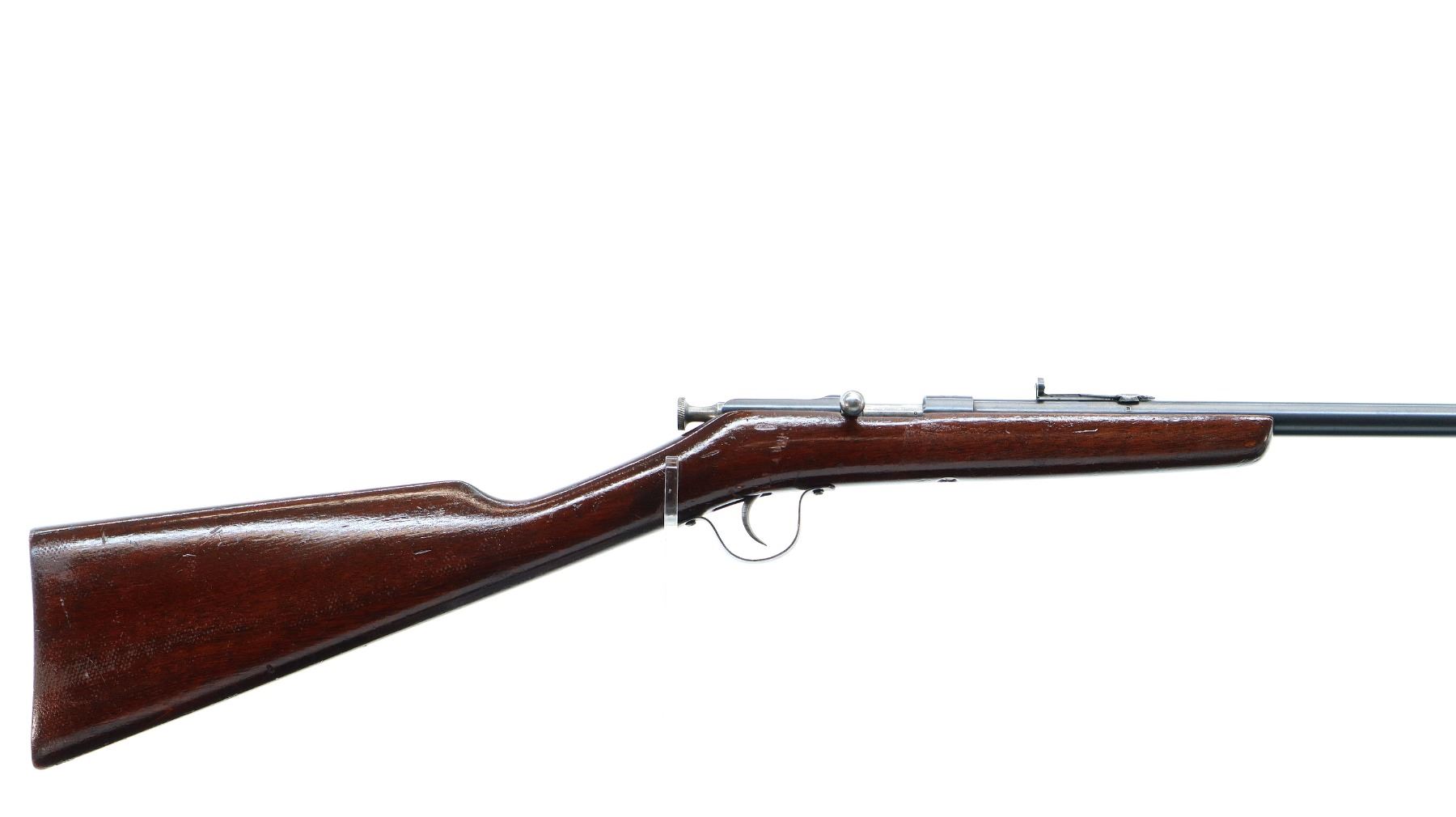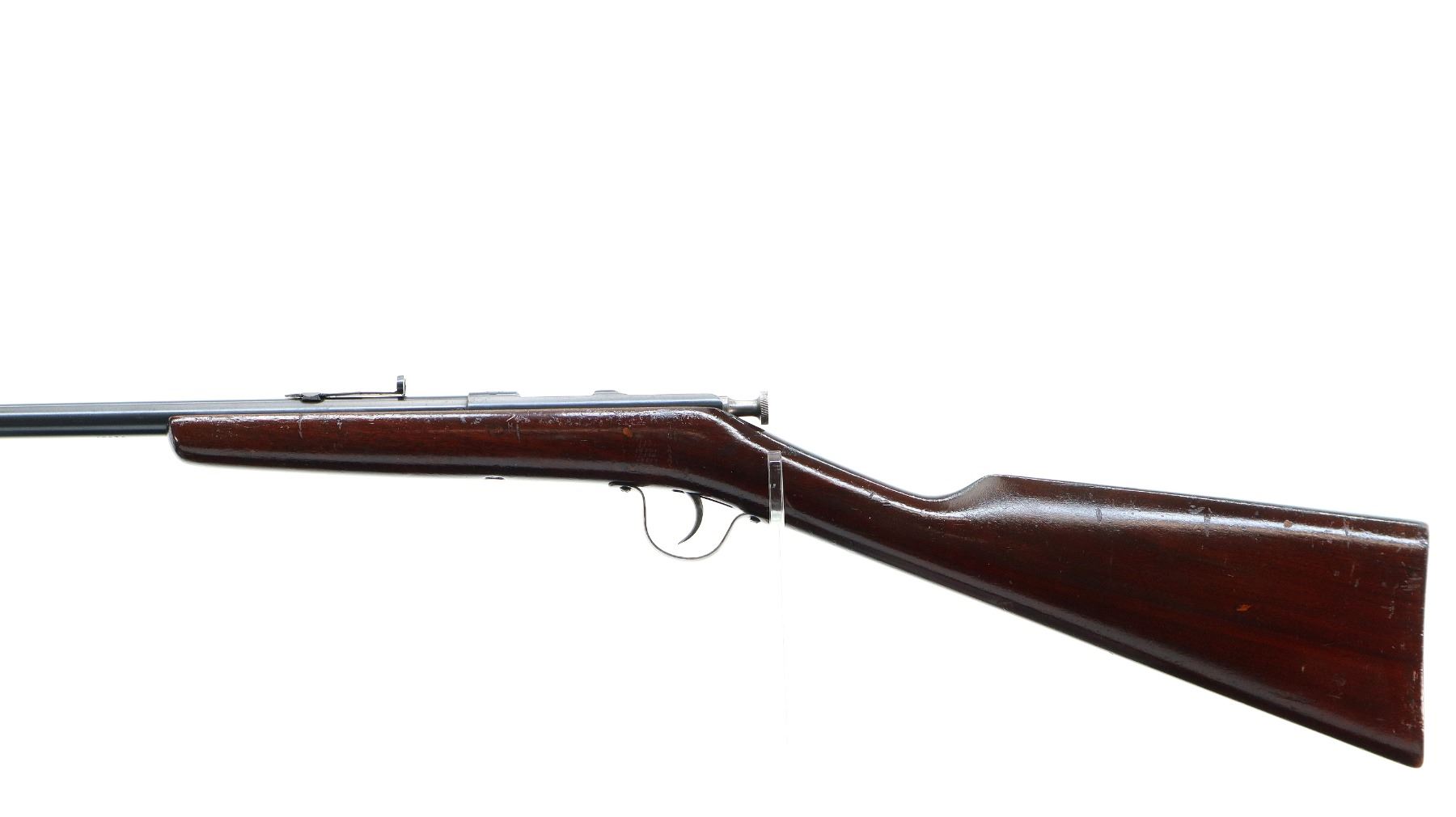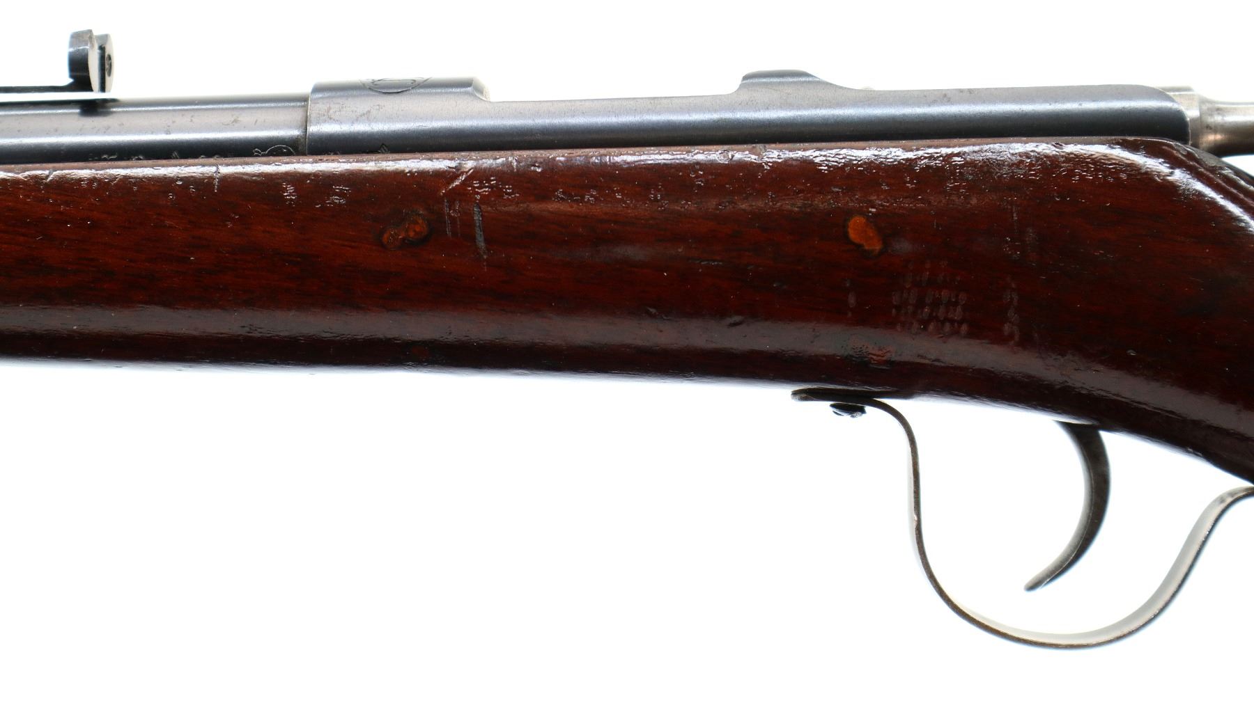 Main Description: Missing front sight dovetail present, adjustable u notched rear sight missing elevator, blued finish, straight bolt handle, extractor is present. One piece wood stock, straight grip, smooth butt.