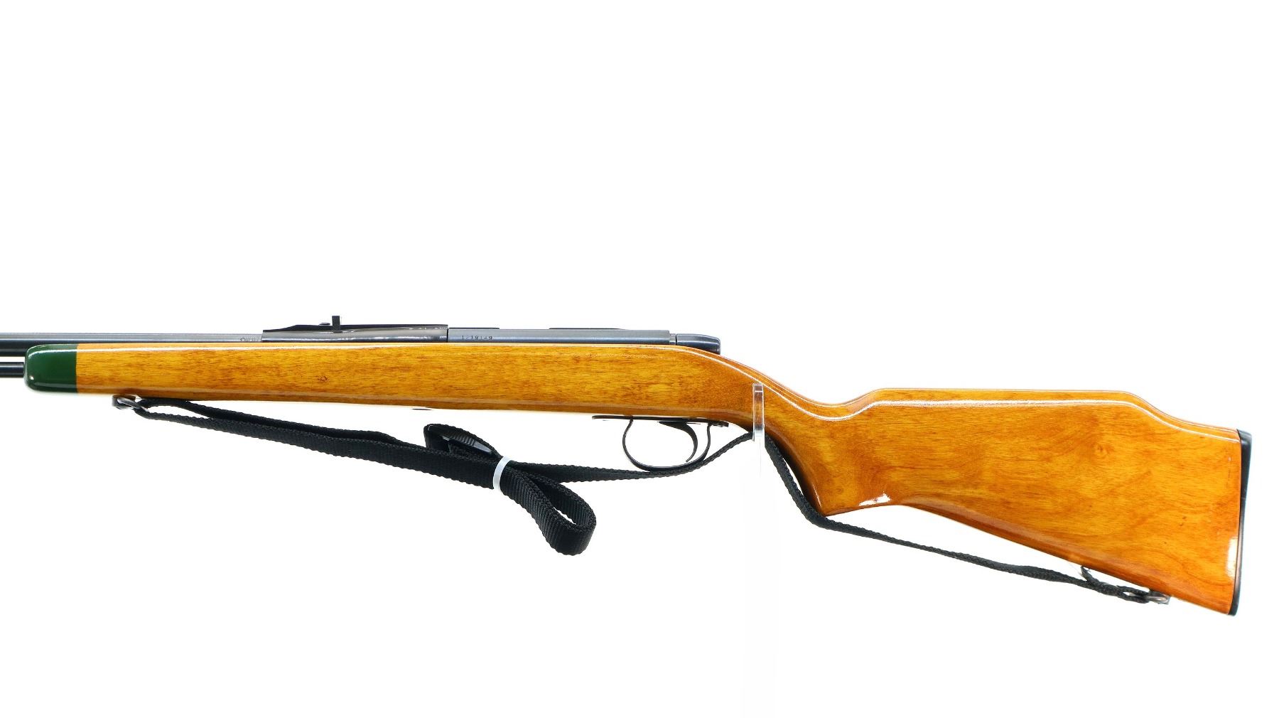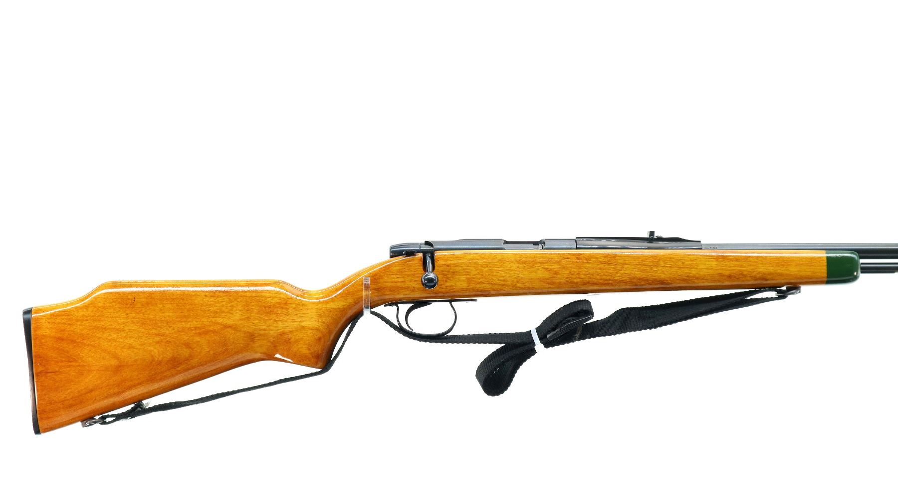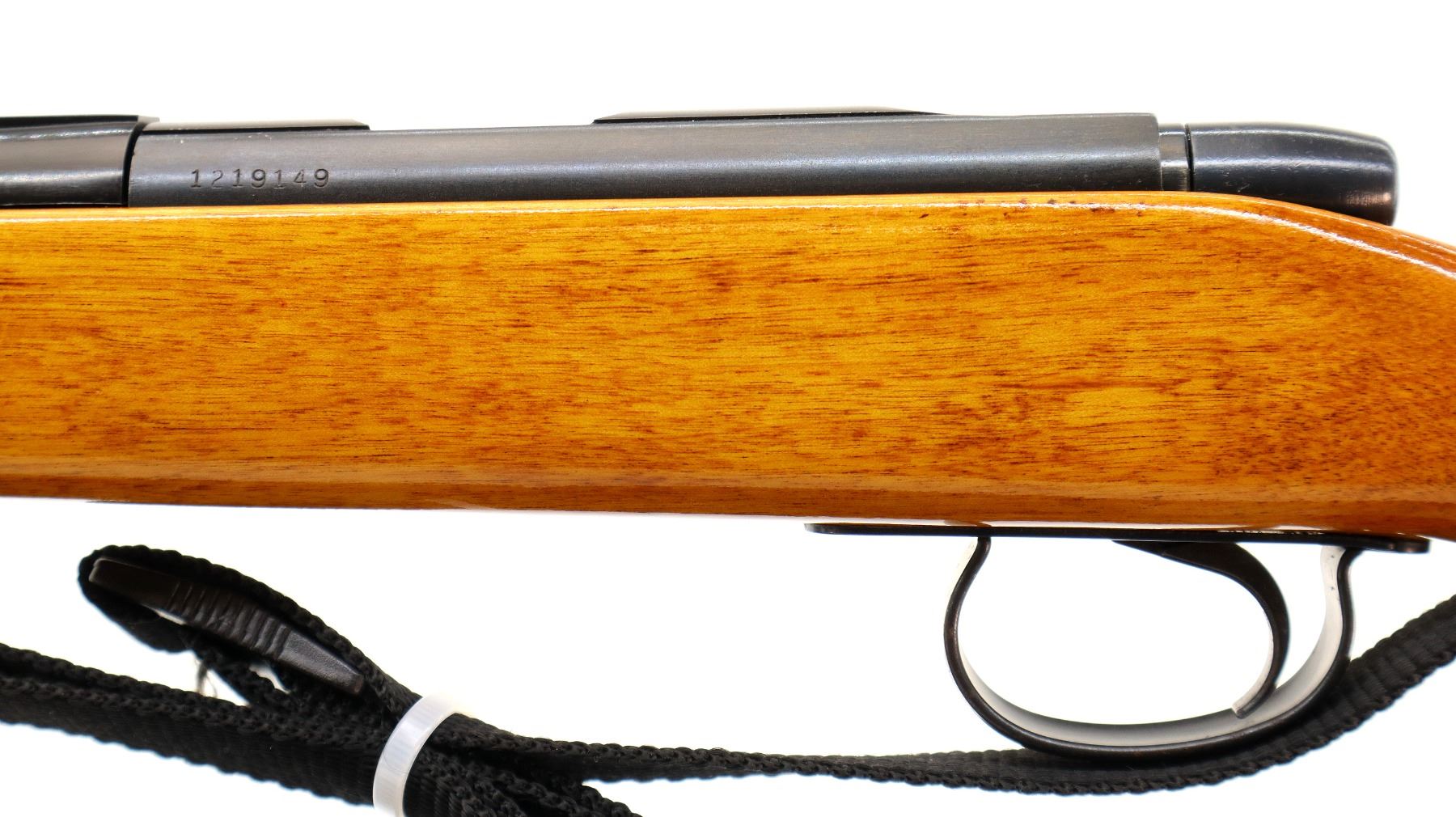 Main Description: Blade front sight, adjustable u notched rear sight, blued finish, grooved receiver, bolt appears to be missing extractor spring does not operate correctly requires parts or repair. One piece wood stock, green painted forend tip, pistol grip, raised comb, checkered black polymer butt plate, sling swivels with black nylon sling.