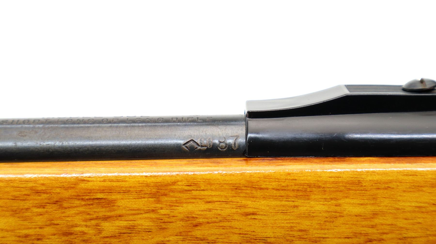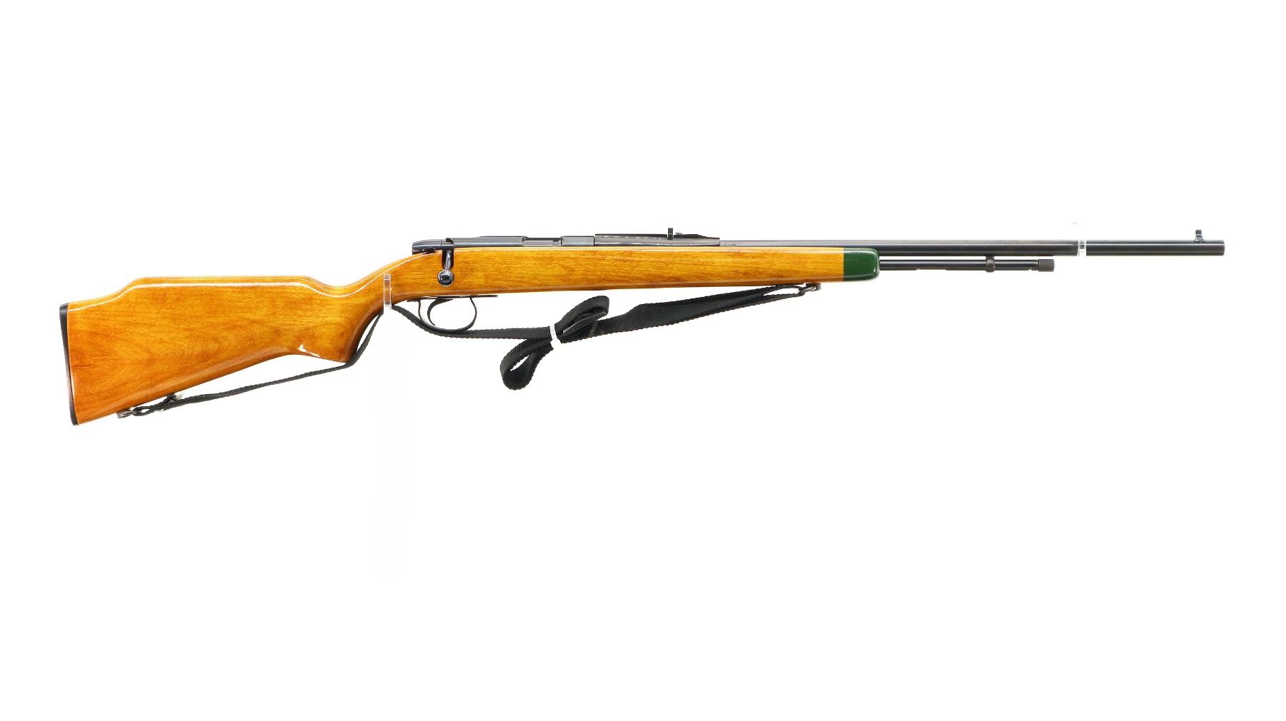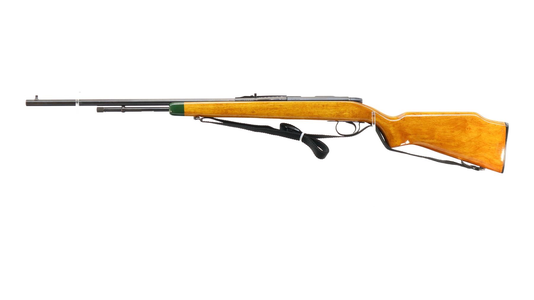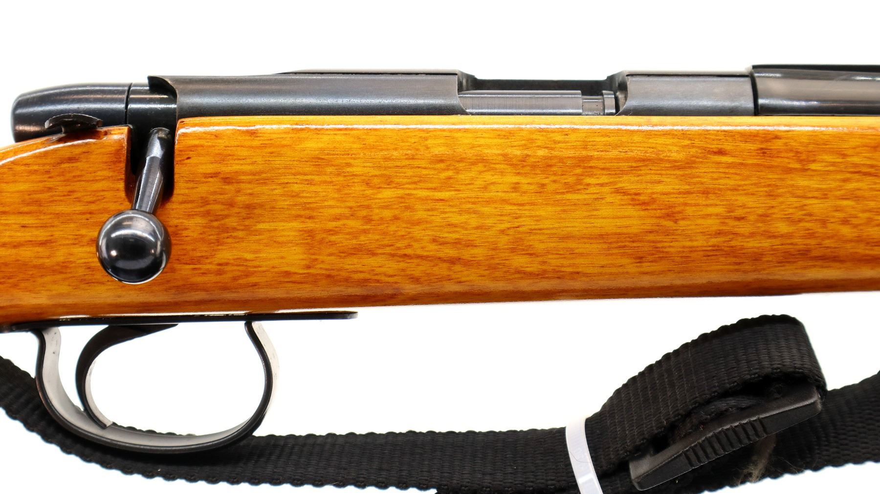 Main Description: Blade front sight, adjustable u notched rear sight, blued finish, grooved receiver, bolt appears to be missing extractor spring does not operate correctly requires parts or repair. One piece wood stock, green painted forend tip, pistol grip, raised comb, checkered black polymer butt plate, sling swivels with black nylon sling.