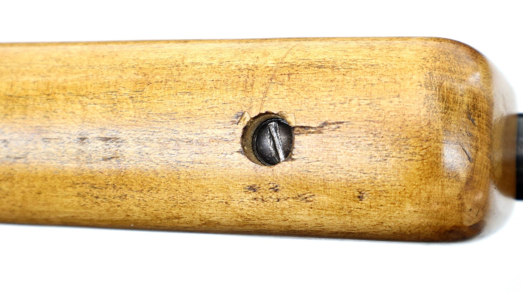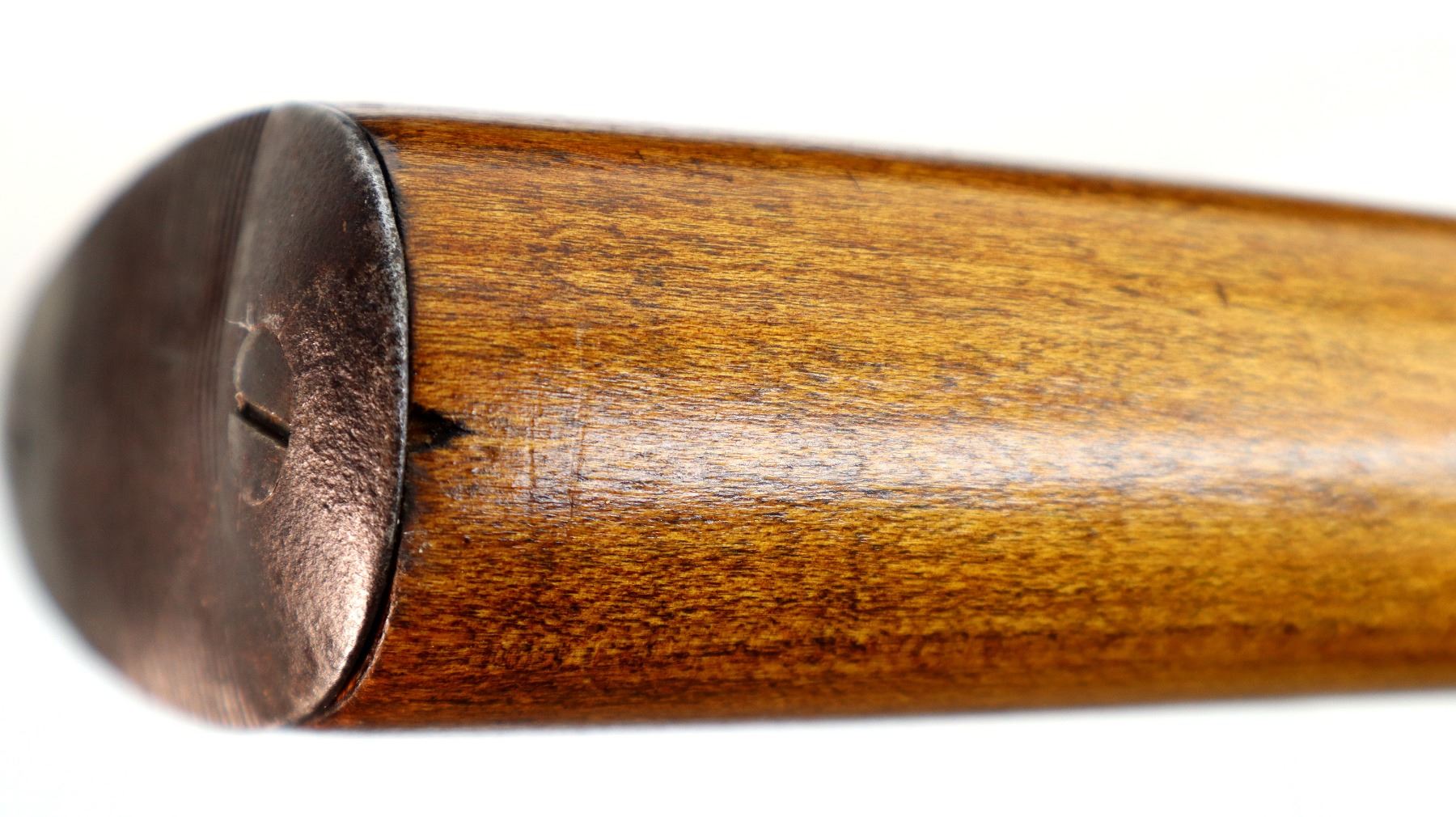 Main Description: Silver bead, blued finish, round barrel, action does not function correctly requires repair. Two piece replaced wood stocks, grooved forearm, pistol grip, grooved steel butt plate.