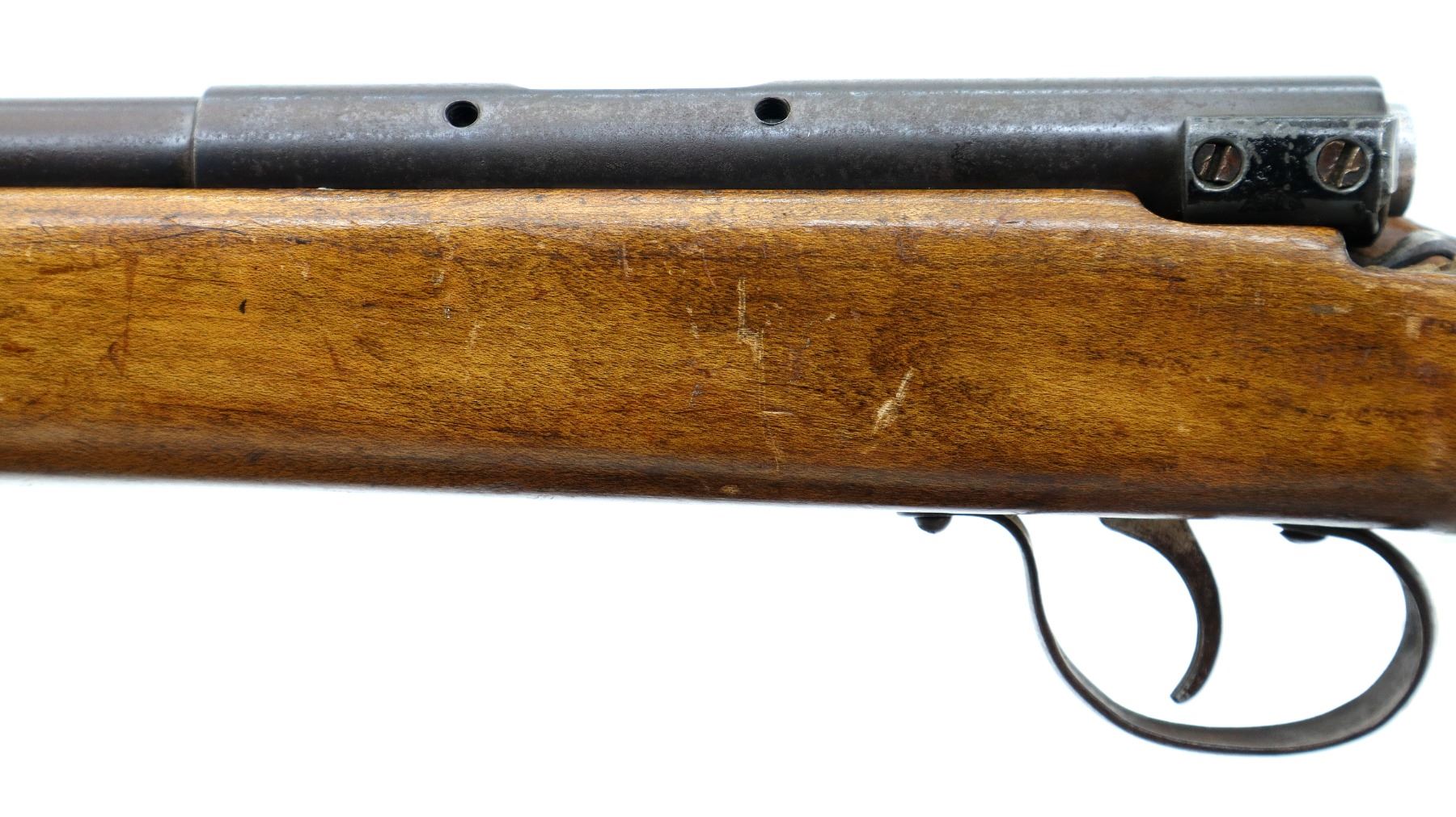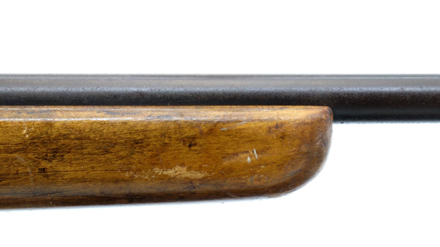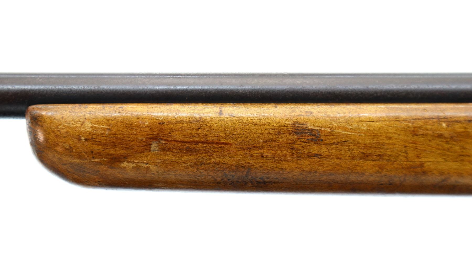 Main Description: Blade front sight with ramp, rear sight broken off, heavy barrel, receiver drilled and tapped with no plug screws installed. One piece replaced wood stock, pistol grip chipped on left side, smooth wood butt plate.