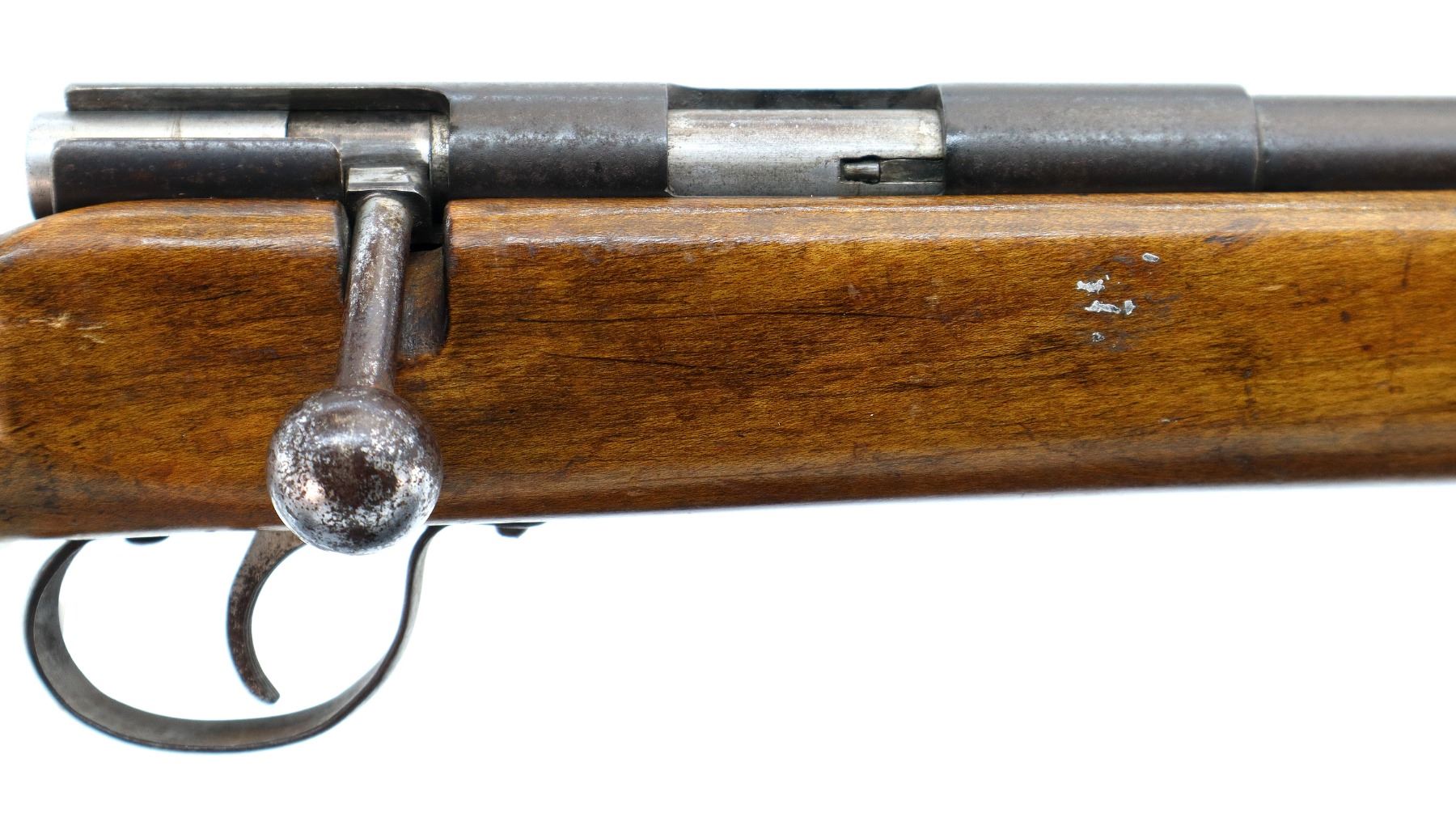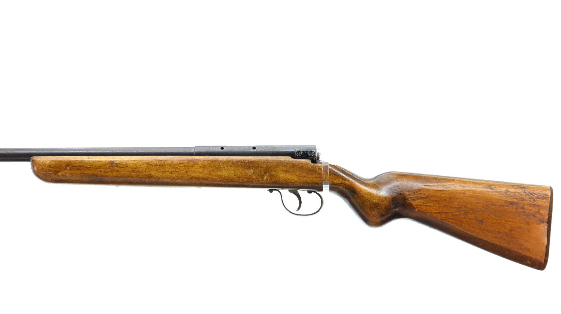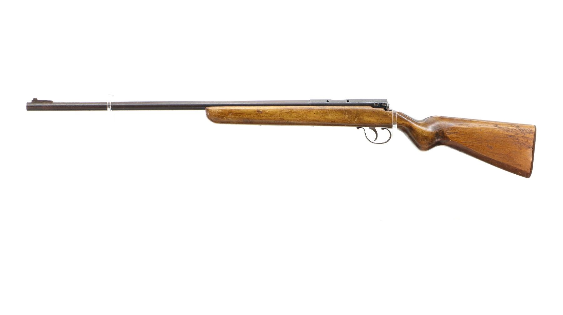 Main Description: Blade front sight with ramp, rear sight broken off, heavy barrel, receiver drilled and tapped with no plug screws installed. One piece replaced wood stock, pistol grip chipped on left side, smooth wood butt plate.