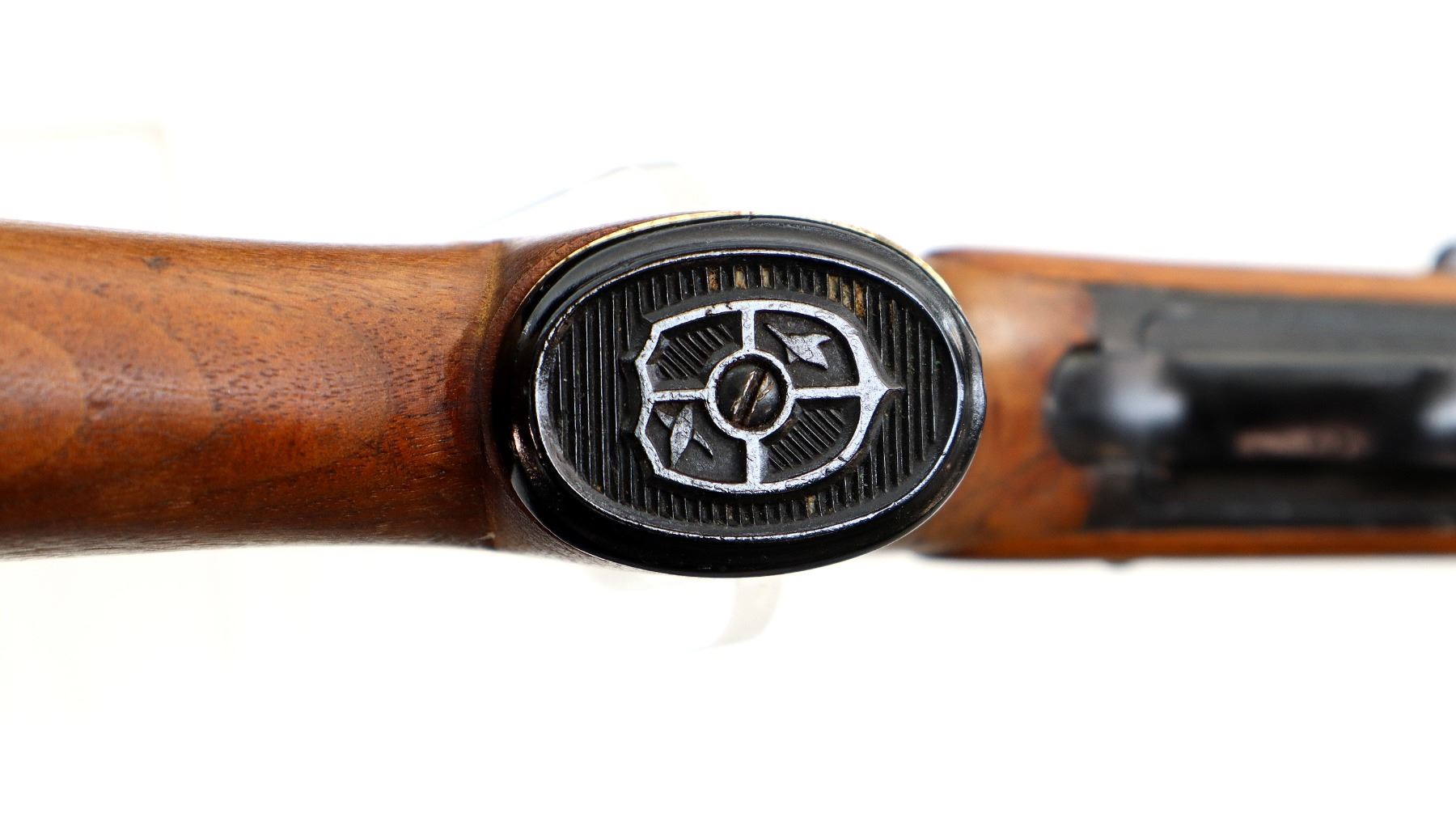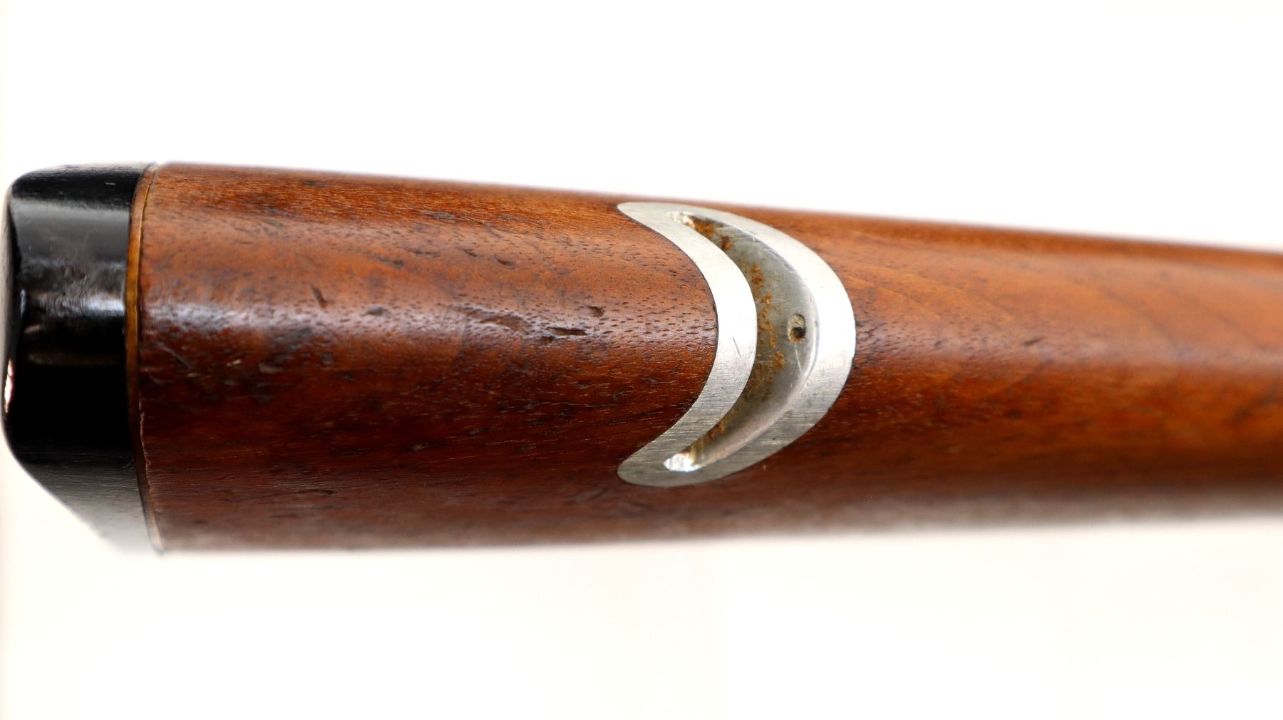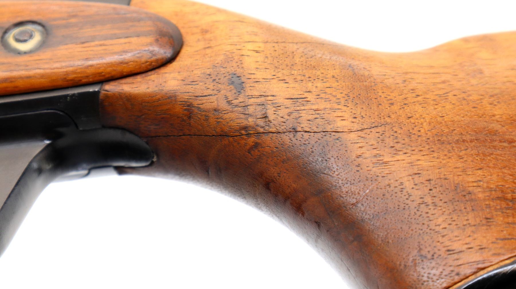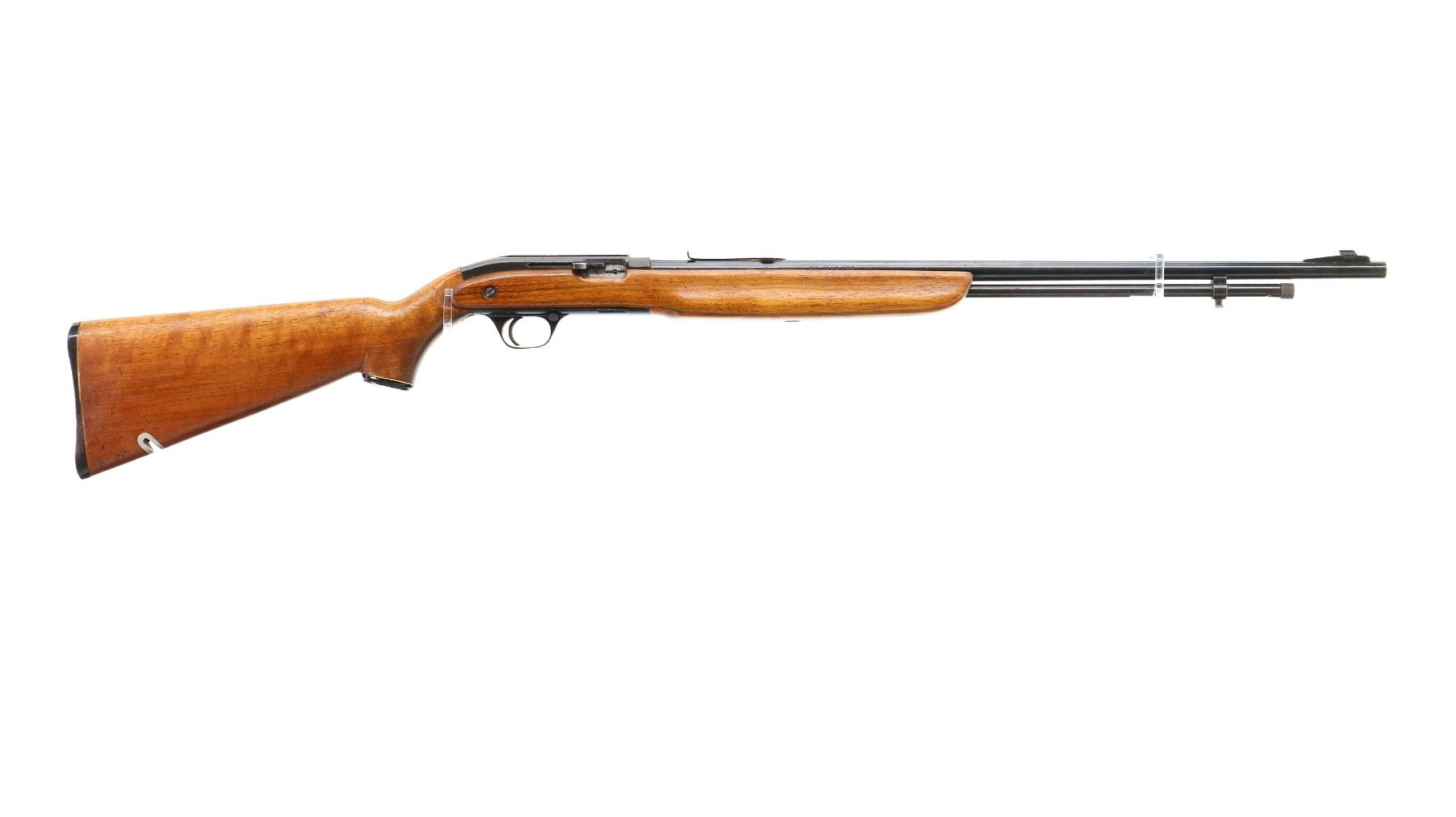 Main Description: Blade front sight with ramp, u notched rear sight missing elevator, blued barrel and outer magtube, grooved black alloy receiver. Two piece wood stocks, pistol grip which is cracked, grooved black polymer butt plate, grip cap, missing retractable sling.