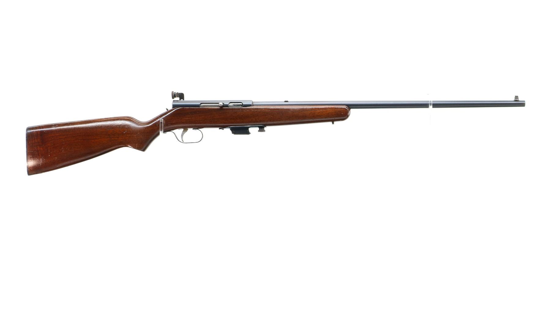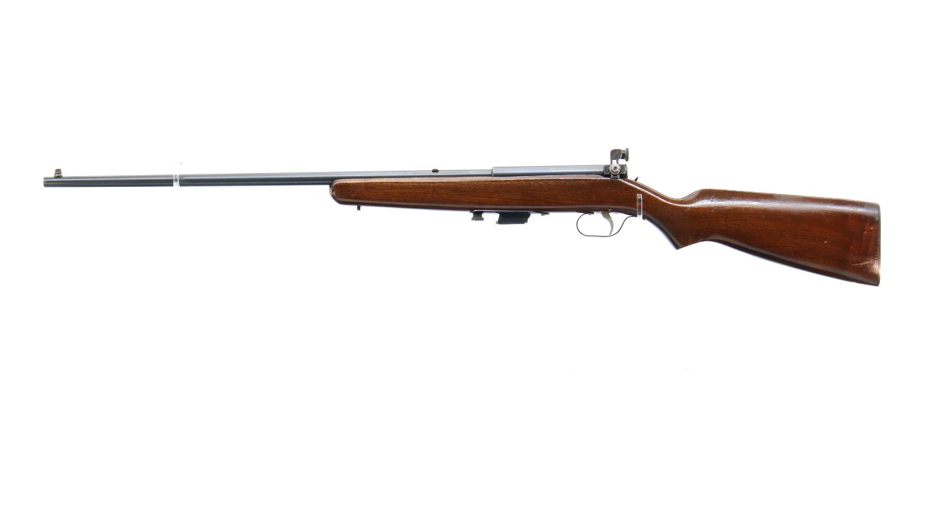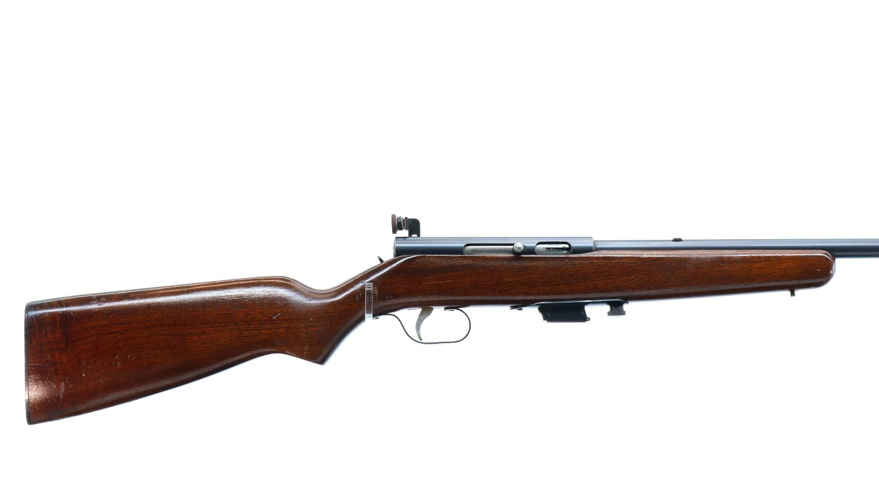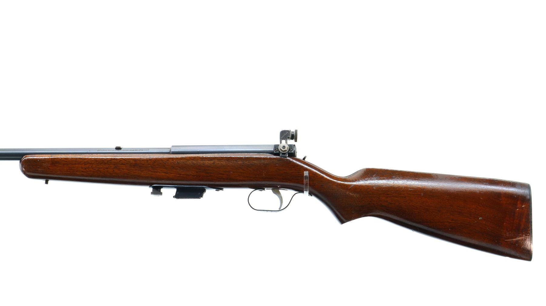 Main Description: Blade front sight, no rear sight slot filled with a blank, receiver has an adjustable peep sight installed with replaced adjustment screw, blued finish, small bolt knob. One piece wood stock, pistol grip, smooth black polymer butt plate, missing swivels rear hole present front threaded stud.