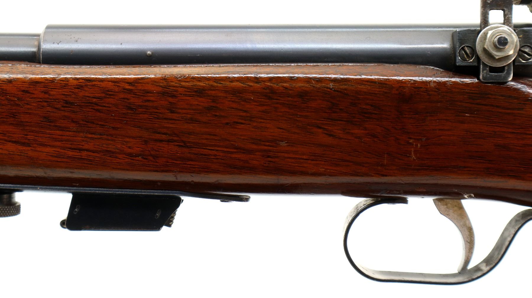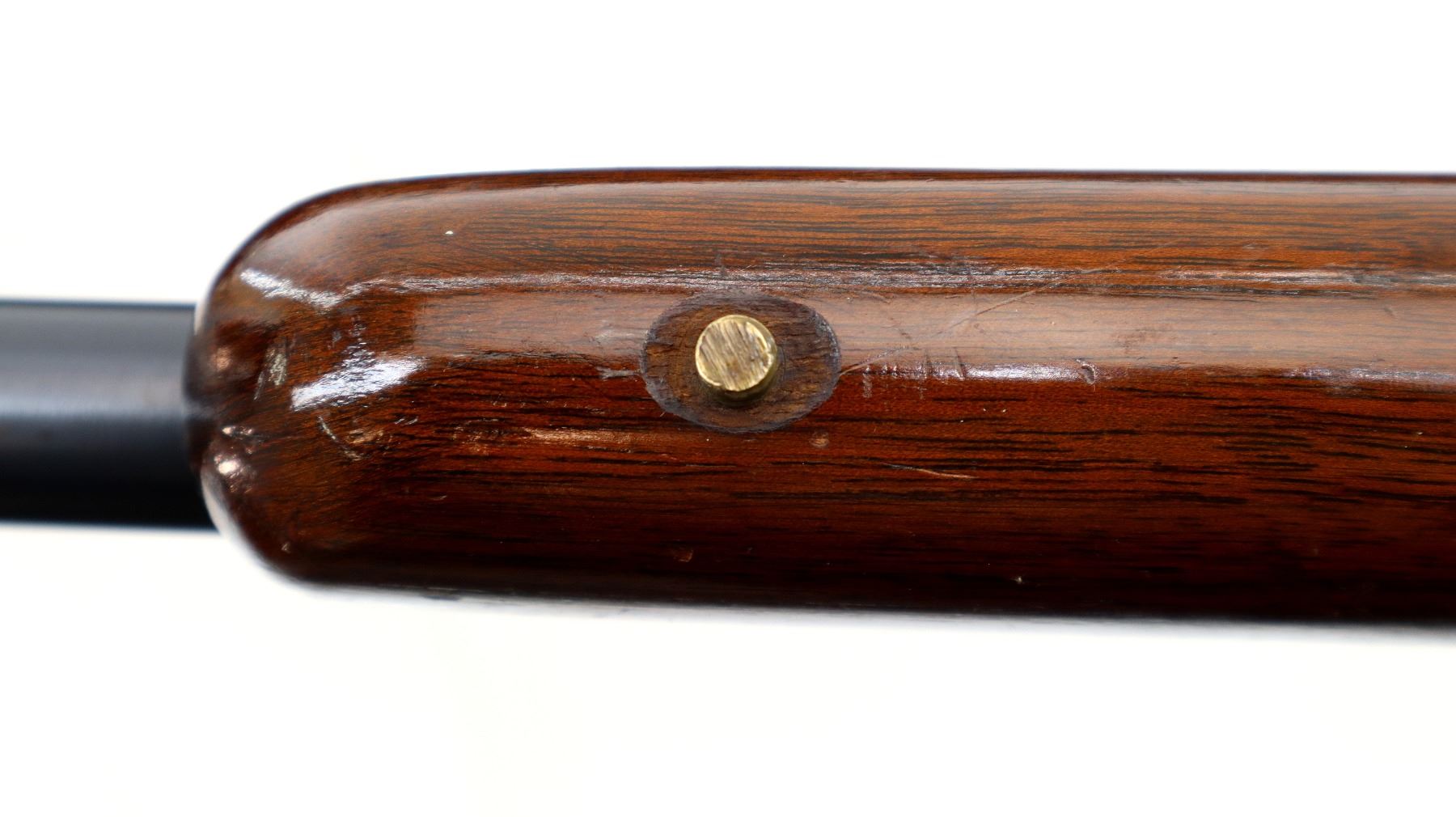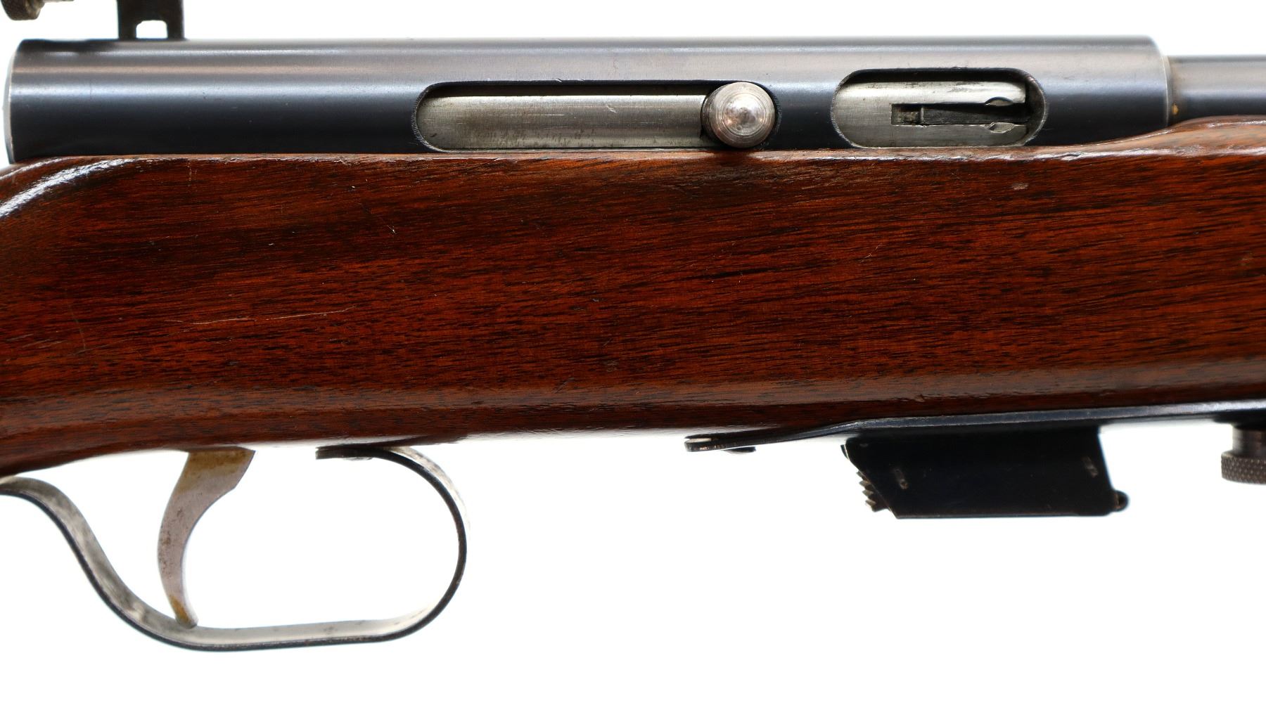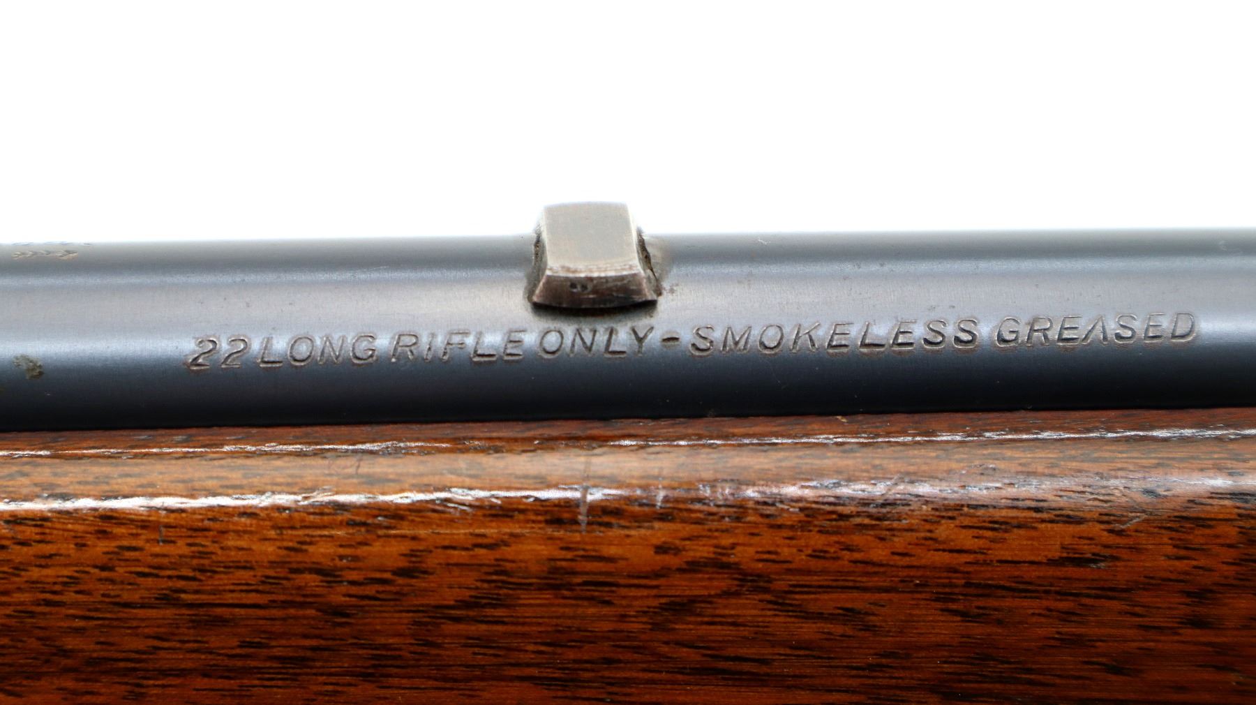 Main Description: Blade front sight, no rear sight slot filled with a blank, receiver has an adjustable peep sight installed with replaced adjustment screw, blued finish, small bolt knob. One piece wood stock, pistol grip, smooth black polymer butt plate, missing swivels rear hole present front threaded stud.