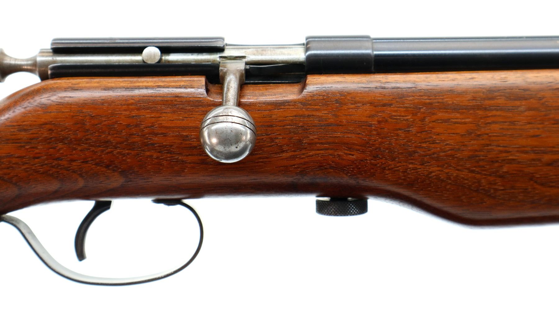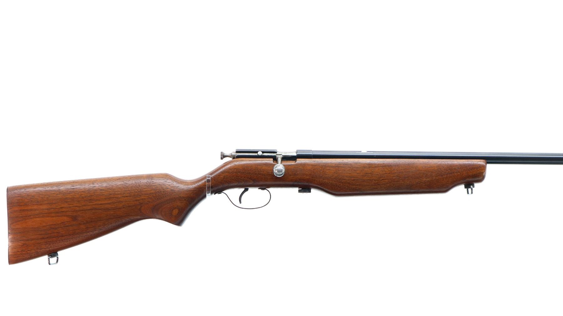 Main Description: Missing front and rear sights dovetails present, blued finish, grooved bolt knob, extractor is present. One piece wood stock, pistol grip, smooth steel butt plate, sling swivels.
