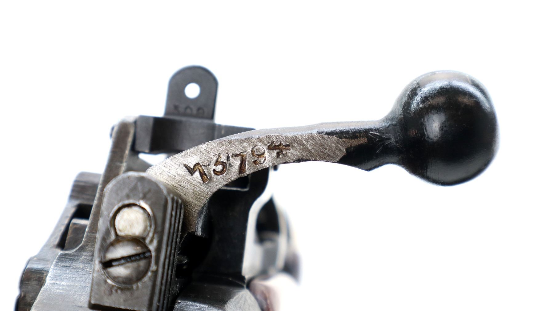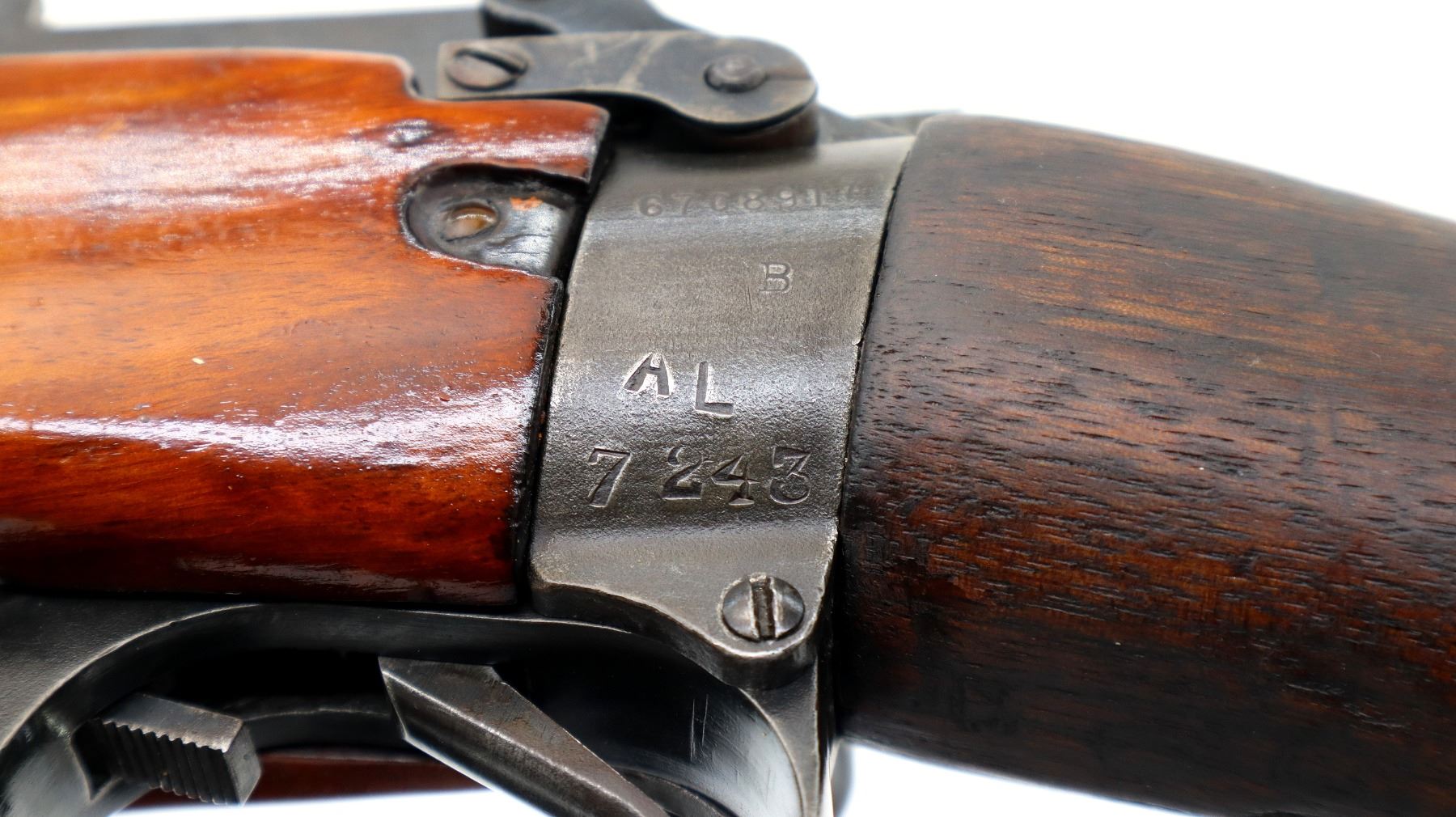 Main Description: Manufactured by Savage, bolt mismatched. Blade front sight with ramp, adjustable peep sight with second modified notch, blued finish. Three piece sporterized wood stocks, custom handguard band, pistol grip, smooth steel butt plate with trap, arsenal repair at heel, rear sling swivel base only.