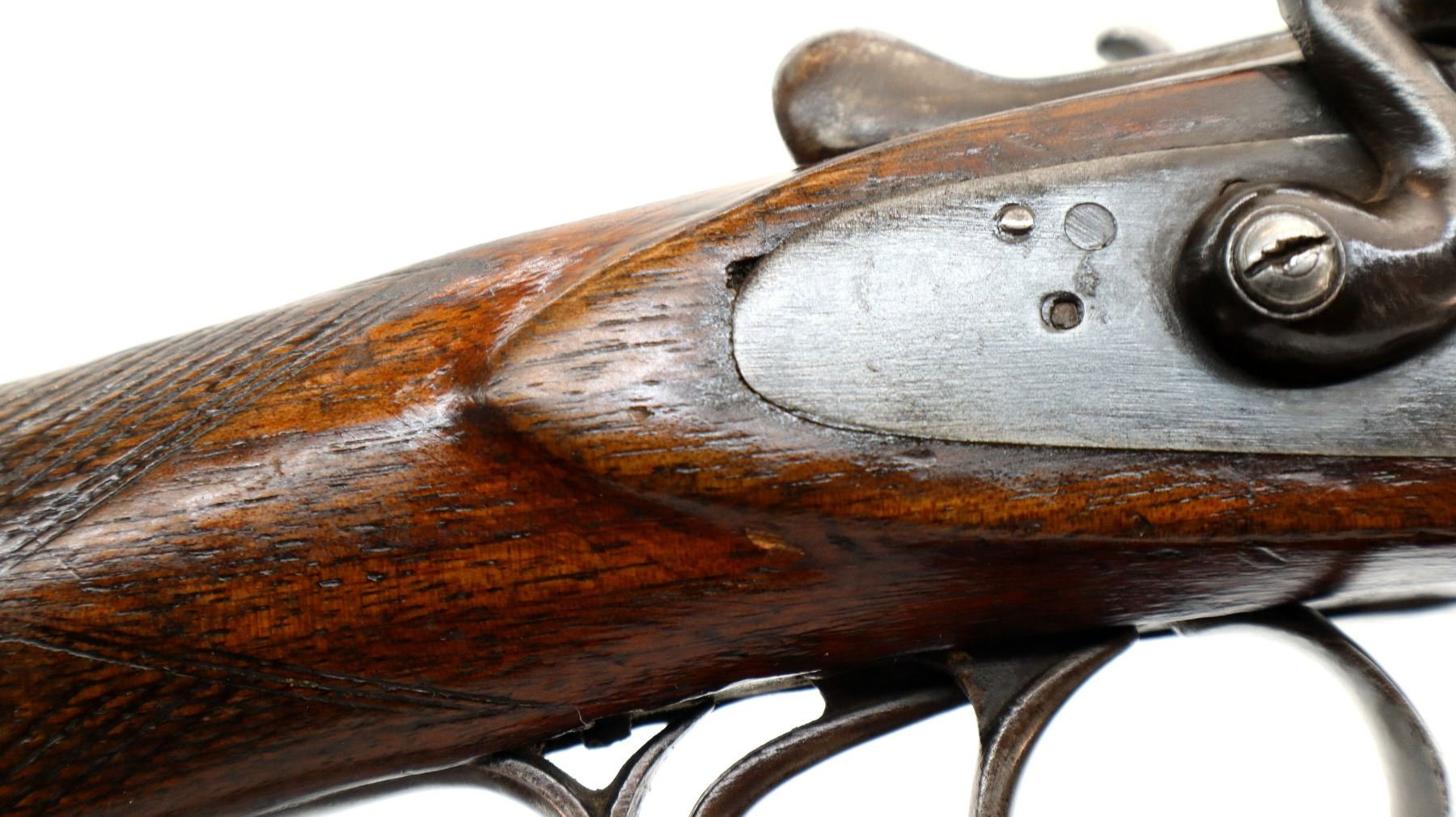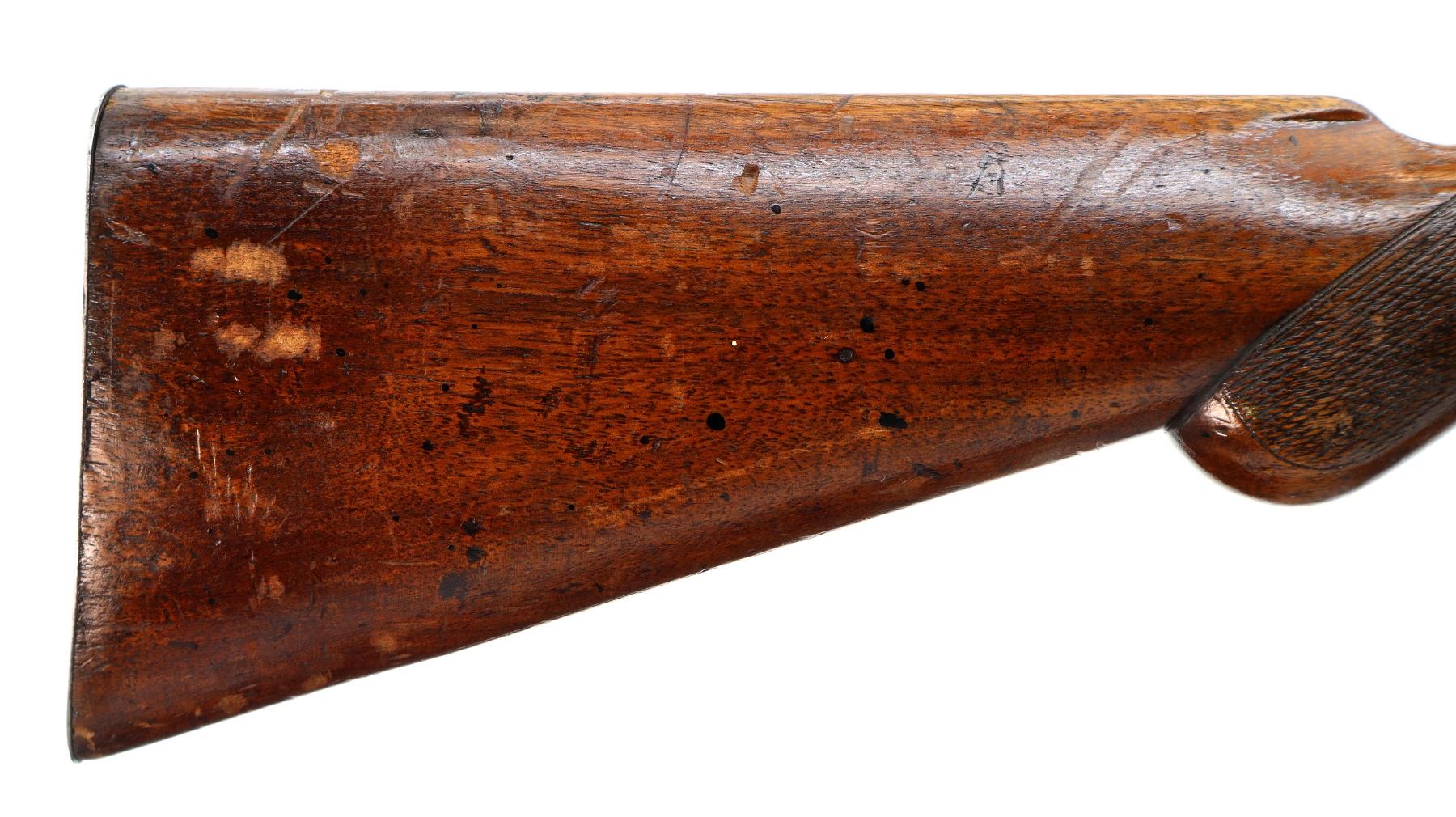 Main Description: Brass bead, Government twist barrels with smooth rib that are loose on face, side locks with checkered spur hammers that function, extractor, double triggers. Two piece wood stocks, checkered forearm and pistol grip chipped and cracked behind receiver and locks, grooved steel butt plate.