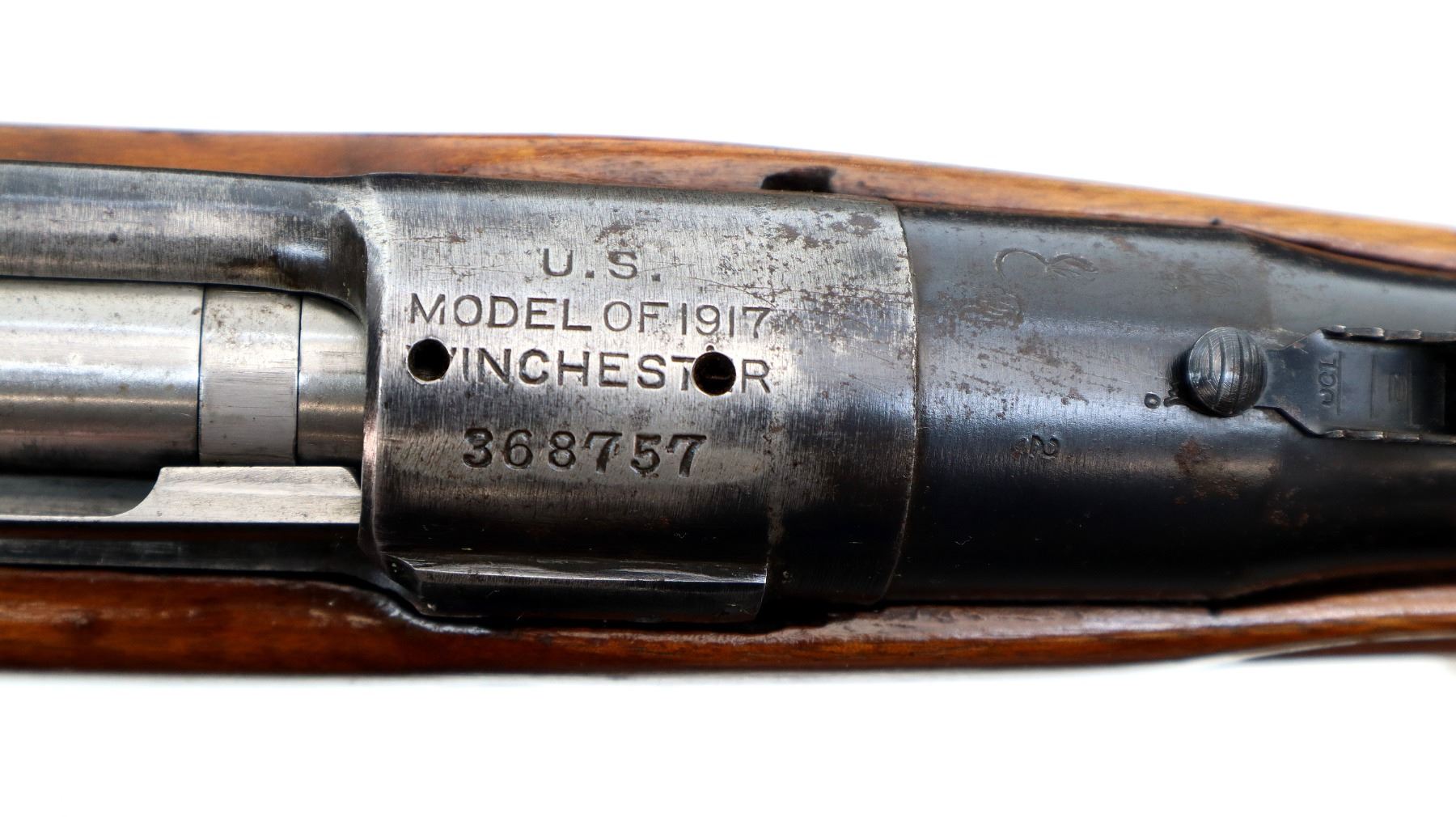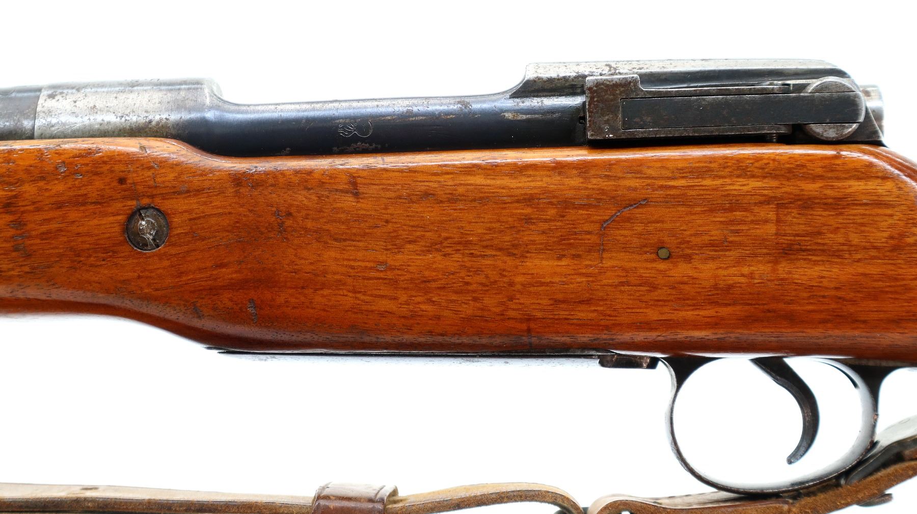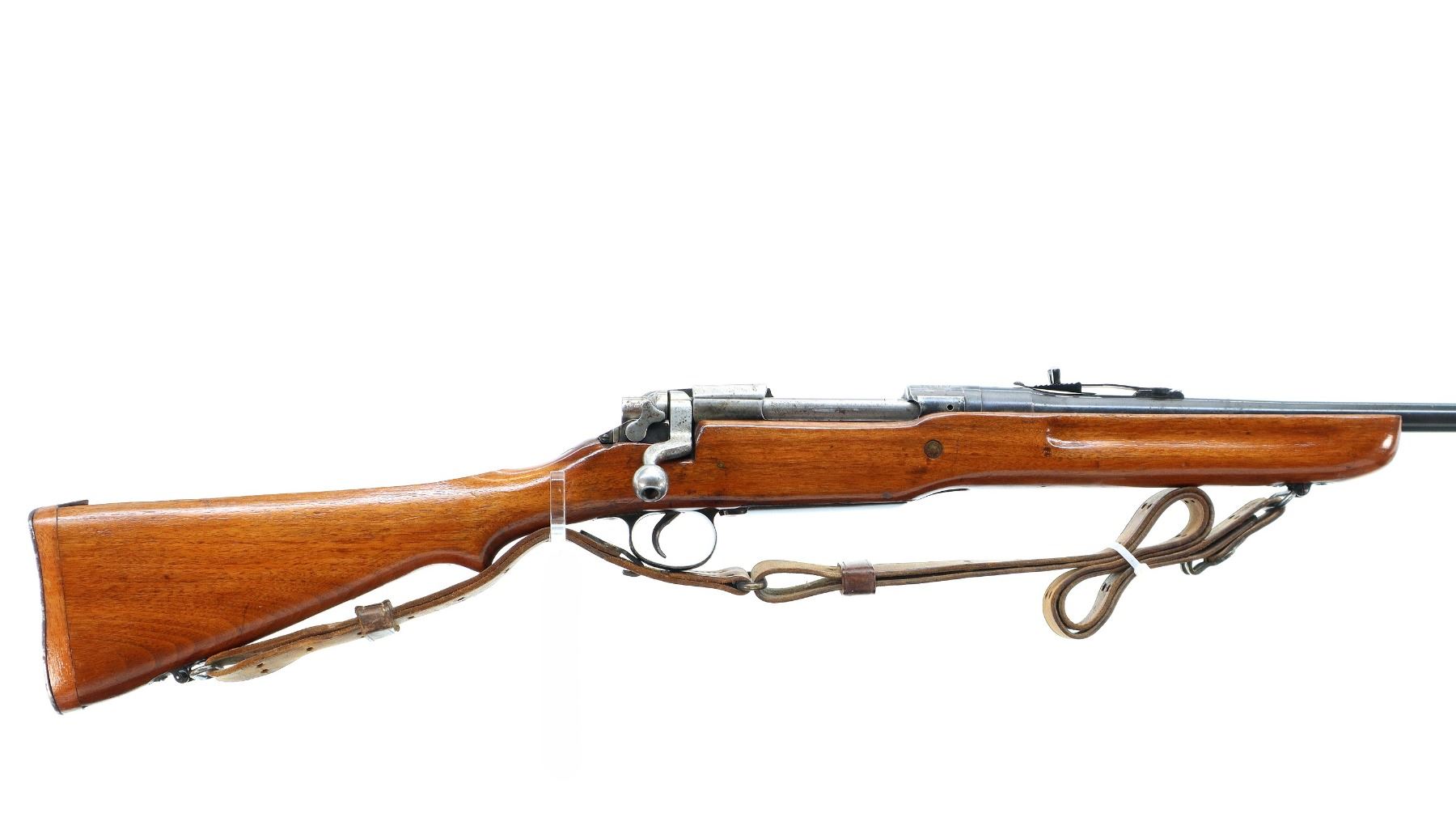 Main Description: Manufactured by Winchester. Blade front sight with ramp, adjustable u notched rear sight, blued finish, receiver drilled and tapped with no plug screws installed. One piece sporterized wood stock, forend tip is cracked, finger grooves, pistol grip cracked behind receiver, stock comb has been flattened, smooth steel butt plate with trap and wood spacer. Sling swivels with US P1907 leather sling.
