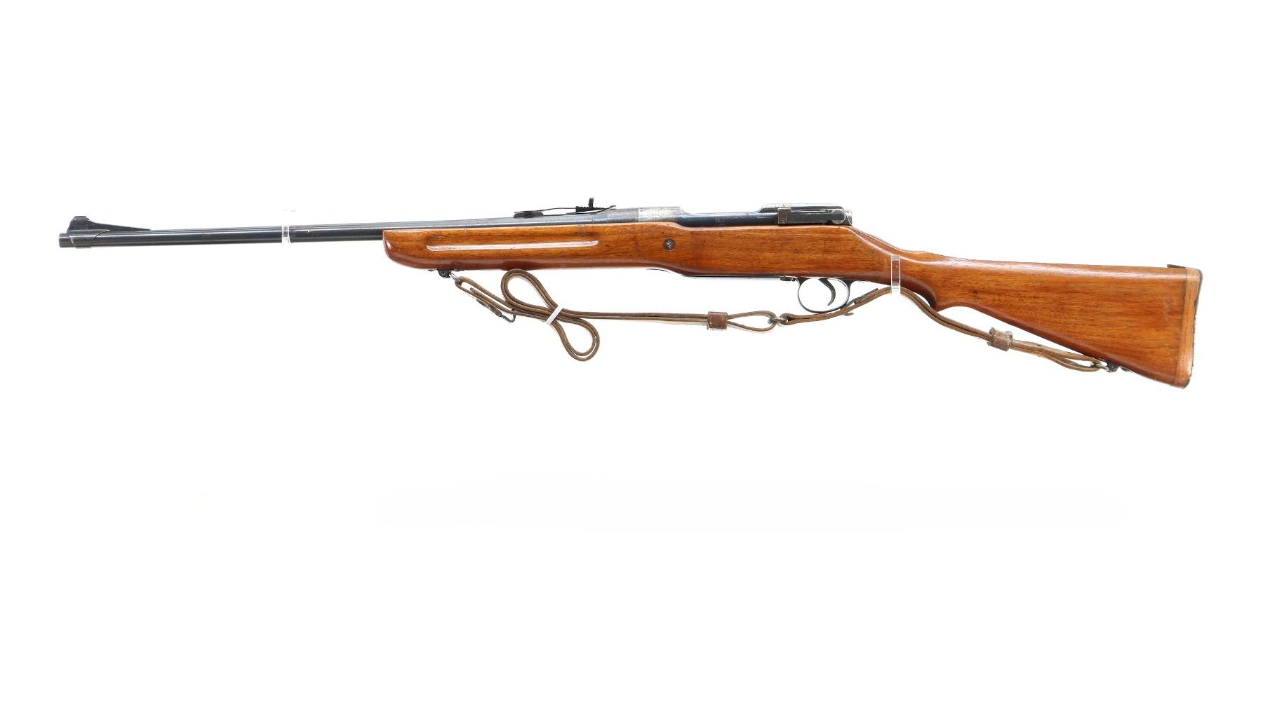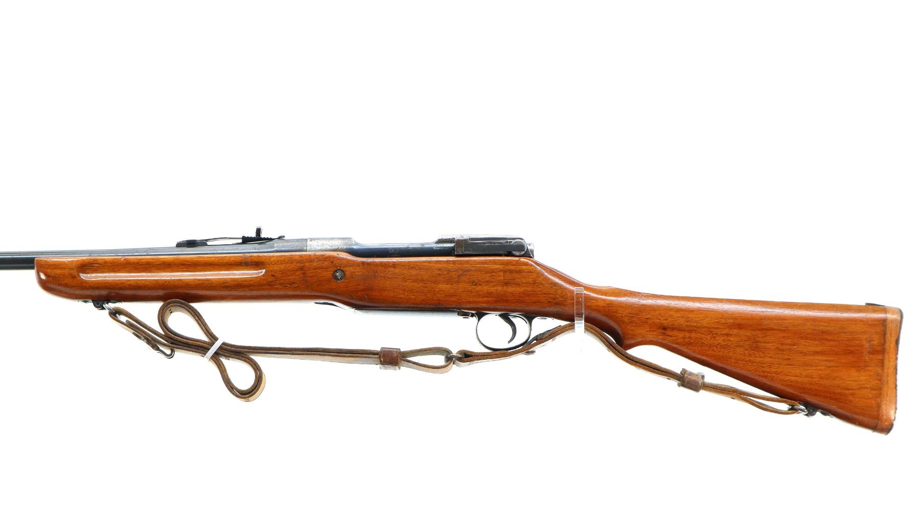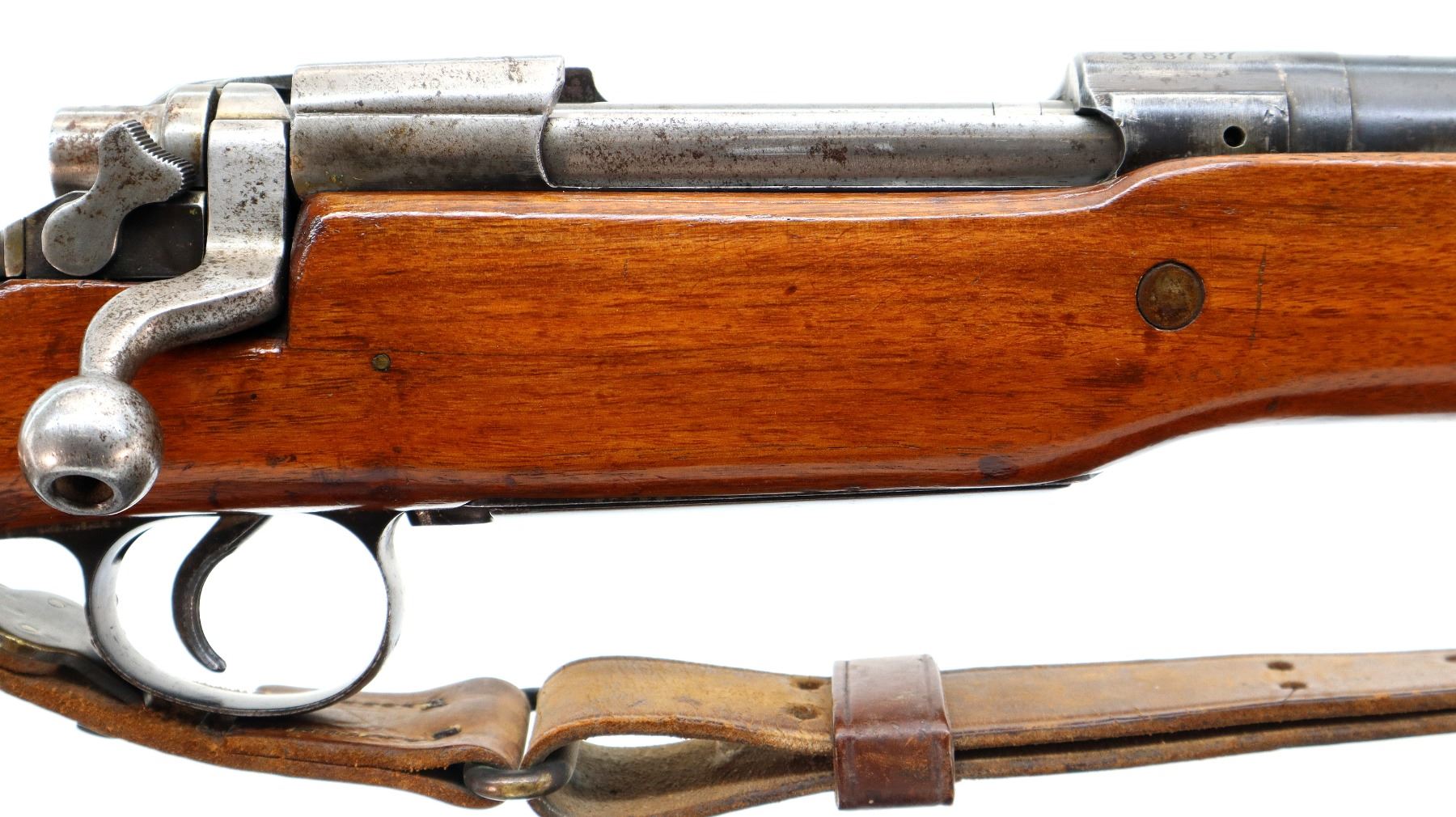 Main Description: Manufactured by Winchester. Blade front sight with ramp, adjustable u notched rear sight, blued finish, receiver drilled and tapped with no plug screws installed. One piece sporterized wood stock, forend tip is cracked, finger grooves, pistol grip cracked behind receiver, stock comb has been flattened, smooth steel butt plate with trap and wood spacer. Sling swivels with US P1907 leather sling.