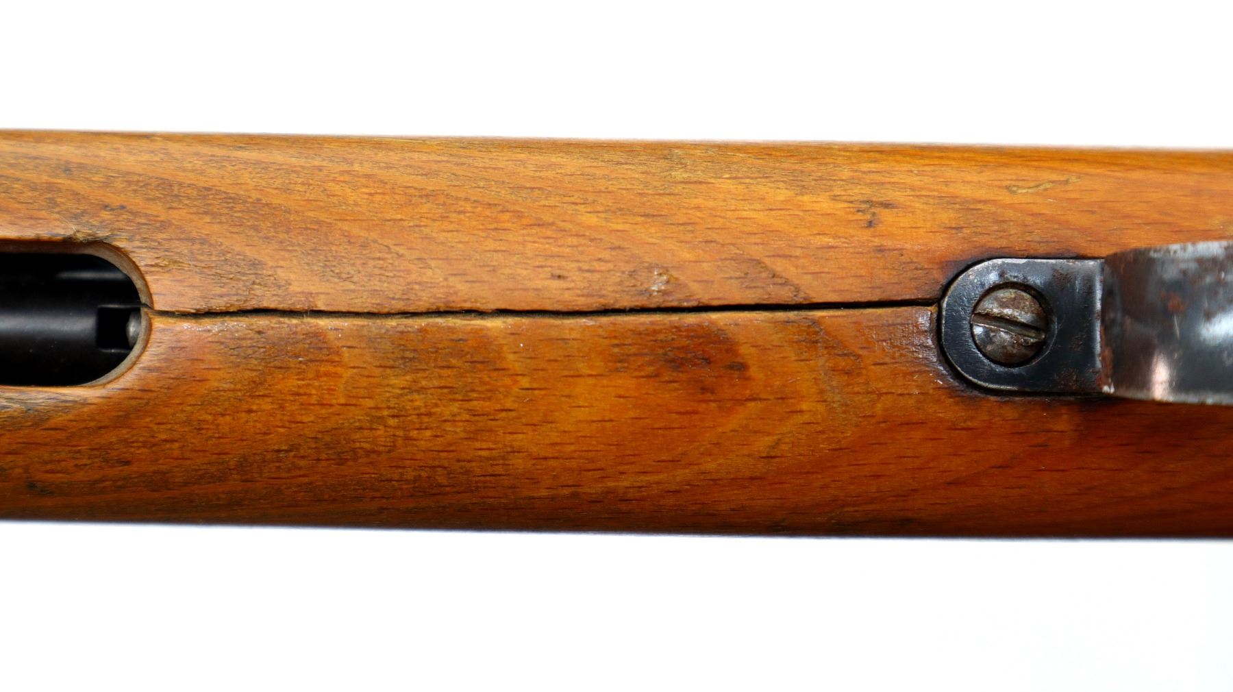 Main Description: Blade front sight, adjustable u notched rear sight, blued finish. One piece wood stock, finger grooved forearm, pistol grip, stock is cracked behind receiver in front and behind trigger guard, grooved butt.