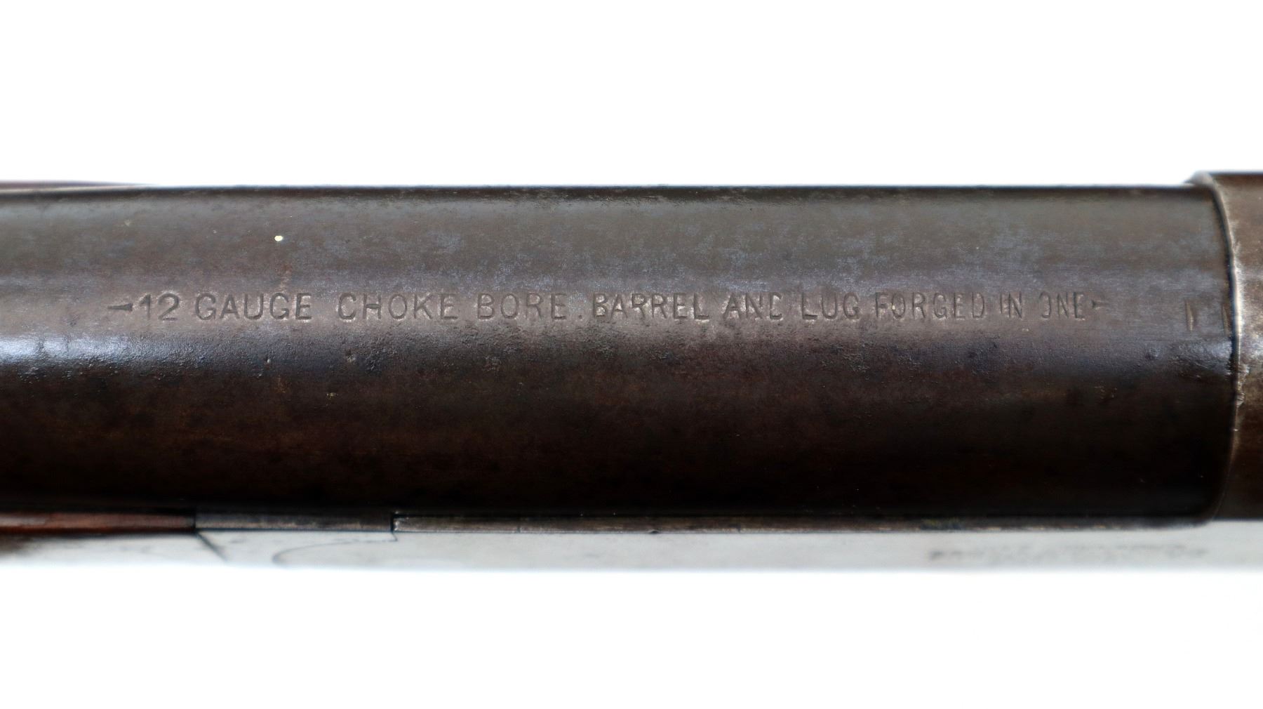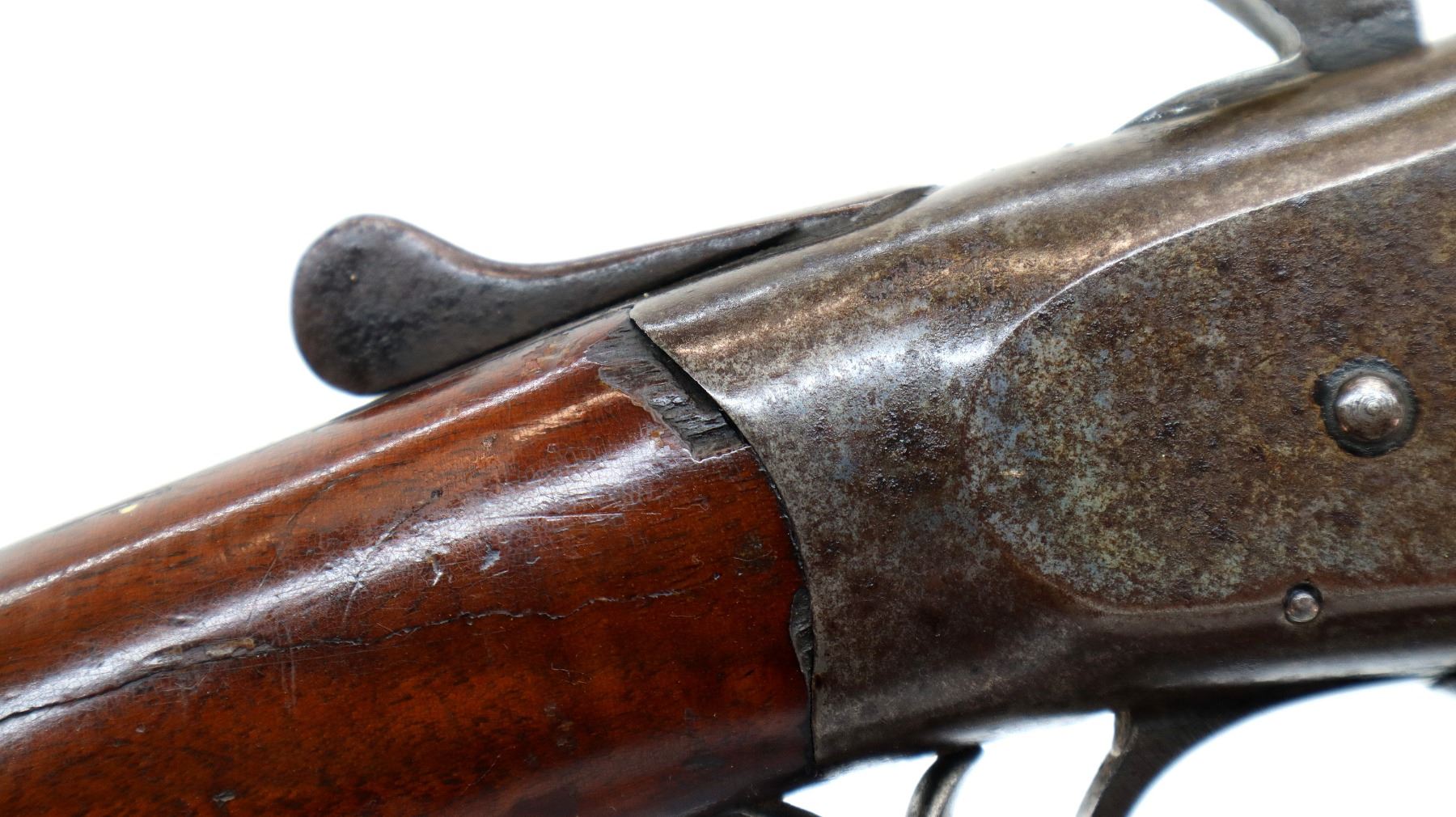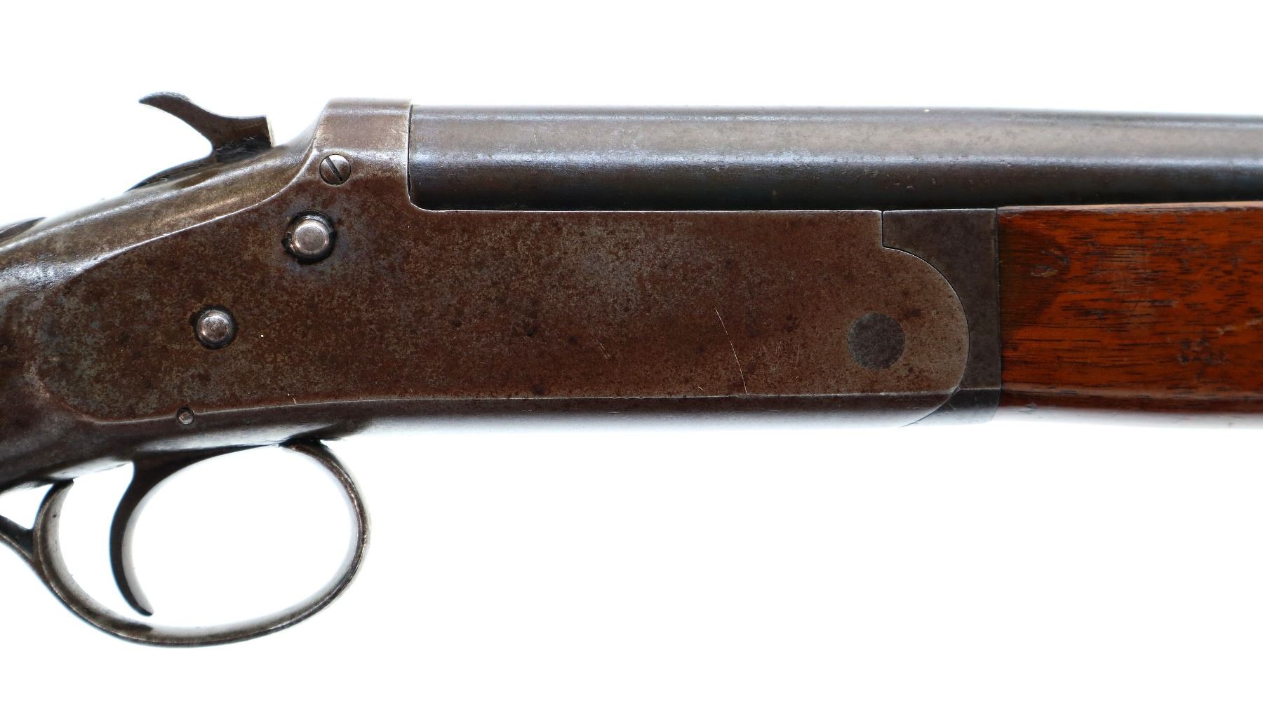 Main Description: Silver bead, blued finish, checkered spur hammer, extractor. Two piece wood stocks, pistol grip chipped and cracked behind receiver and upper tang, black polymer butt plate with one extra hole, stock chipped along bottom edge.