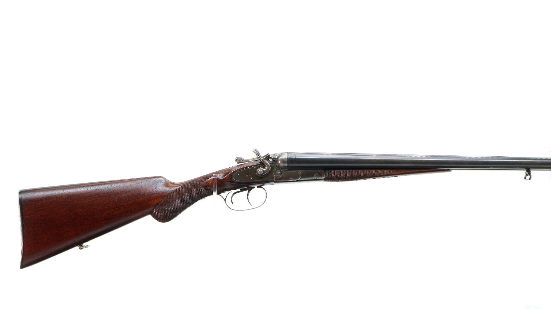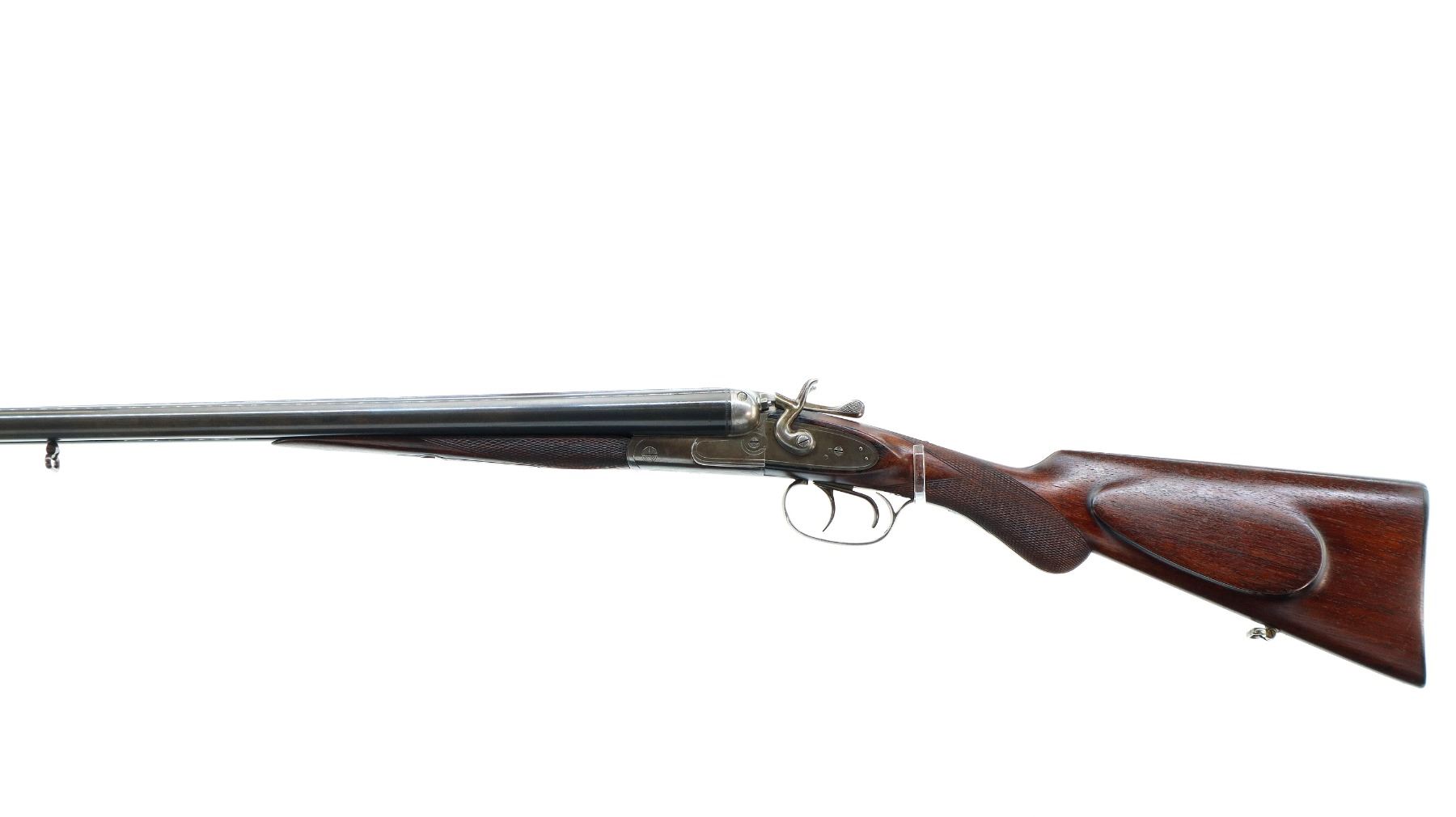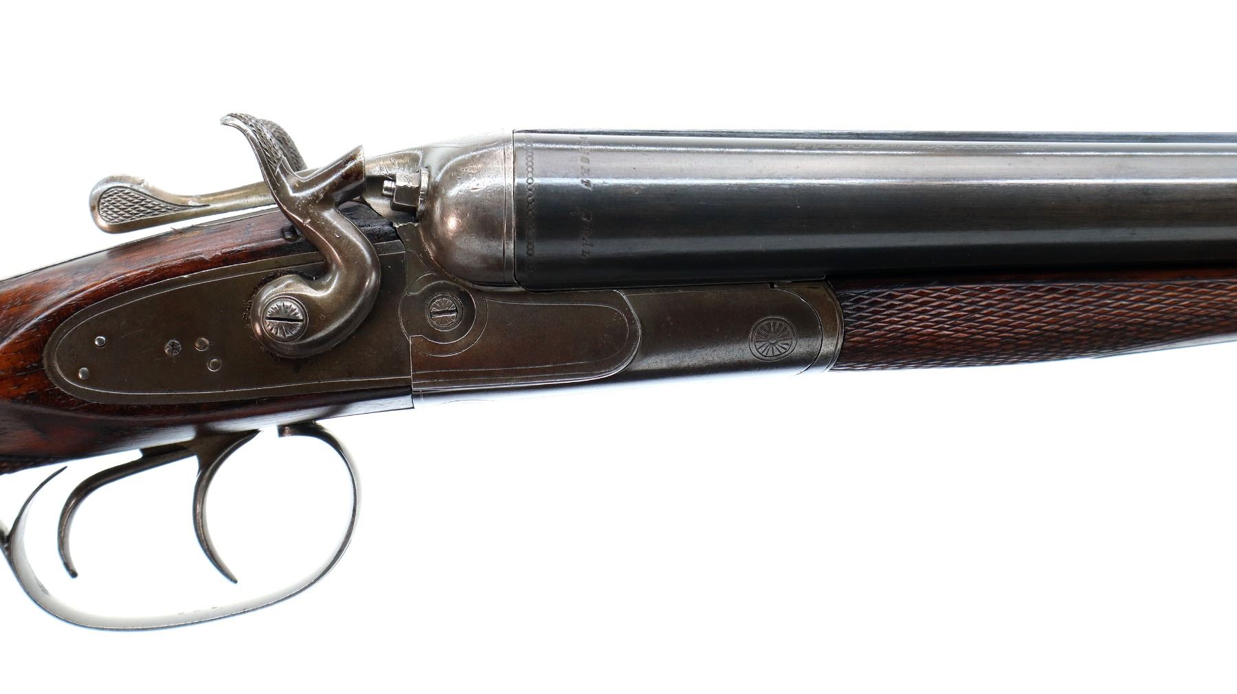 Main Description: Brass bead, blued barrels with raised rib, silver receiver with side locks, checkered spur hammers that function, extractor, double triggers. Two piece wood stocks, checkered forearm and pistol grip, European cheek rest, grooved black polymer butt plate, sling swivels.