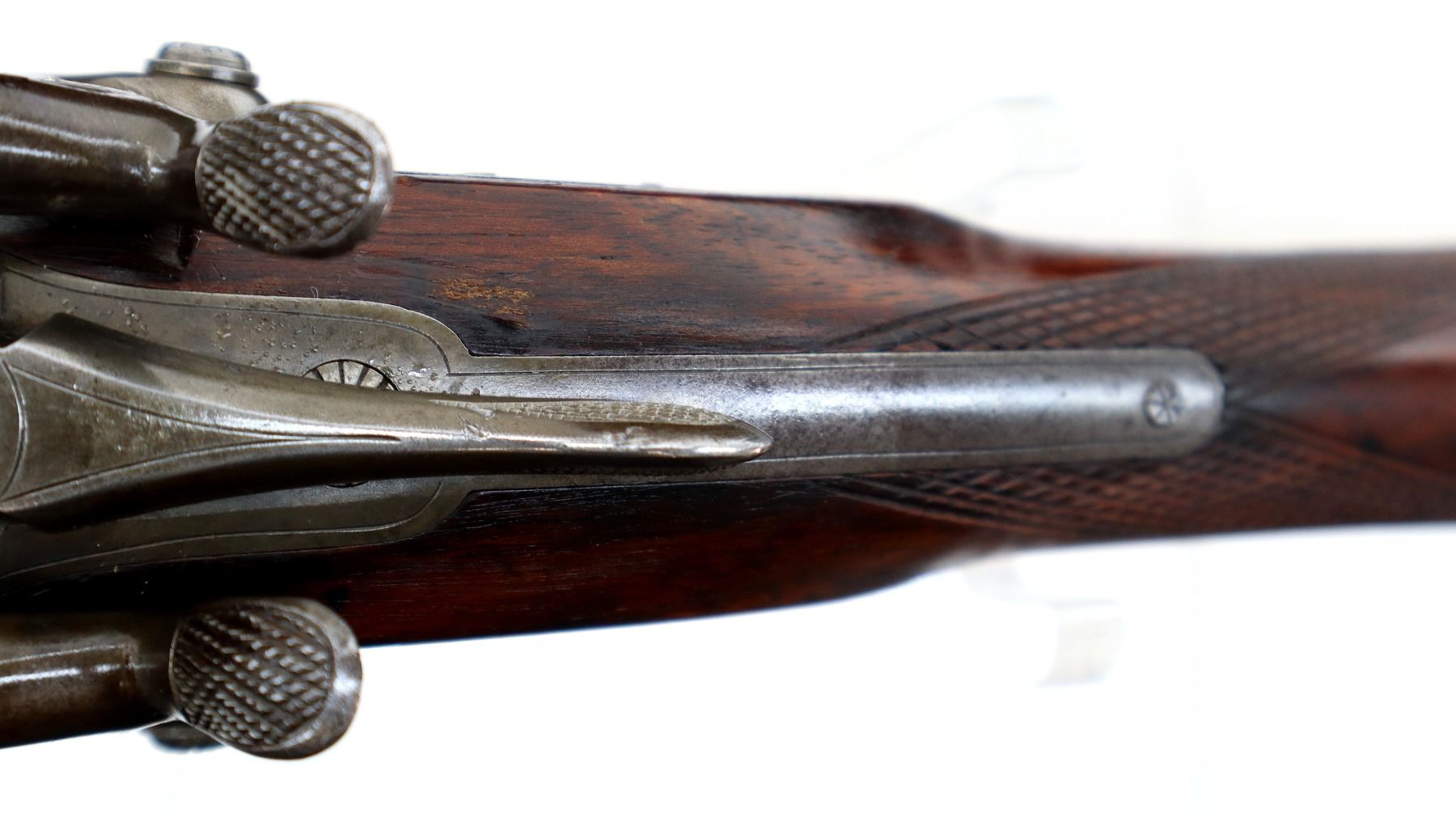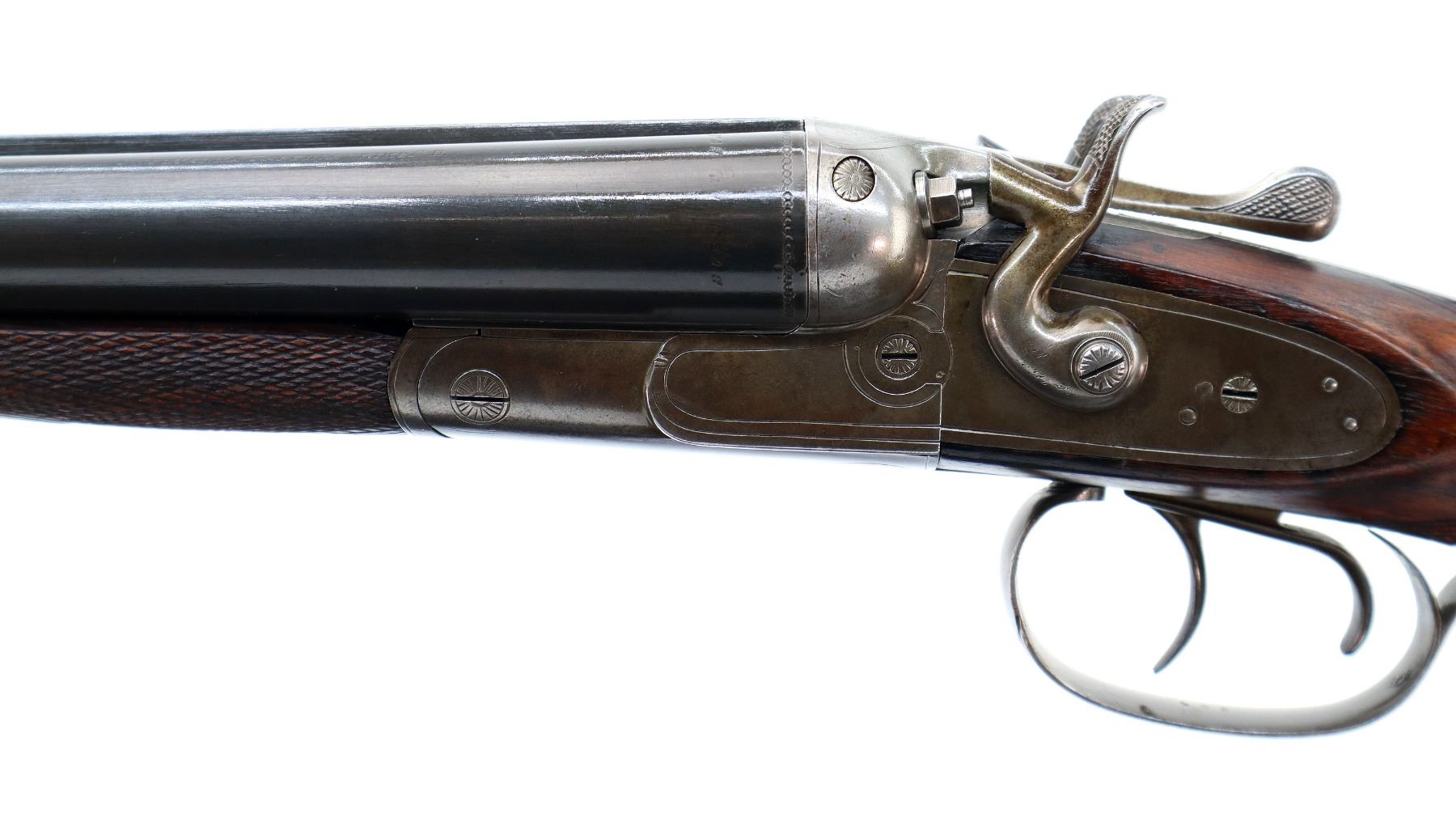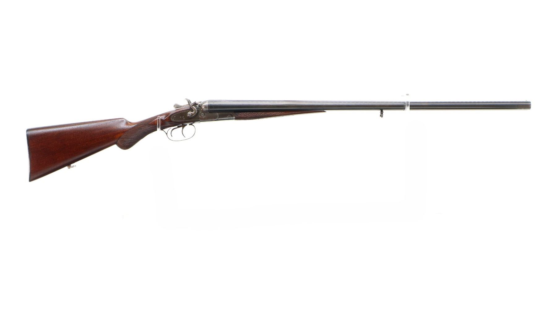Main Description: Brass bead, blued barrels with raised rib, silver receiver with side locks, checkered spur hammers that function, extractor, double triggers. Two piece wood stocks, checkered forearm and pistol grip, European cheek rest, grooved black polymer butt plate, sling swivels.