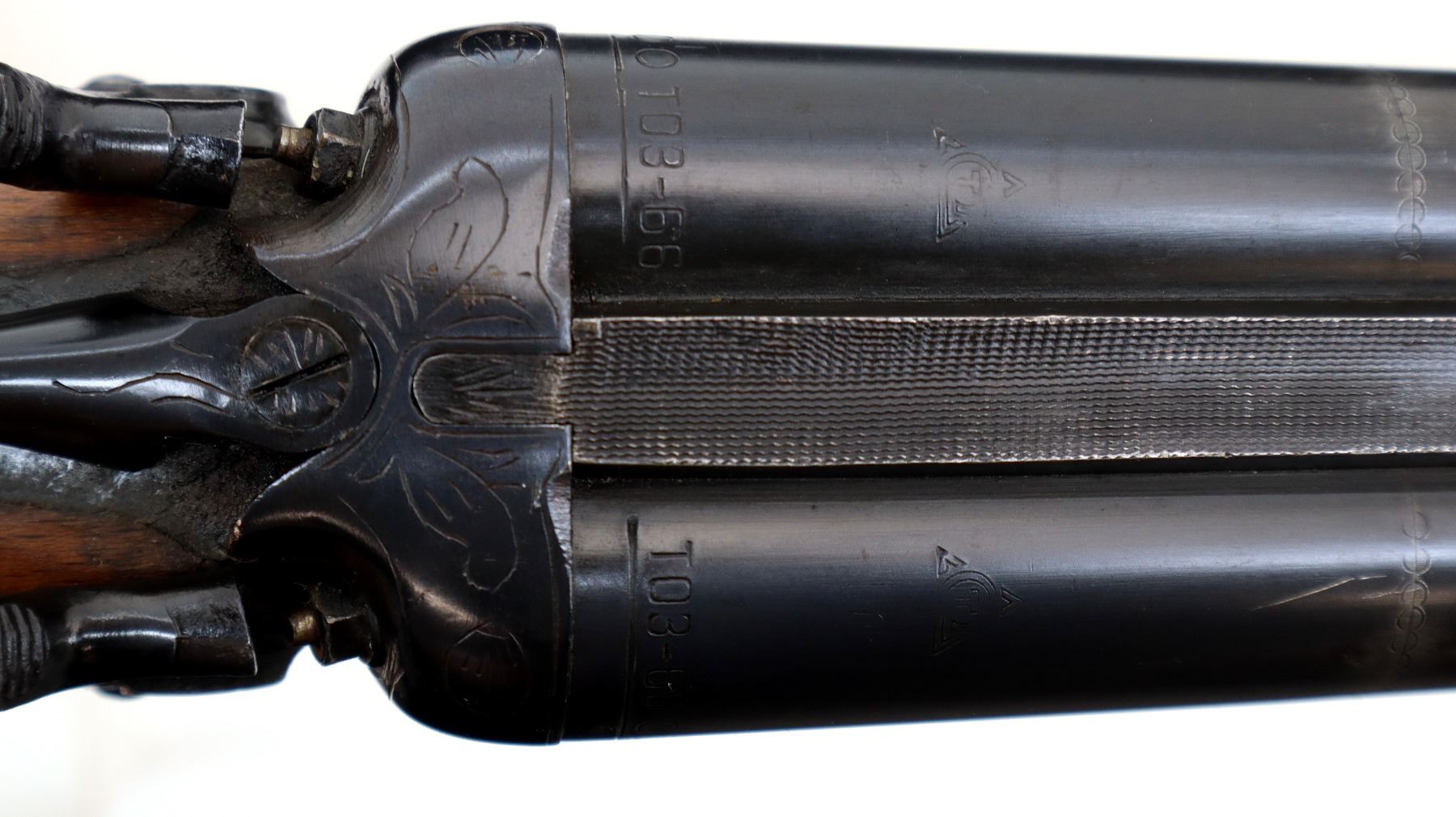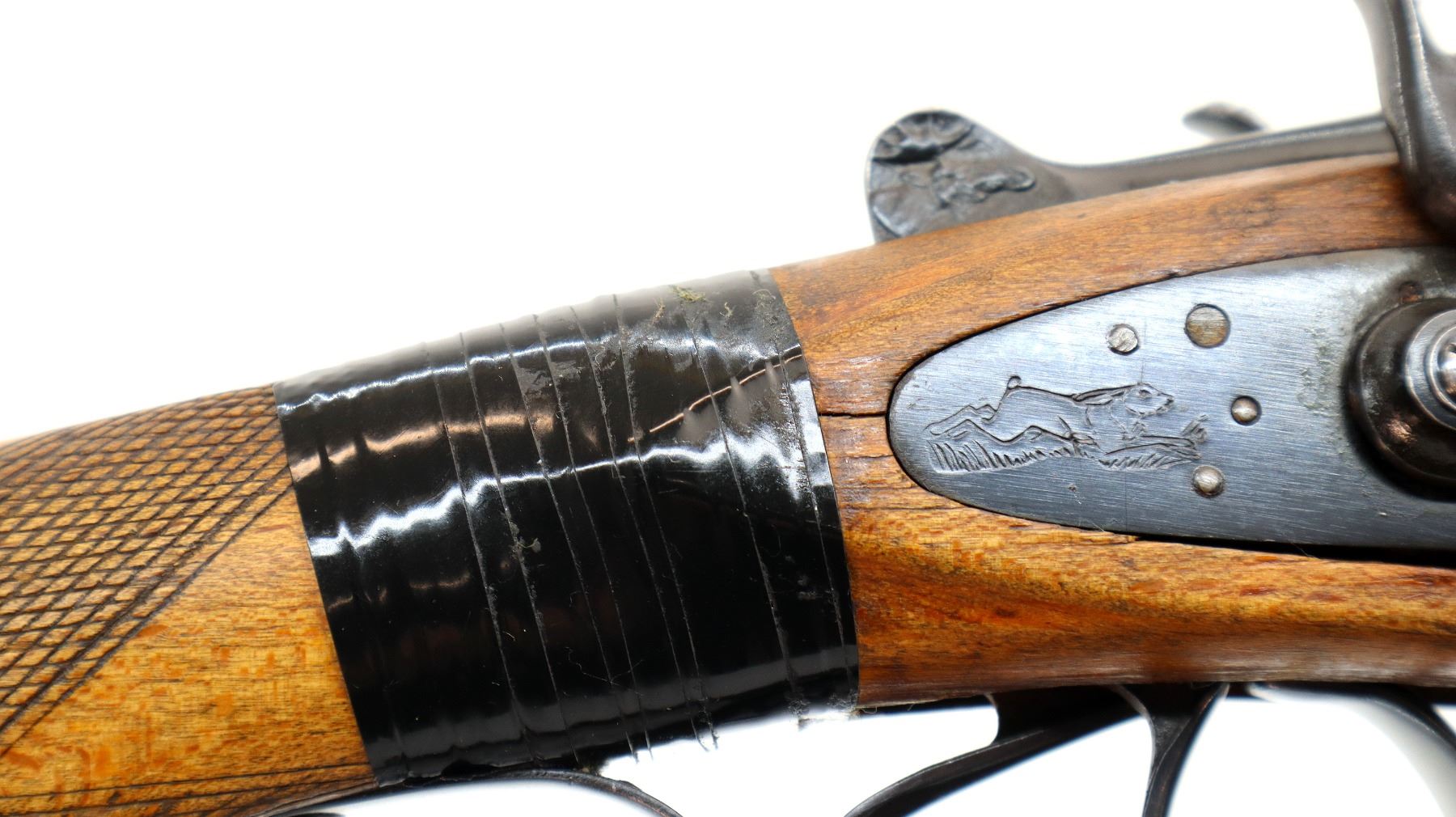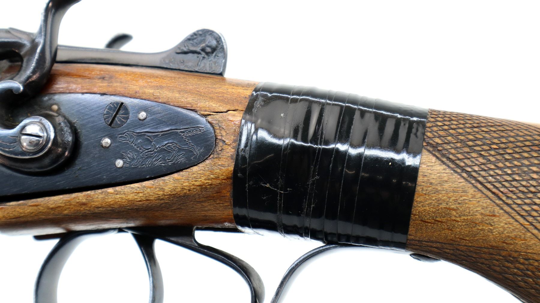Main Description: Brass bead, blued finish, raised rib, engraved receiver and side locks with grooved spur hammers that function, extractor, double triggers. Two piece wood stocks, checkered forearm and pistol grip, stock chipped, cracked and broken wrapped with black tape. Grooved red polymer butt plate, grip cap, sling swivels. Front swivel has a replaced screw