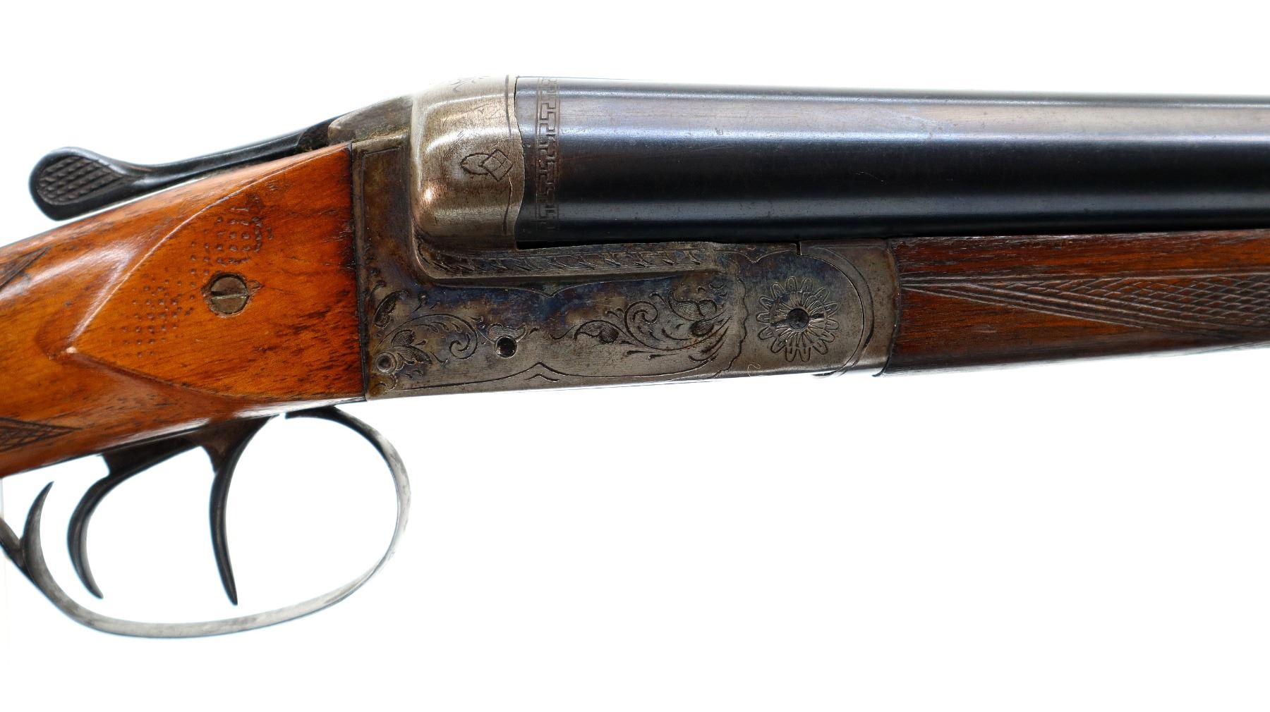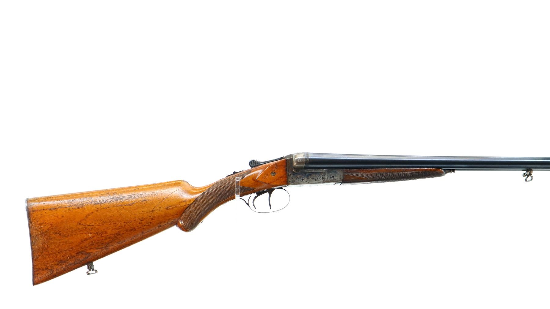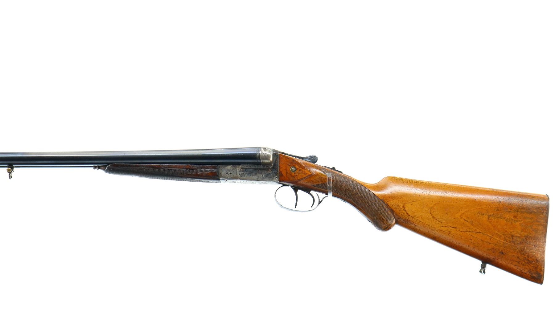 Main Description: Brass bead, blued barrels with grooved rib, engraved colour case hardened receiver, automatic safety, extractor, right side does not fire requires adjustment parts or repair, double triggers. Two piece wood stocks, checkered forearm and pistol grip cracked and repaired behind receiver, smooth steel butt plate, sling swivels, front one has a replaced screw.