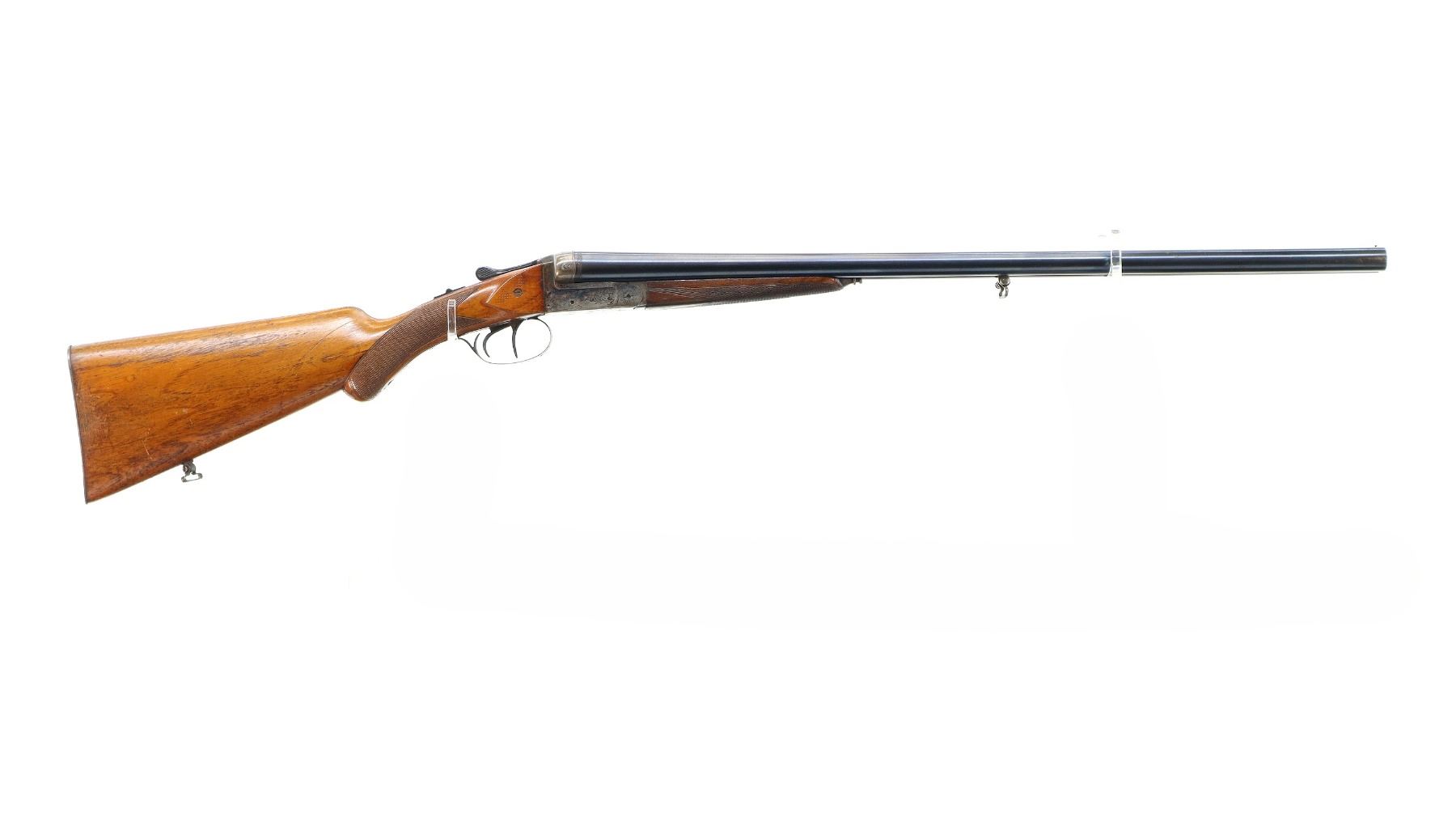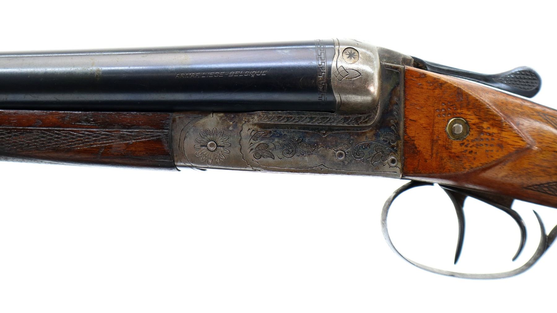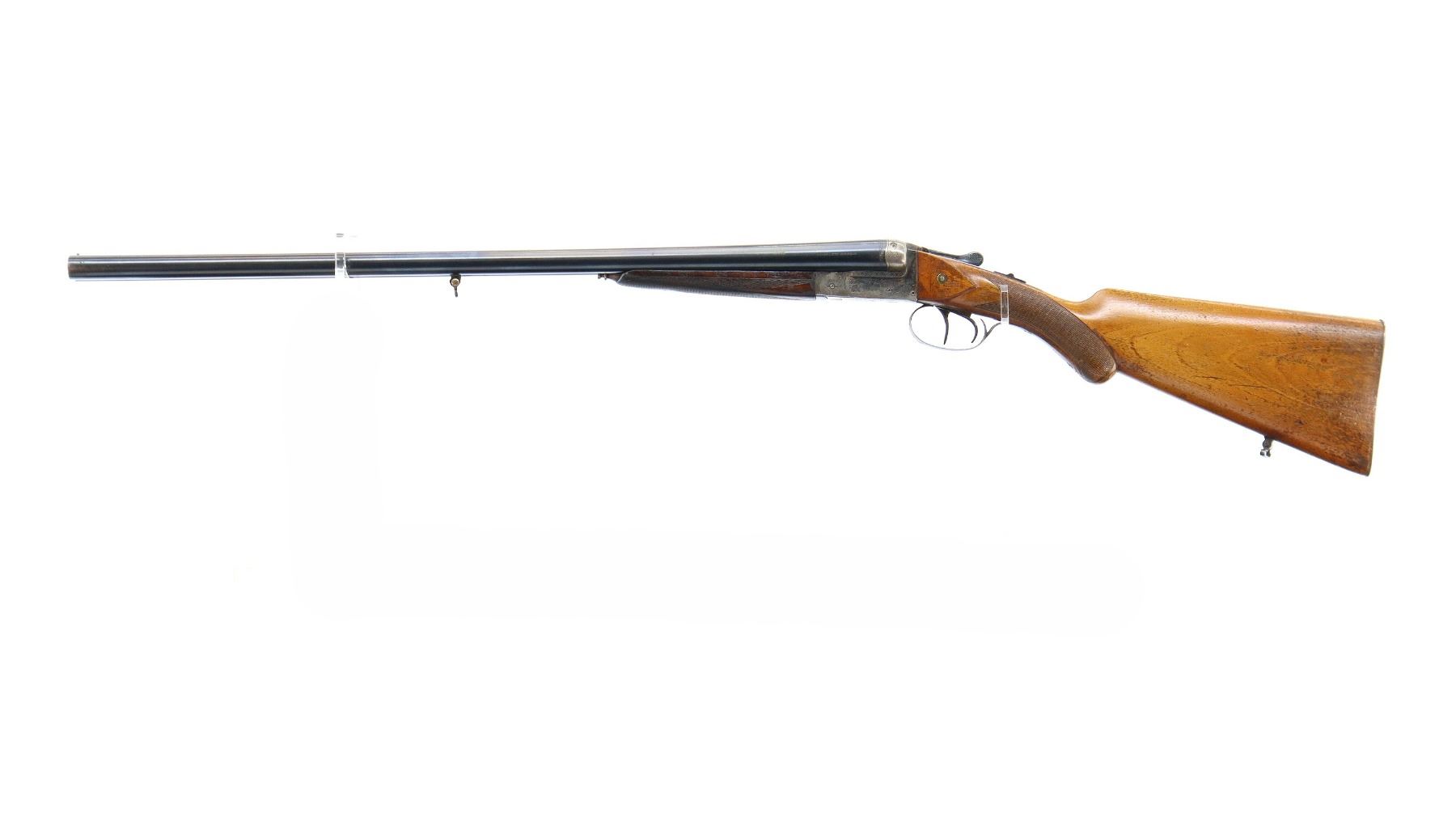 Main Description: Brass bead, blued barrels with grooved rib, engraved colour case hardened receiver, automatic safety, extractor, right side does not fire requires adjustment parts or repair, double triggers. Two piece wood stocks, checkered forearm and pistol grip cracked and repaired behind receiver, smooth steel butt plate, sling swivels, front one has a replaced screw.