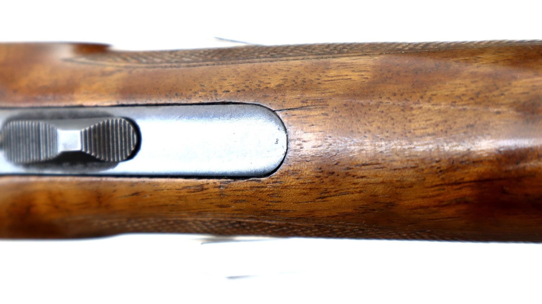 Main Description: Blade front sight, adjustable u notched rear sight, blued finish, solid rib with integral scope rail at rear, automatic safety, extractor, double triggers. Two piece wood stocks, checkered forearm and pistol grip, European cheek rest, missing butt plate and screws, 14" LOP, grip cap, missing rear swivel hole is present, has the front swivel stud.
