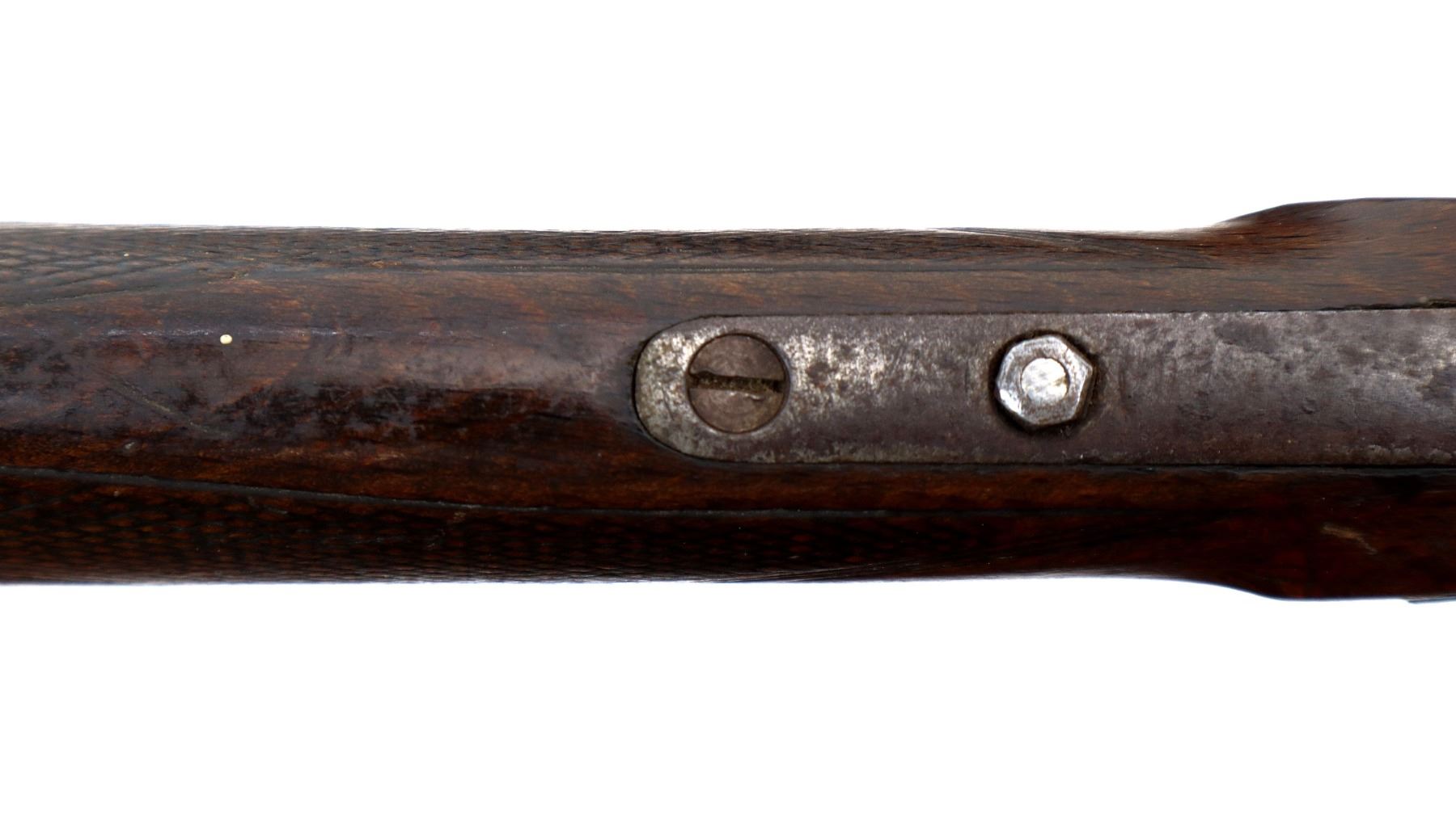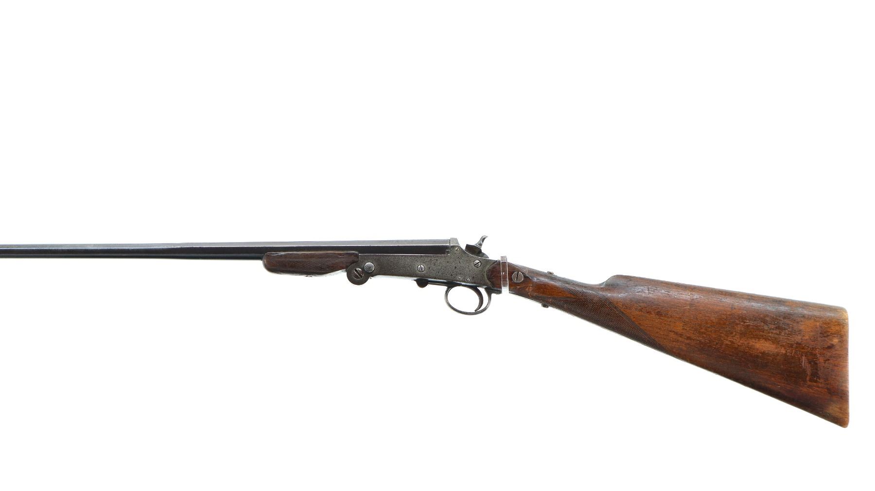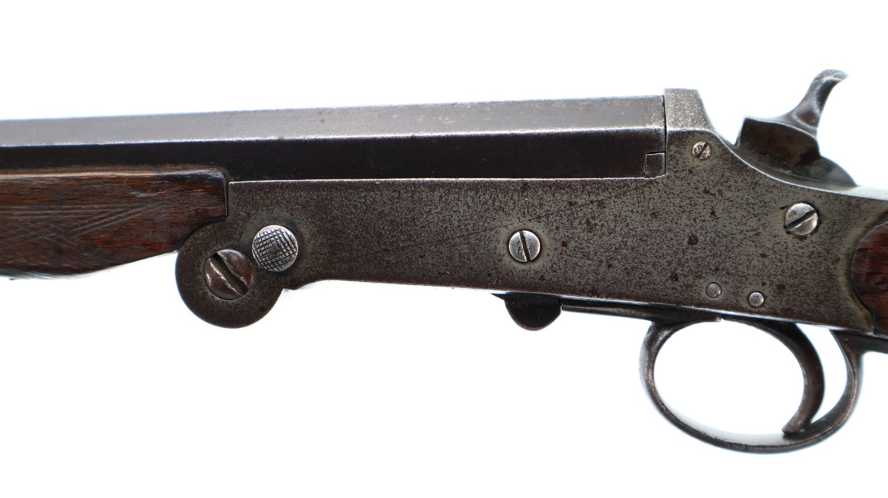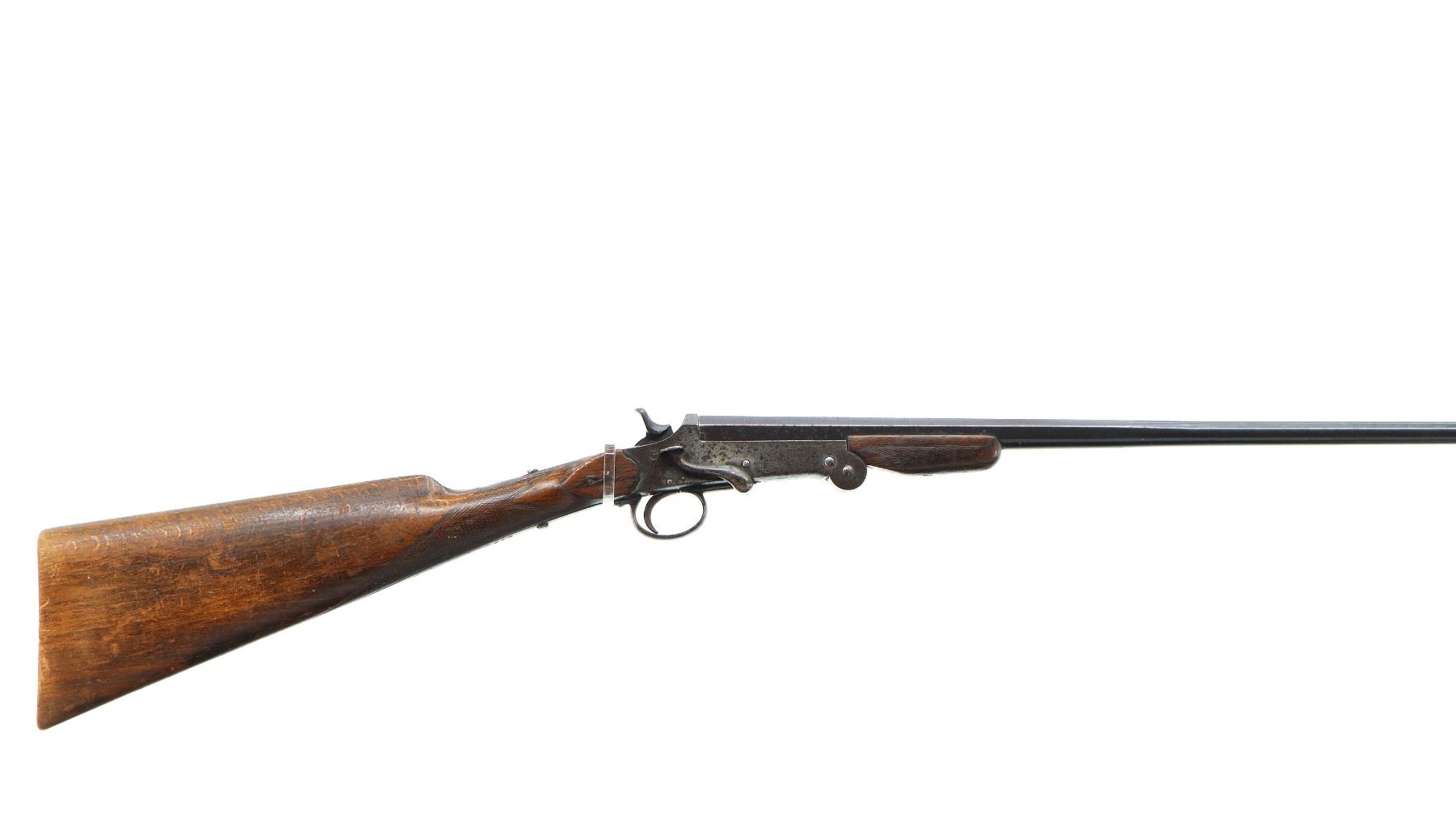 Main Description: Replaced bead, blued finish, checkered spur hammer and opening lever, extractor. Two piece wood stocks, checkered forearm (chipped) and straight grip, cracked behind receiver, tang screw replaced, grooved butt small chip at toe.