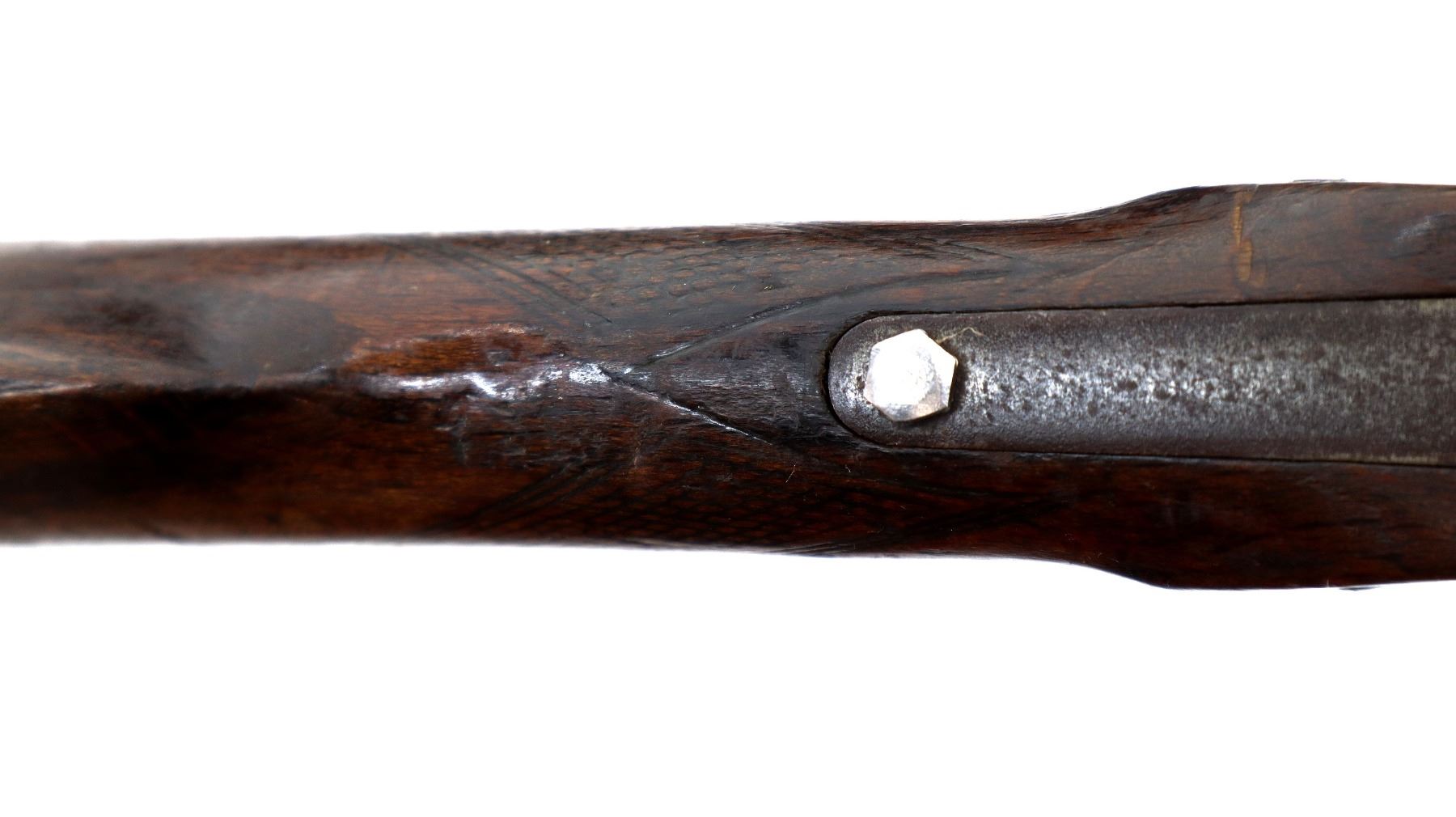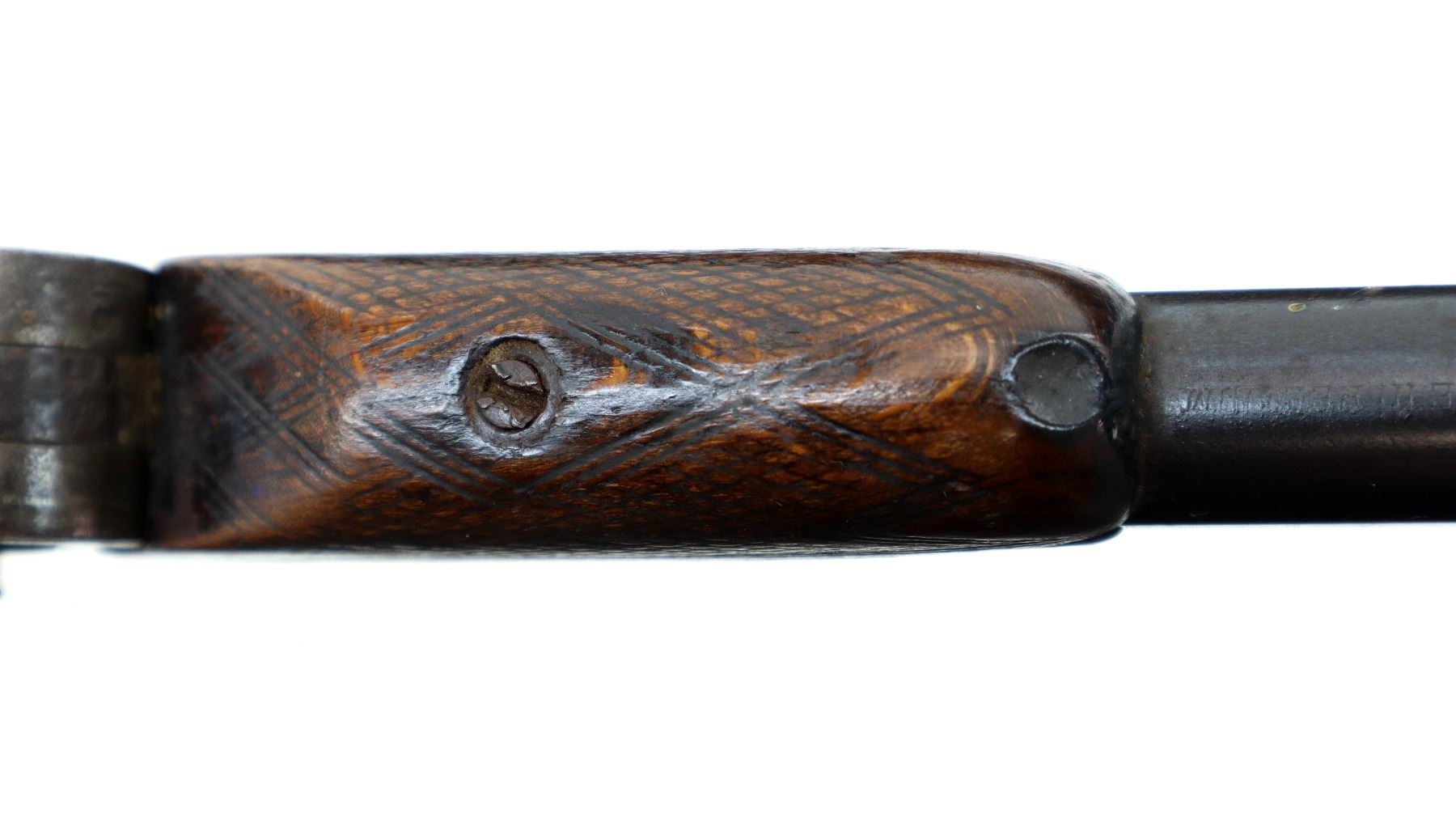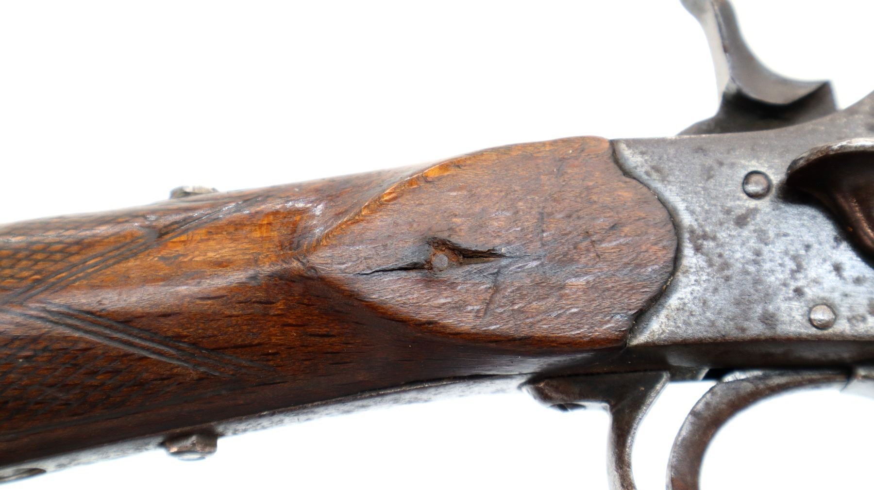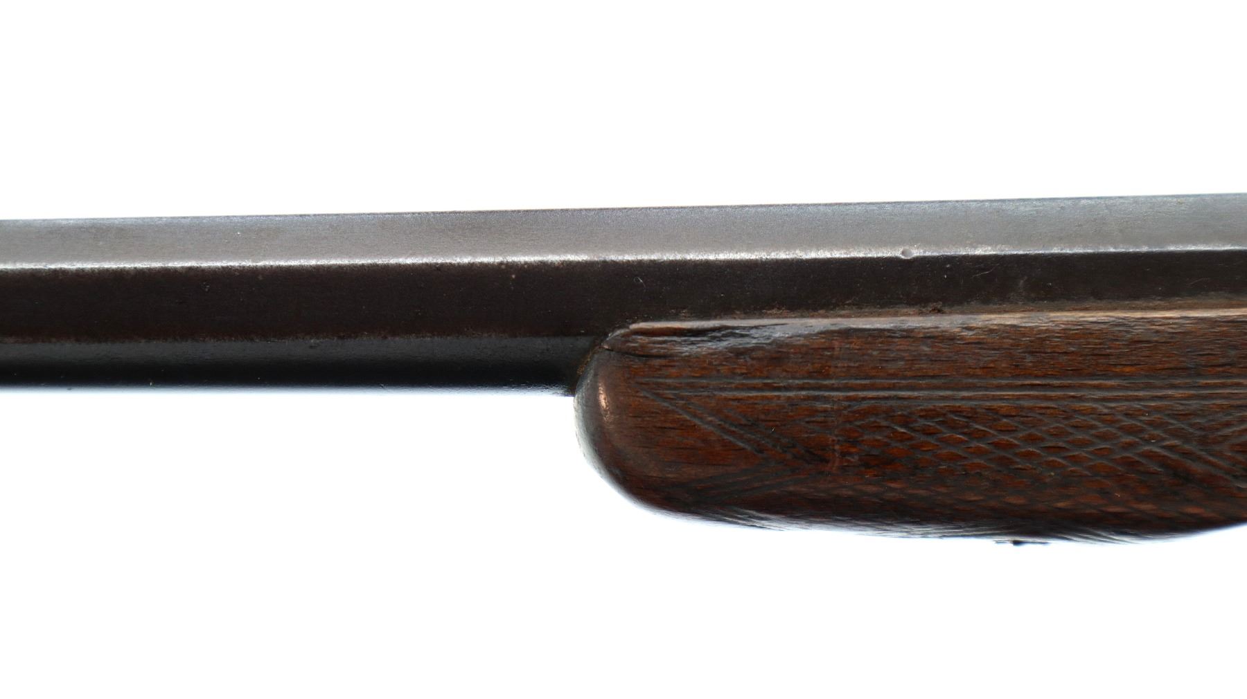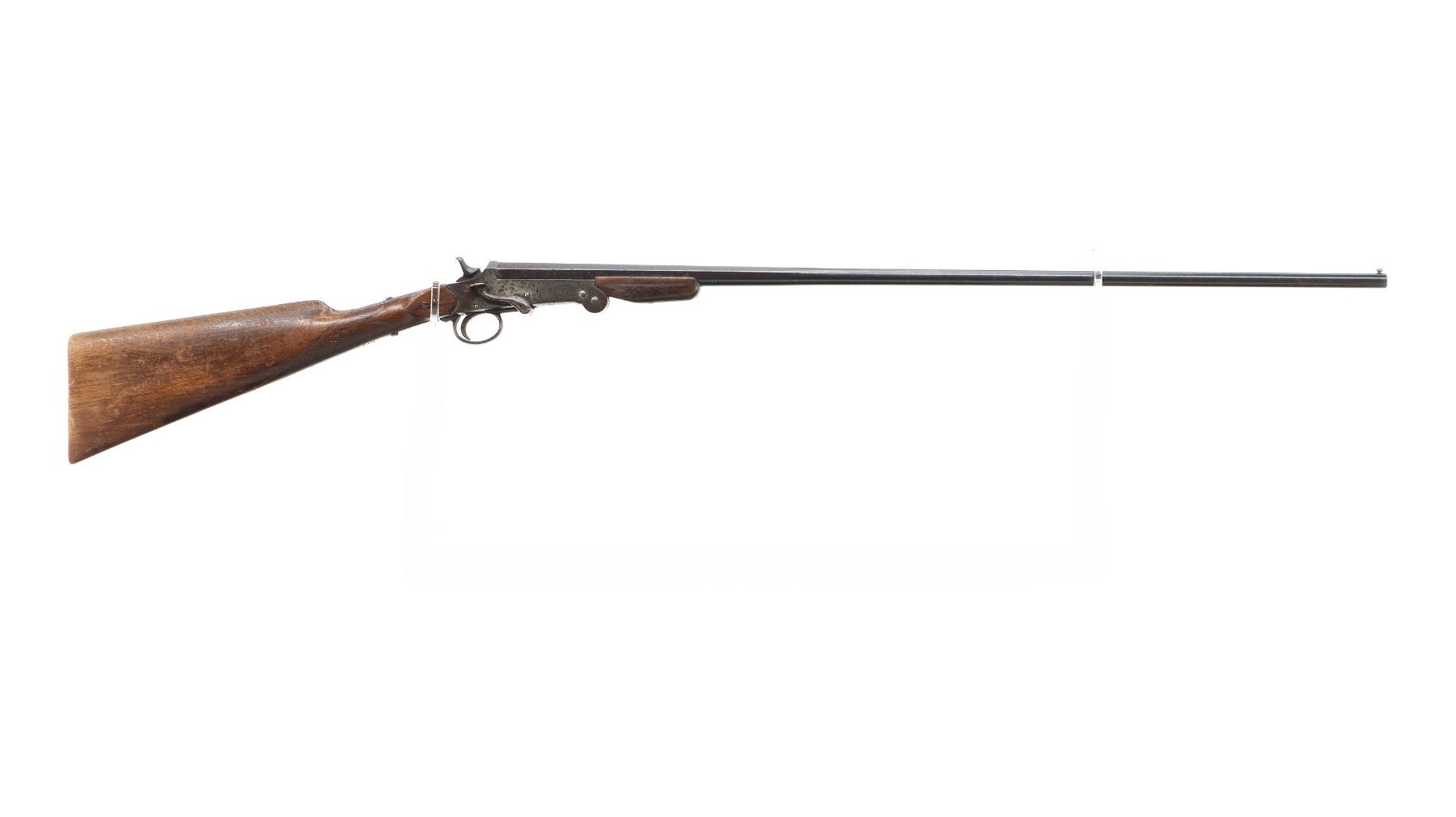 Main Description: Replaced bead, blued finish, checkered spur hammer and opening lever, extractor. Two piece wood stocks, checkered forearm (chipped) and straight grip, cracked behind receiver, tang screw replaced, grooved butt small chip at toe.
