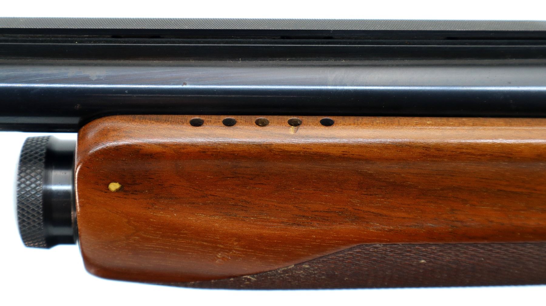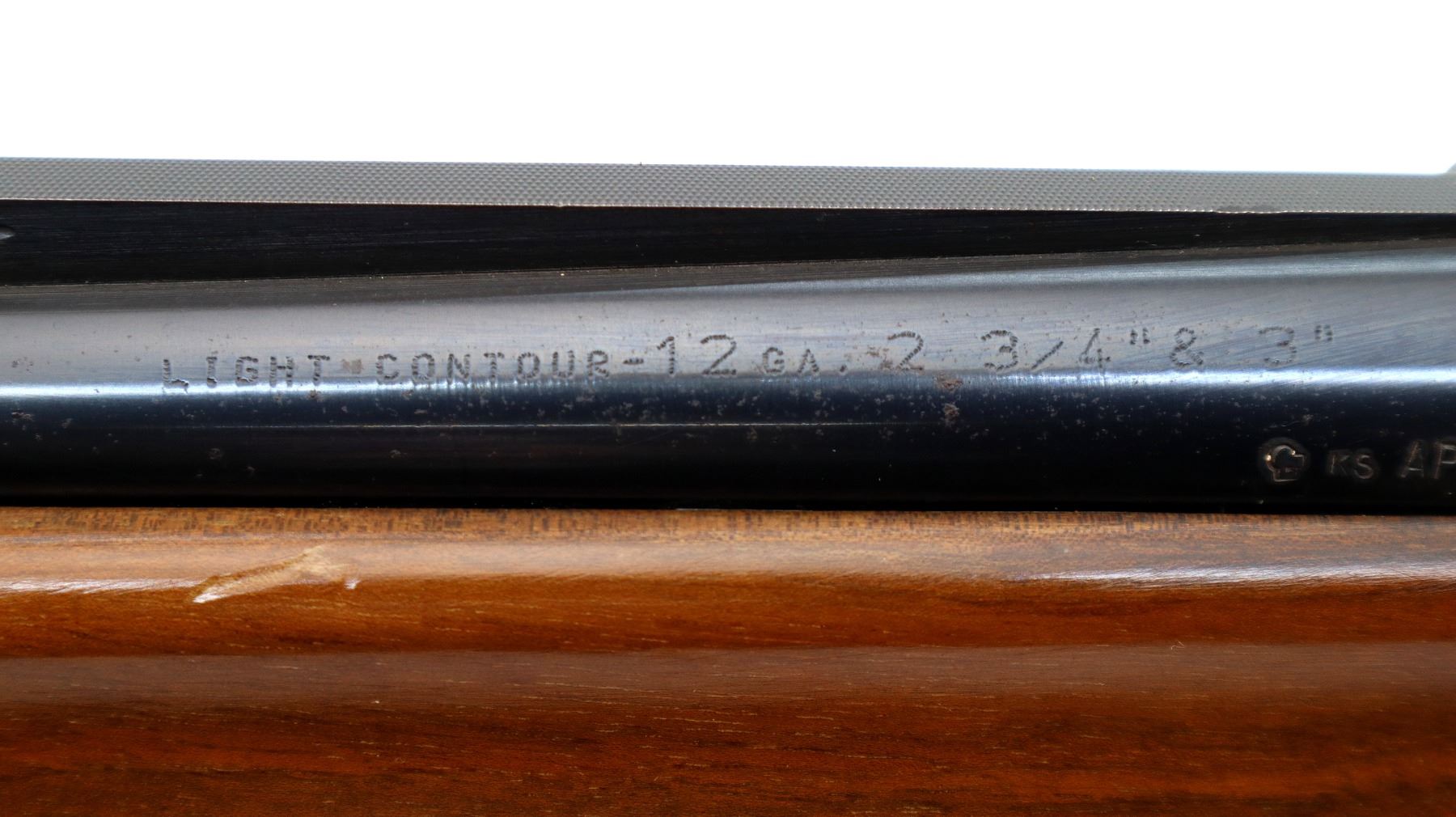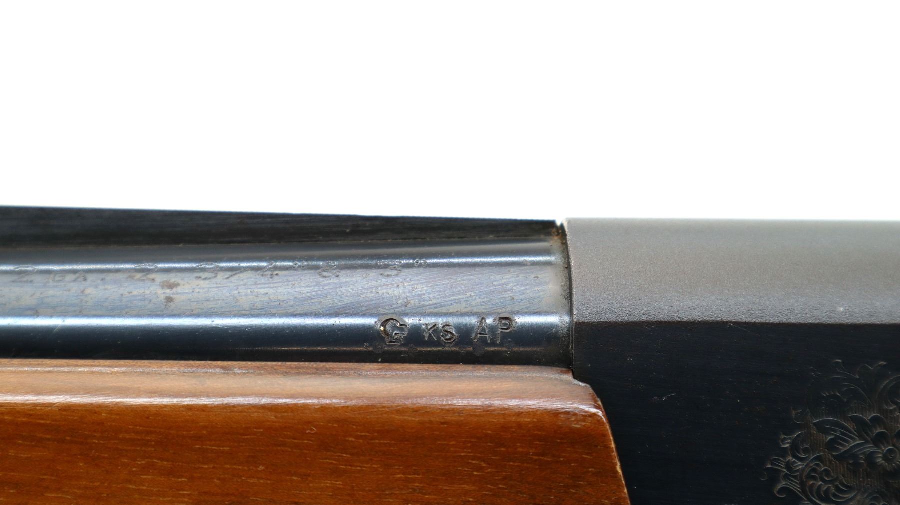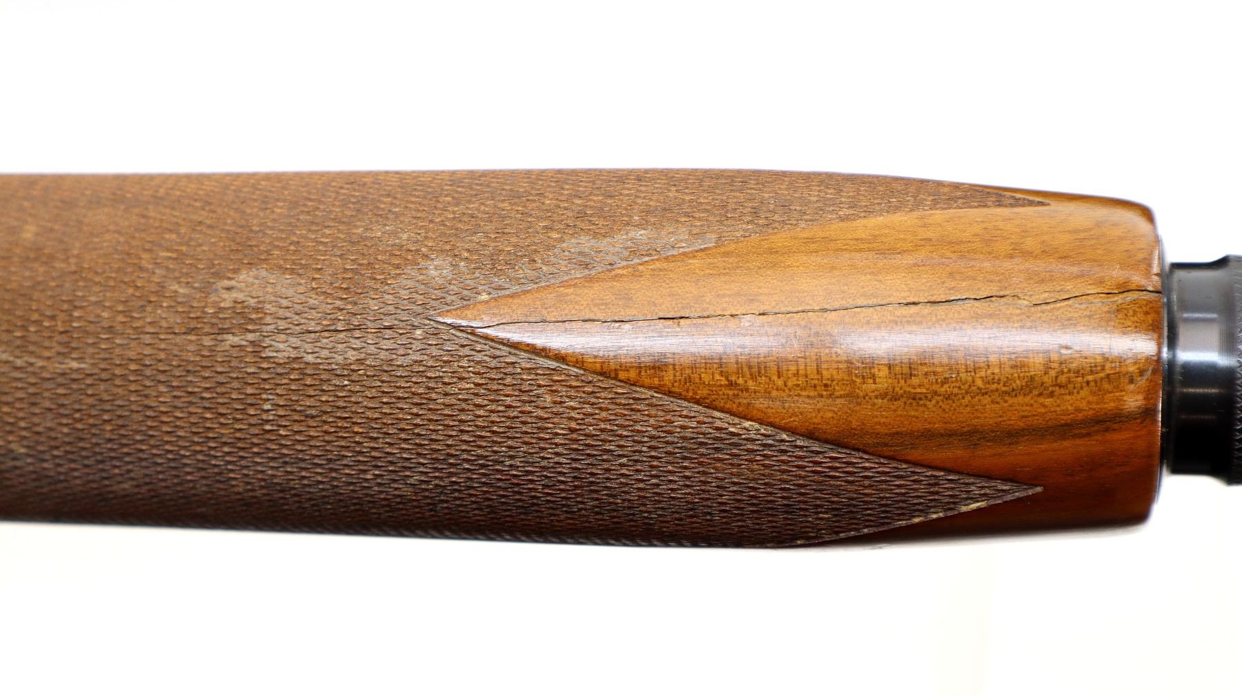 Main Description: Brass bead, blued finish, vent rib, engraved receiver. Two piece wood stocks, finger grooved checkered forearm which is cracked, checkered pistol grip, black polymer butt plate, stock has been shortened, butt plate and wood spacer have been put back.