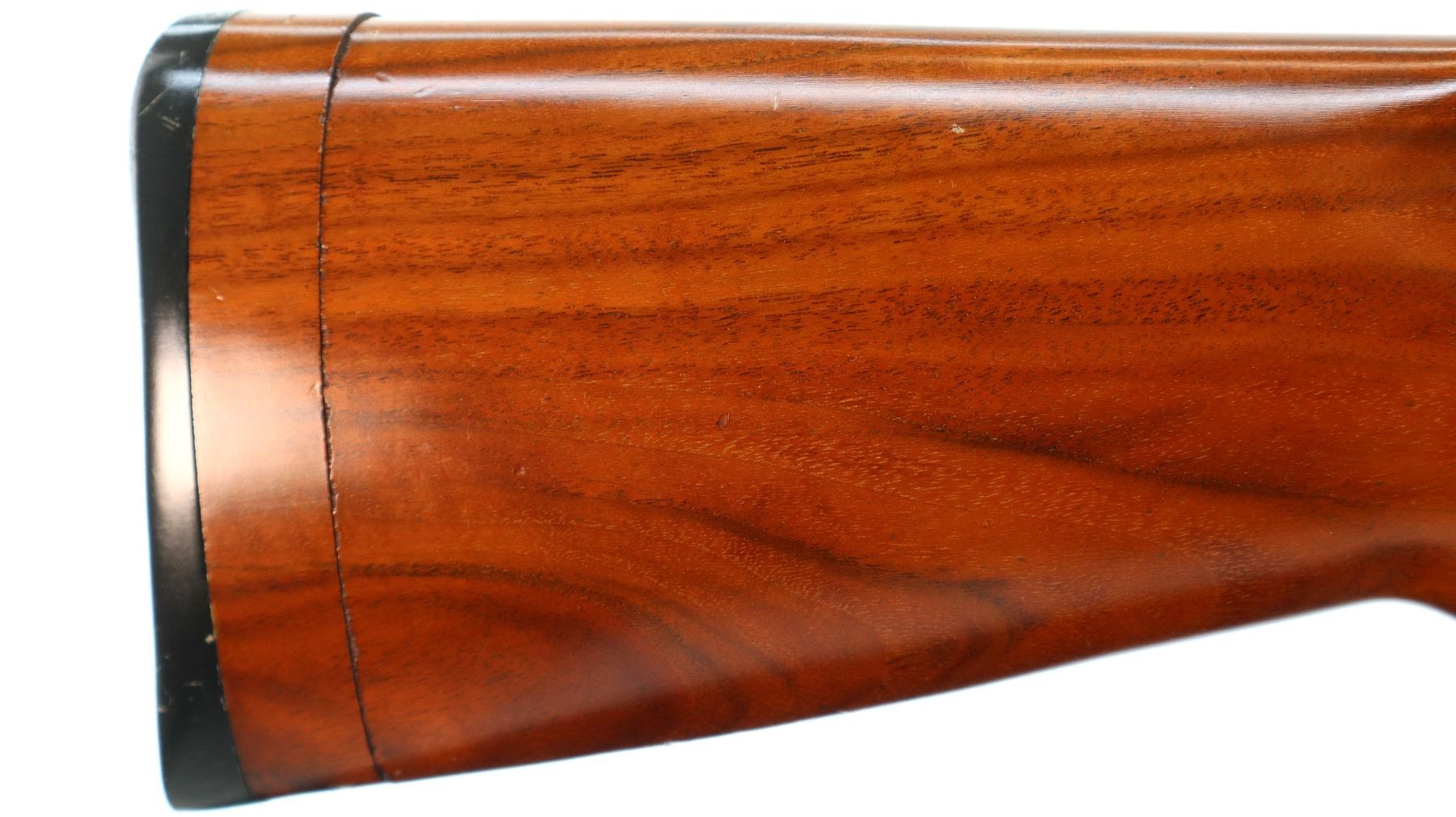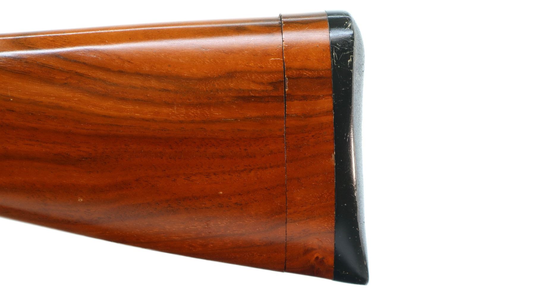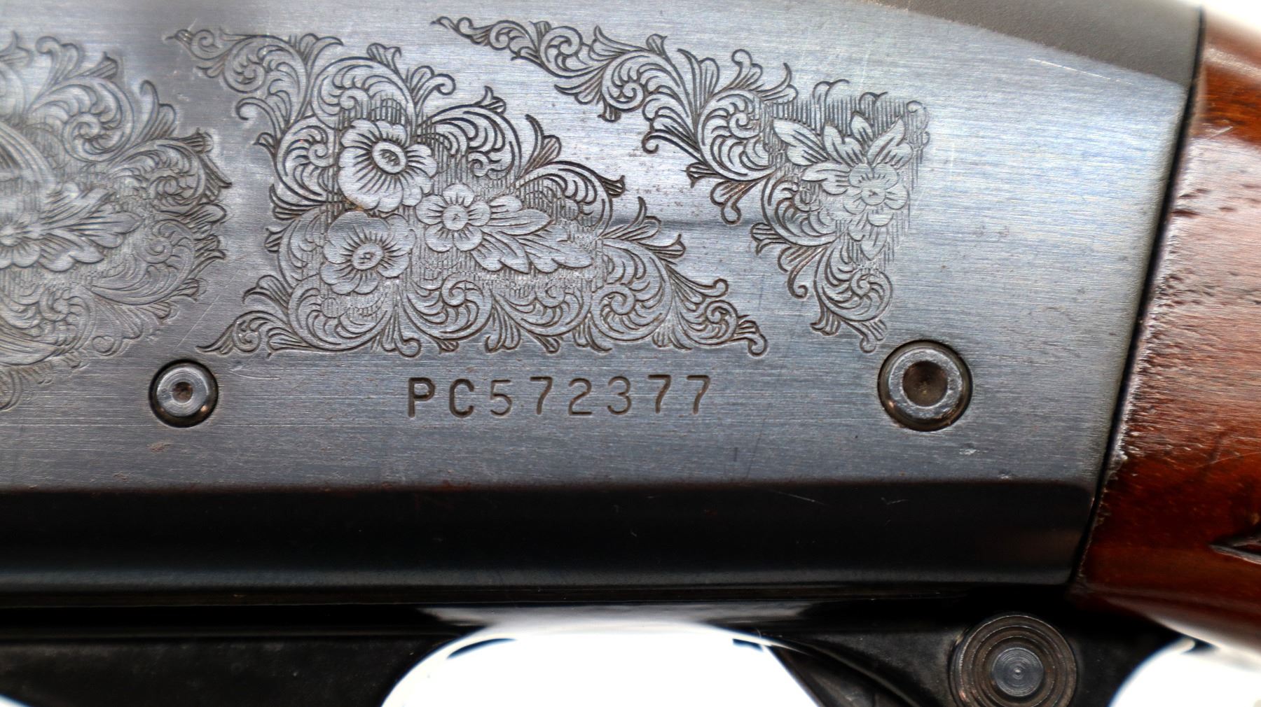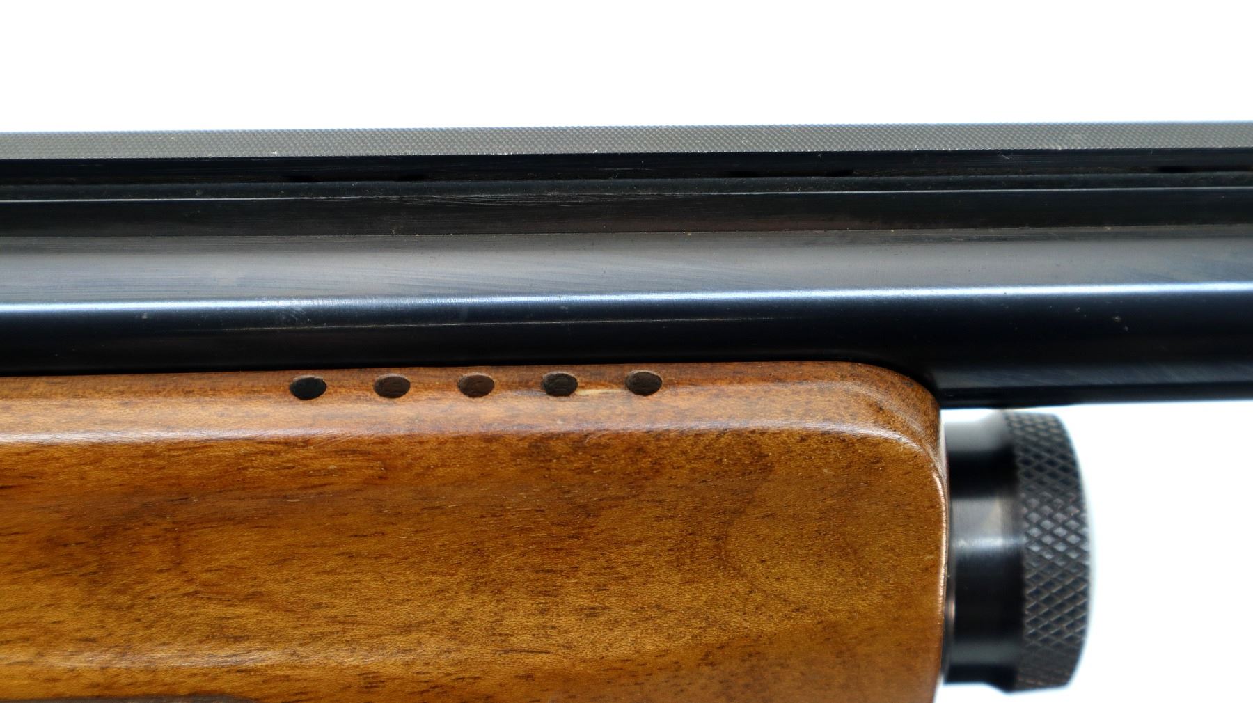 Main Description: Brass bead, blued finish, vent rib, engraved receiver. Two piece wood stocks, finger grooved checkered forearm which is cracked, checkered pistol grip, black polymer butt plate, stock has been shortened, butt plate and wood spacer have been put back.