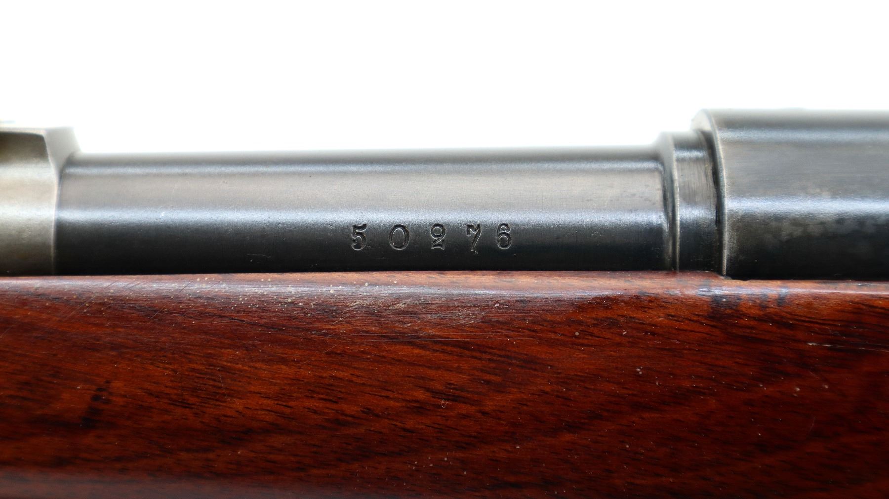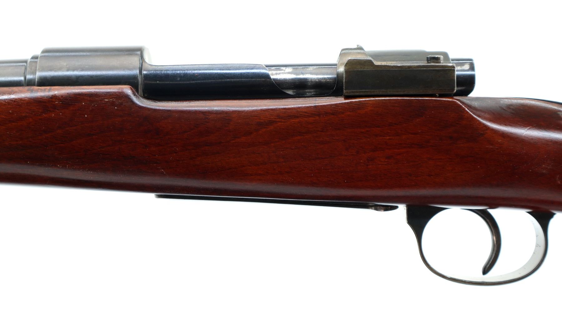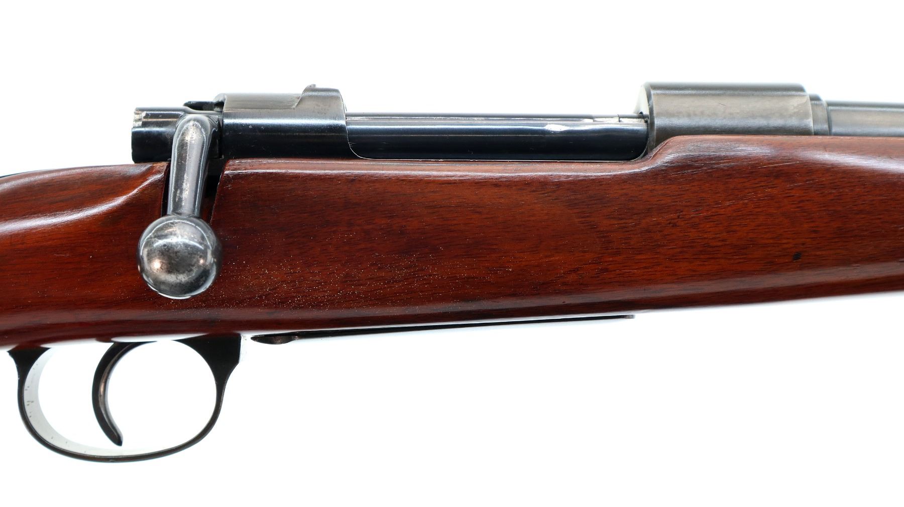 Main Description: Blade front sight with hood and ramp, adjustable u notched rear sight, blued finish, receiver drilled and tapped with no plug screws installed, turned down bolt handle with checkered flat bottomed knob, missing complete firing pin assembly. One piece wood stock, Schnabel forend tip, checkered pistol grip, grooved black polymer butt plate, grip cap, sling swivels, hole in end of forearm.