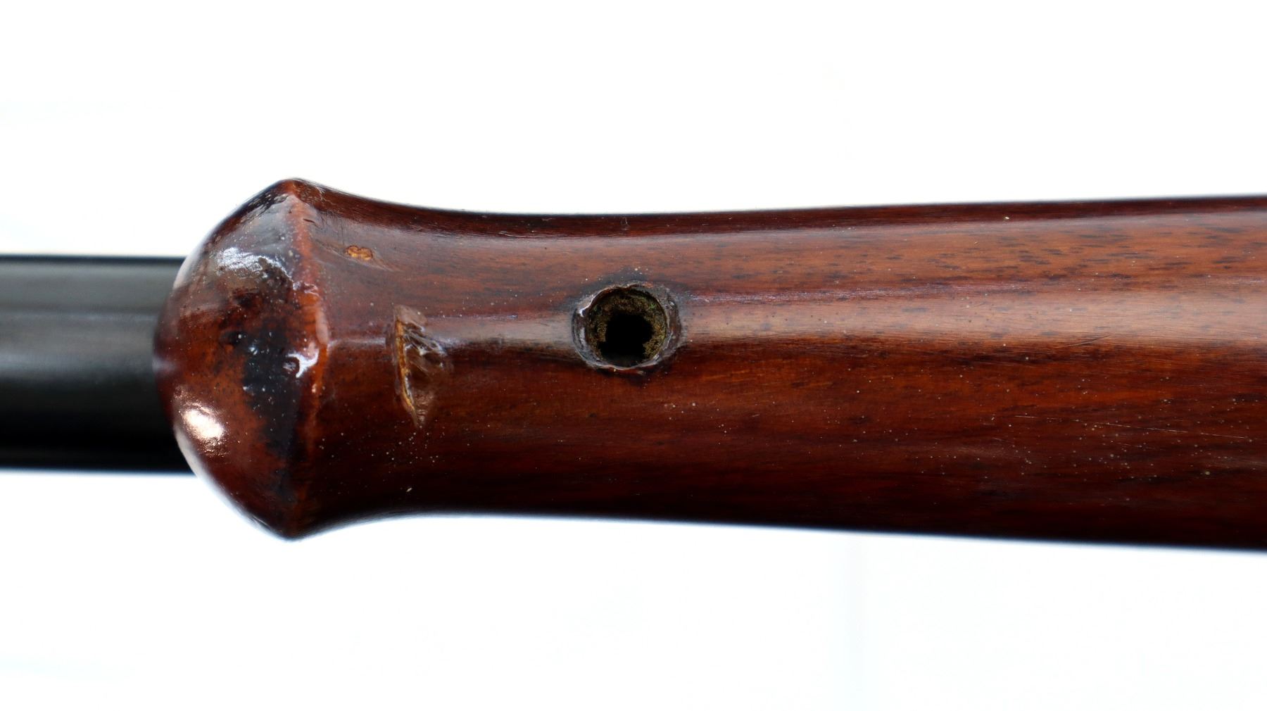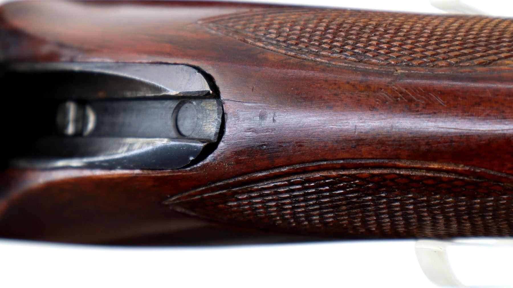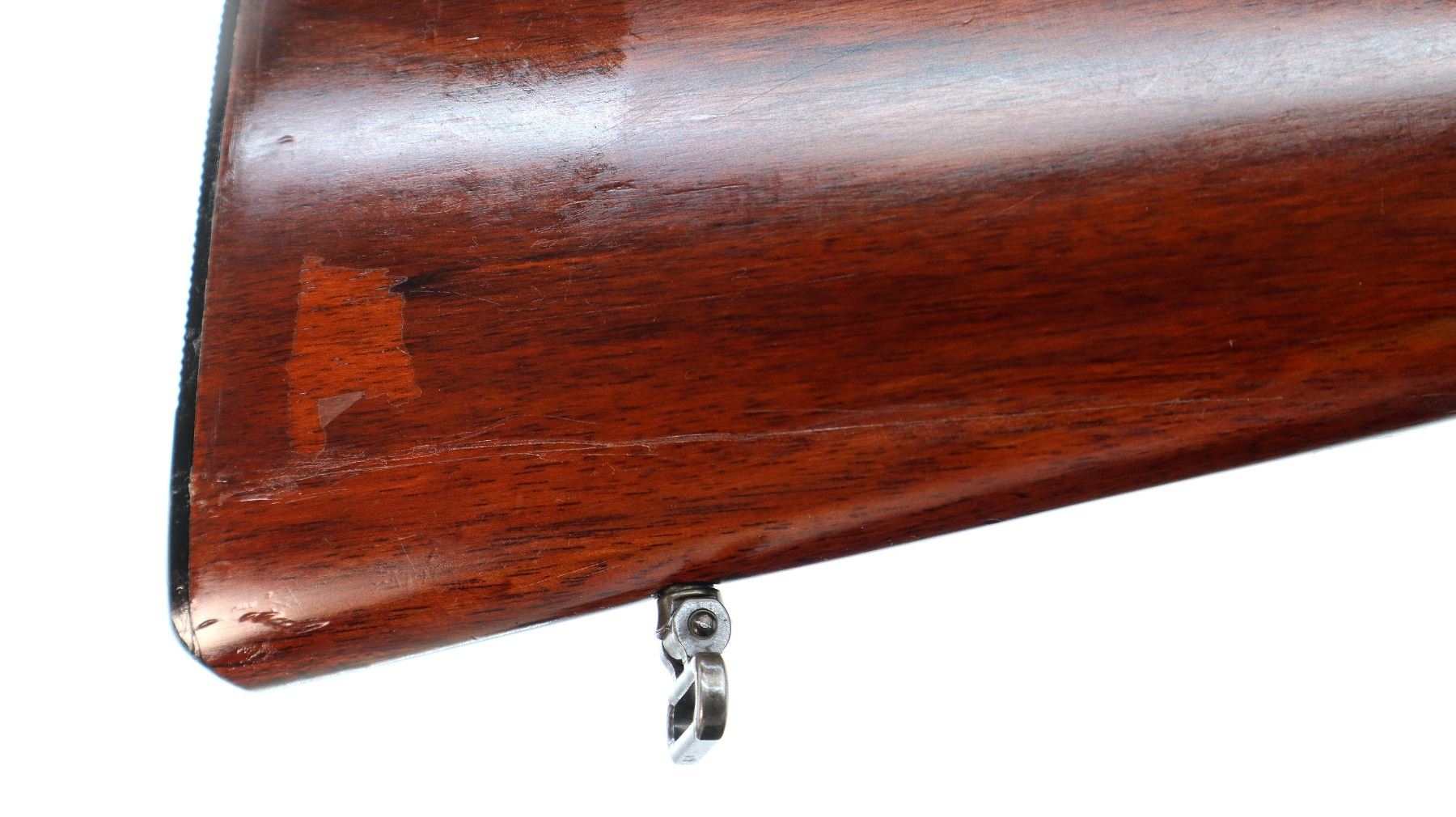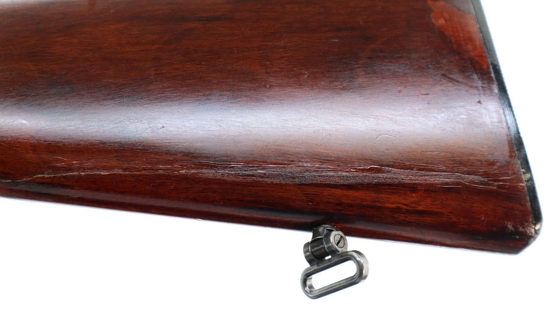 Main Description: Blade front sight with hood and ramp, adjustable u notched rear sight, blued finish, receiver drilled and tapped with no plug screws installed, turned down bolt handle with checkered flat bottomed knob, missing complete firing pin assembly. One piece wood stock, Schnabel forend tip, checkered pistol grip, grooved black polymer butt plate, grip cap, sling swivels, hole in end of forearm.