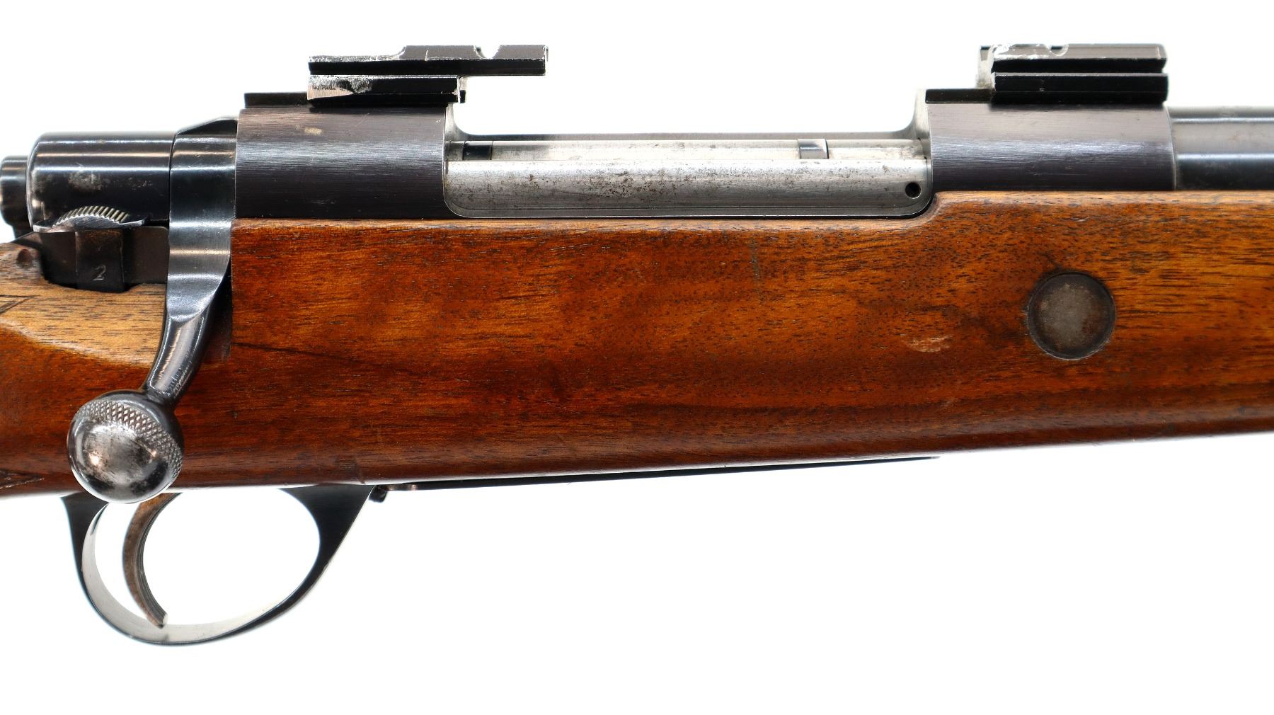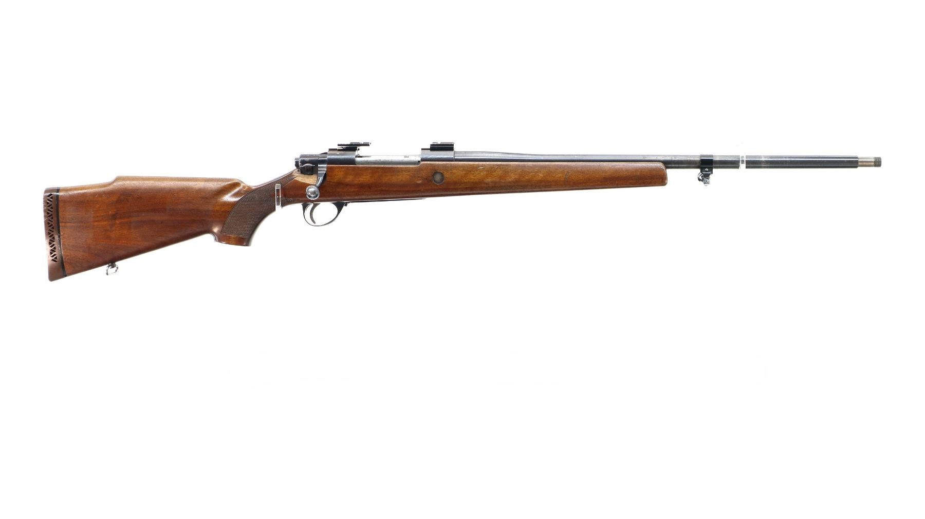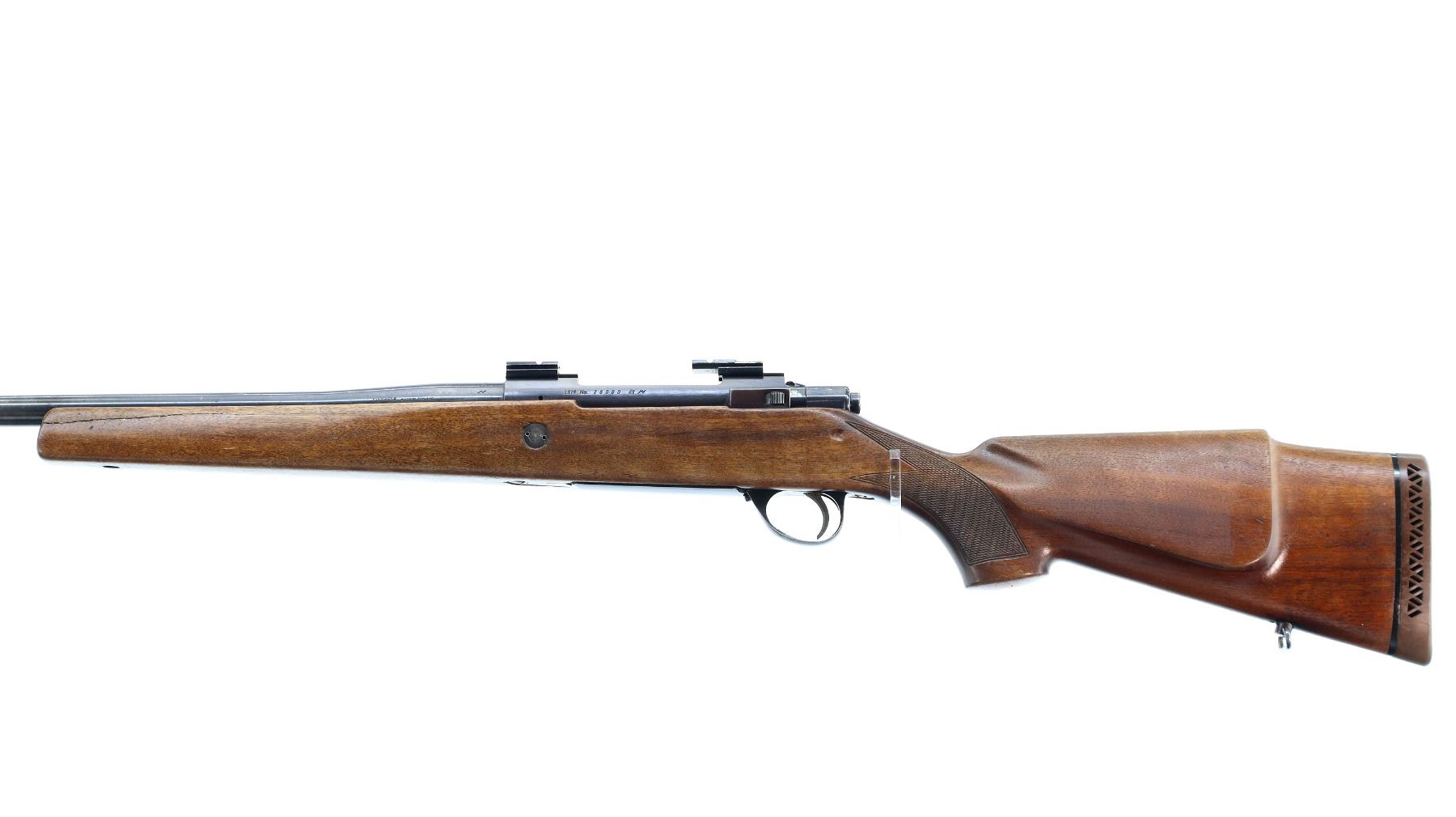 Main Description: Missing front and rear sights, blued finish, rebated threaded muzzle with no cap, receiver has integral scope bases with two piece alloy ones installed, checkered bolt knob, missing bolt stop spring trigger is seized requires adjustment parts or repair. One piece wood stock, forend cracked on left side, checkered pistol grip, stock modified and cracked on right side below receiver, cheek rest, brown rubber recoil pad, hinged floor plate, has sling swivels, hole in front of forearm.