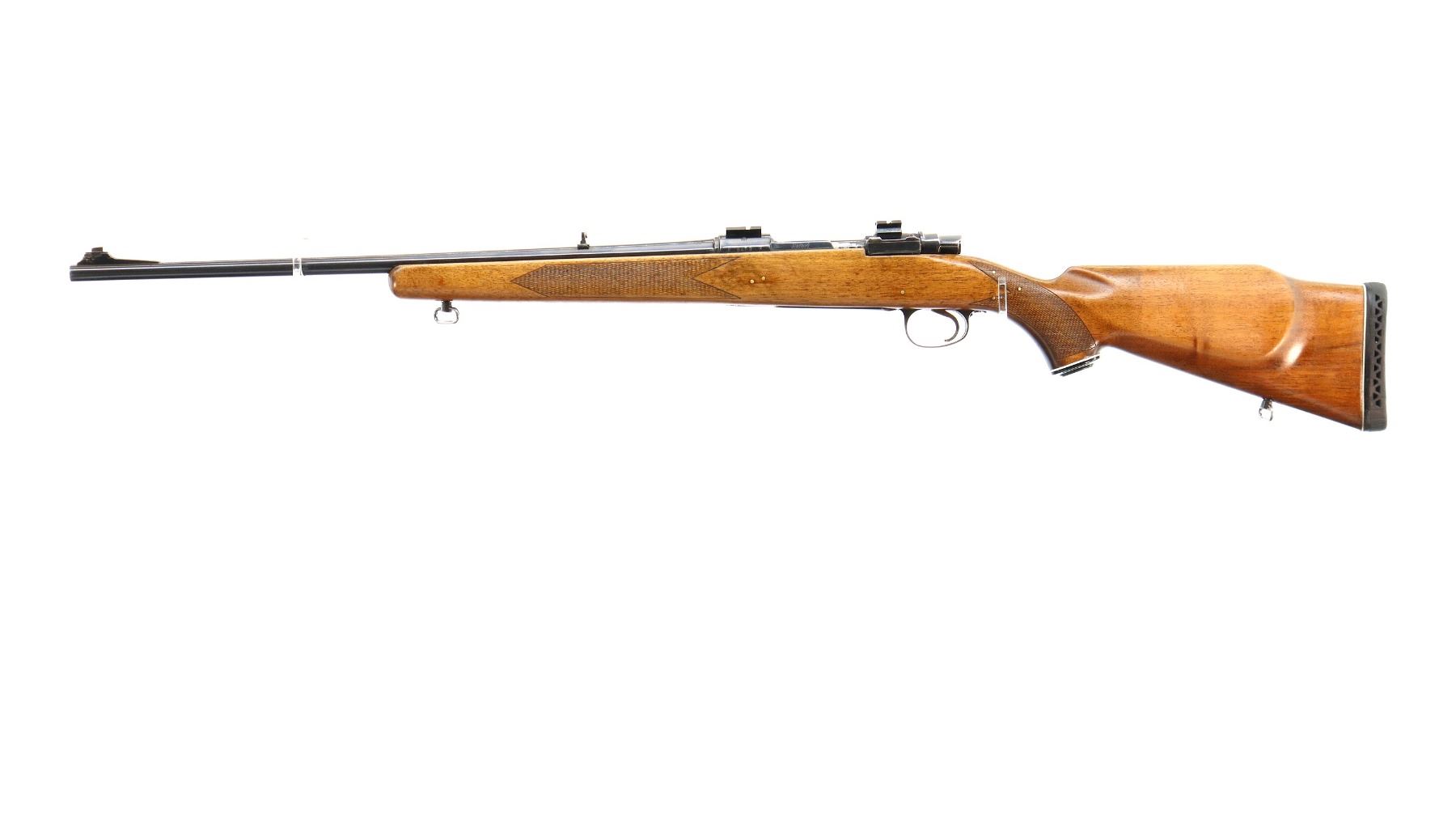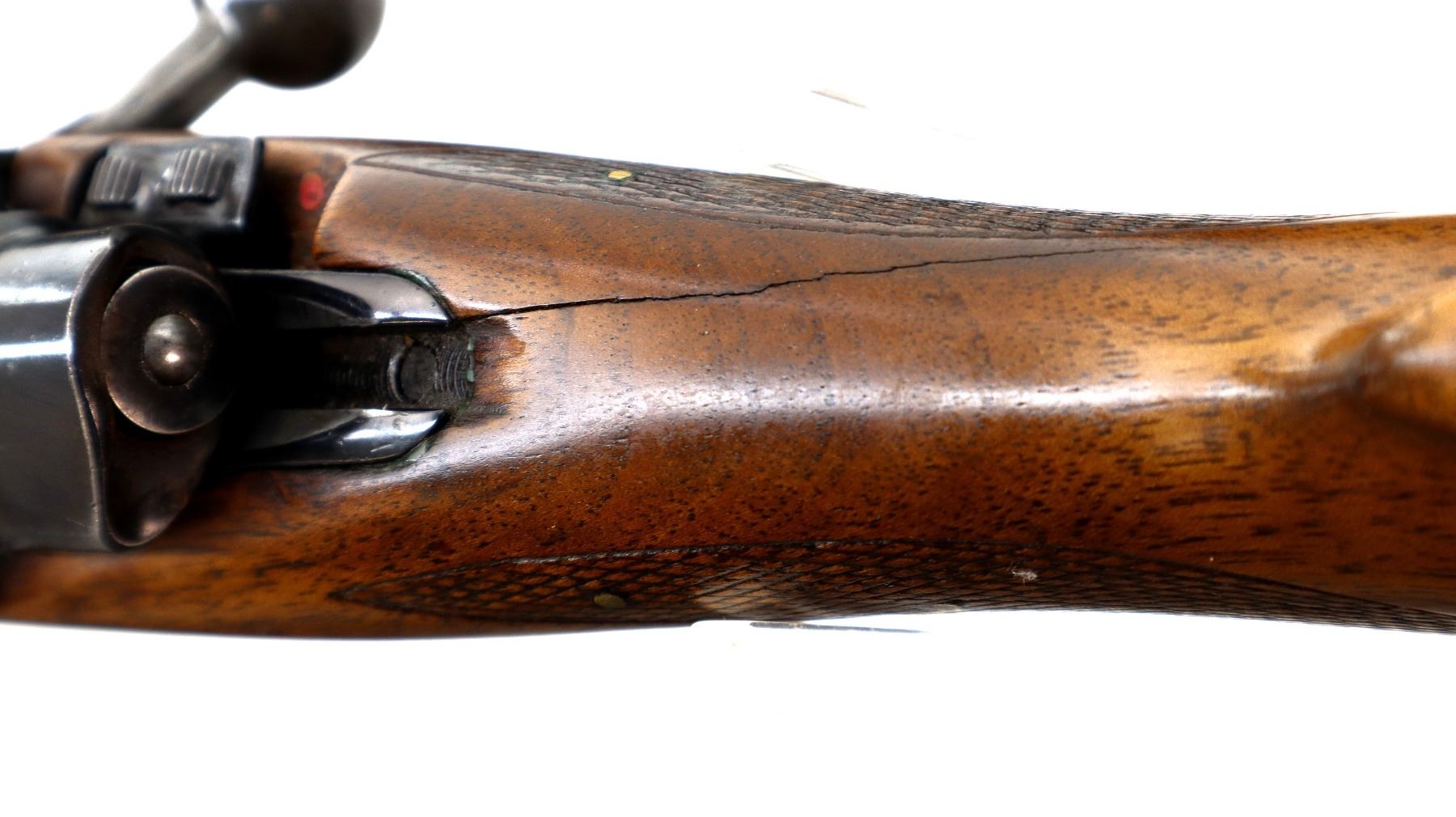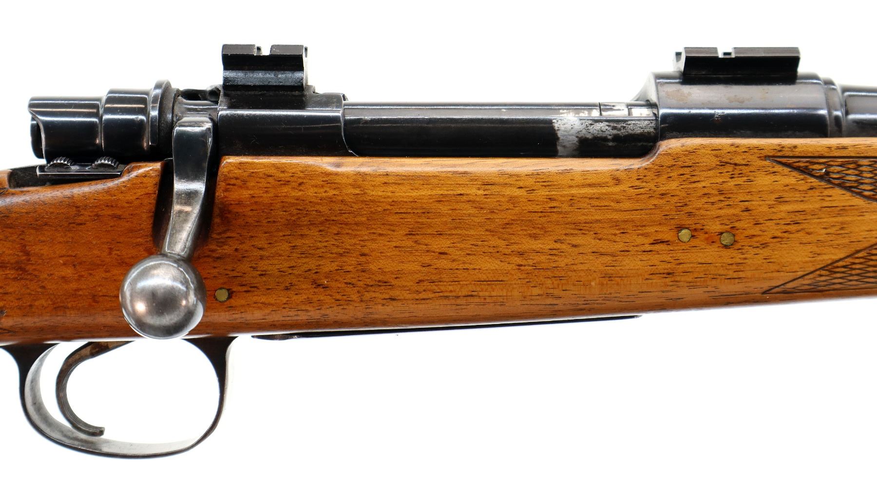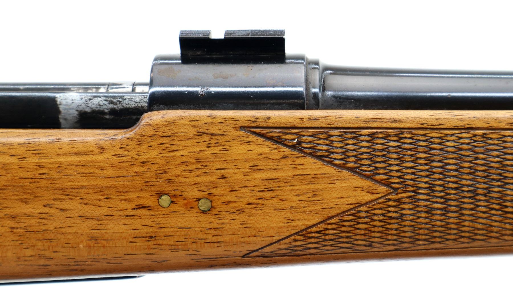 Main Description: Blade front sight with ramp, adjustable folding u notched rear sight, blued finish, receiver drilled and tapped with two piece scope bases installed, smooth bolt knob. One piece wood stock, checkered forearm and pistol grip, stock has been cracked and repaired with brass pins, cheek rest, black vented rubber recoil pad, grip cap, sling swivels.