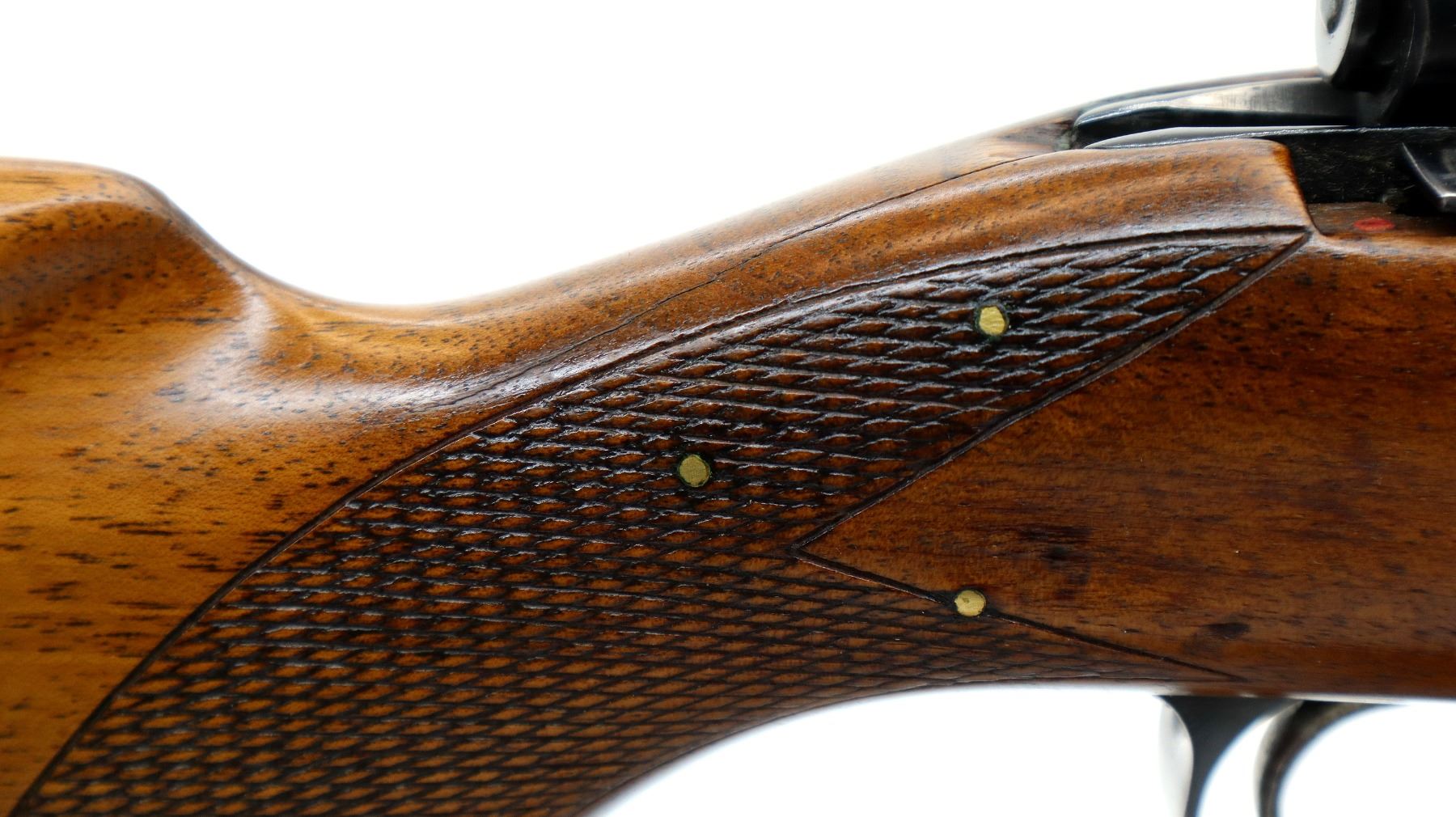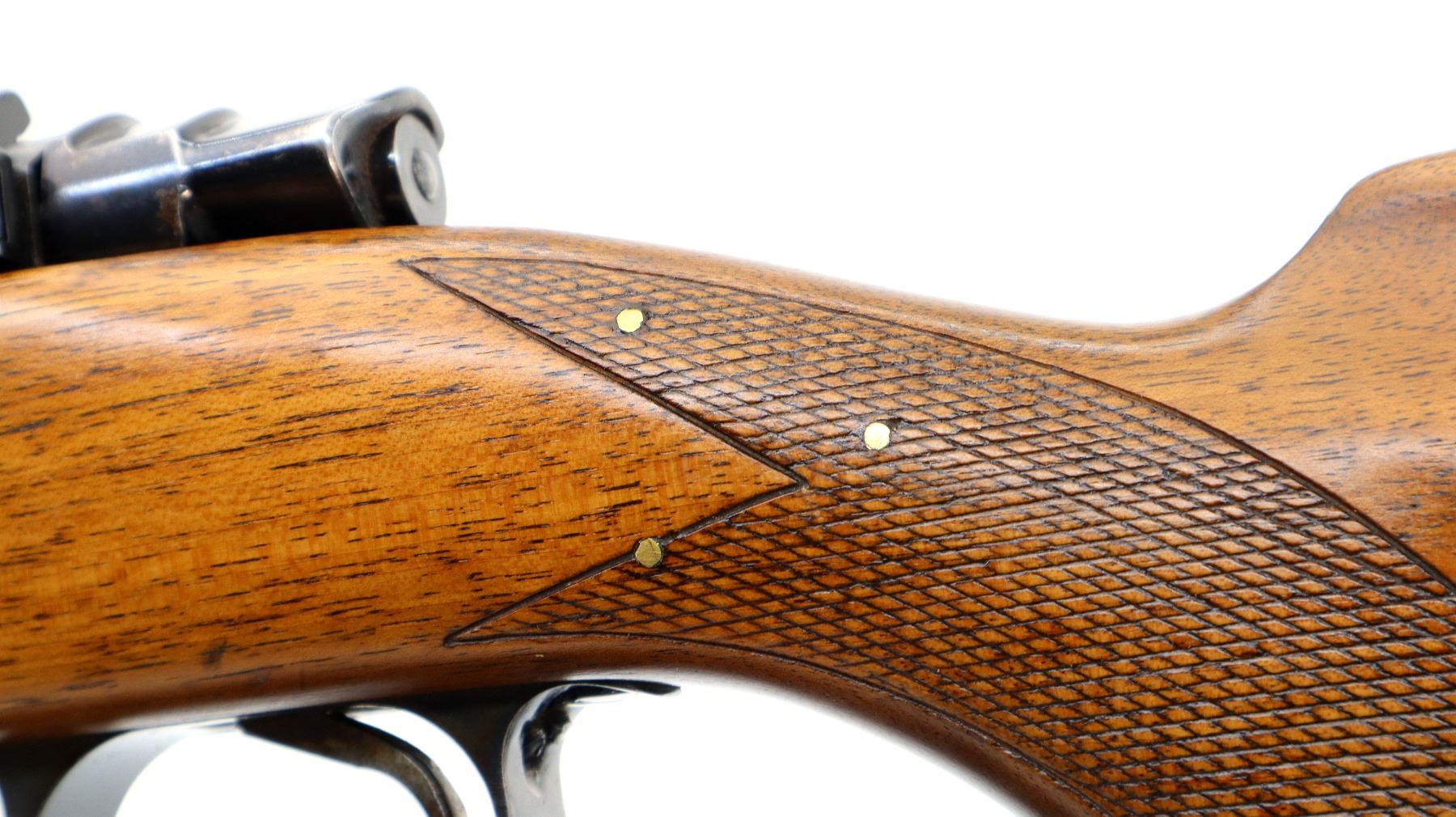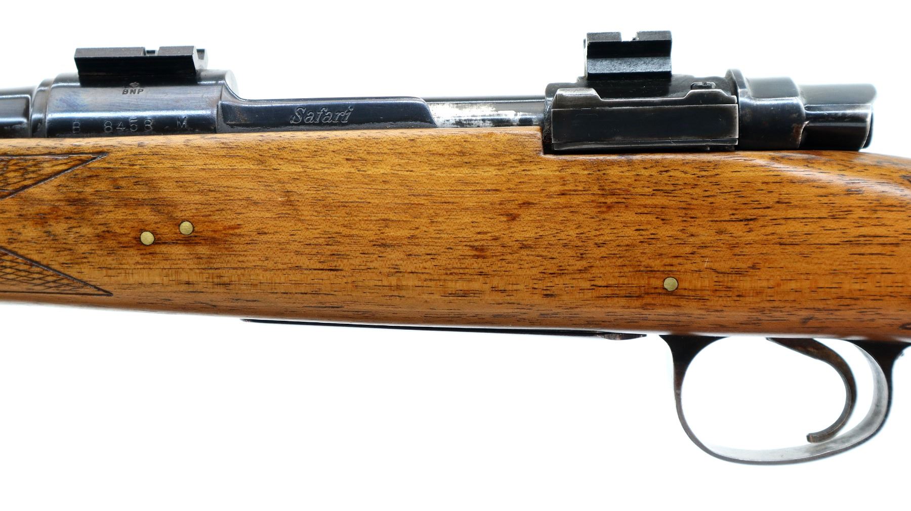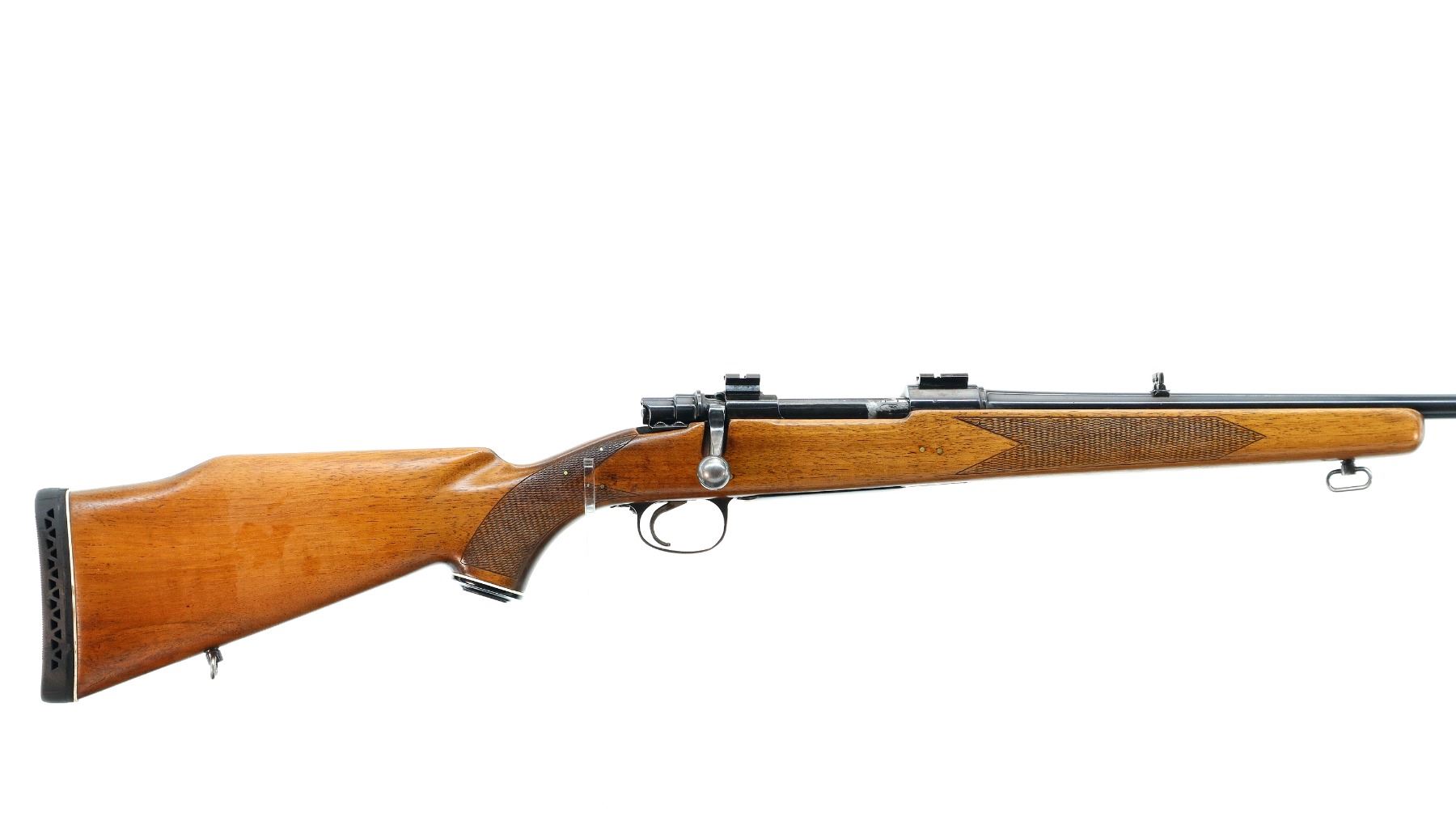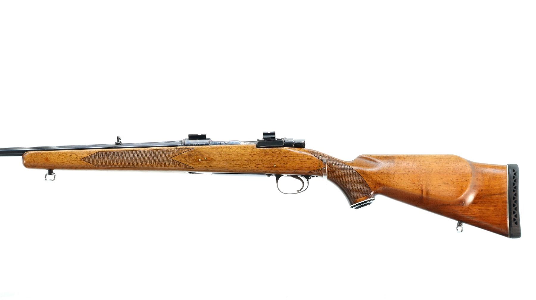 Main Description: Blade front sight with ramp, adjustable folding u notched rear sight, blued finish, receiver drilled and tapped with two piece scope bases installed, smooth bolt knob. One piece wood stock, checkered forearm and pistol grip, stock has been cracked and repaired with brass pins, cheek rest, black vented rubber recoil pad, grip cap, sling swivels.