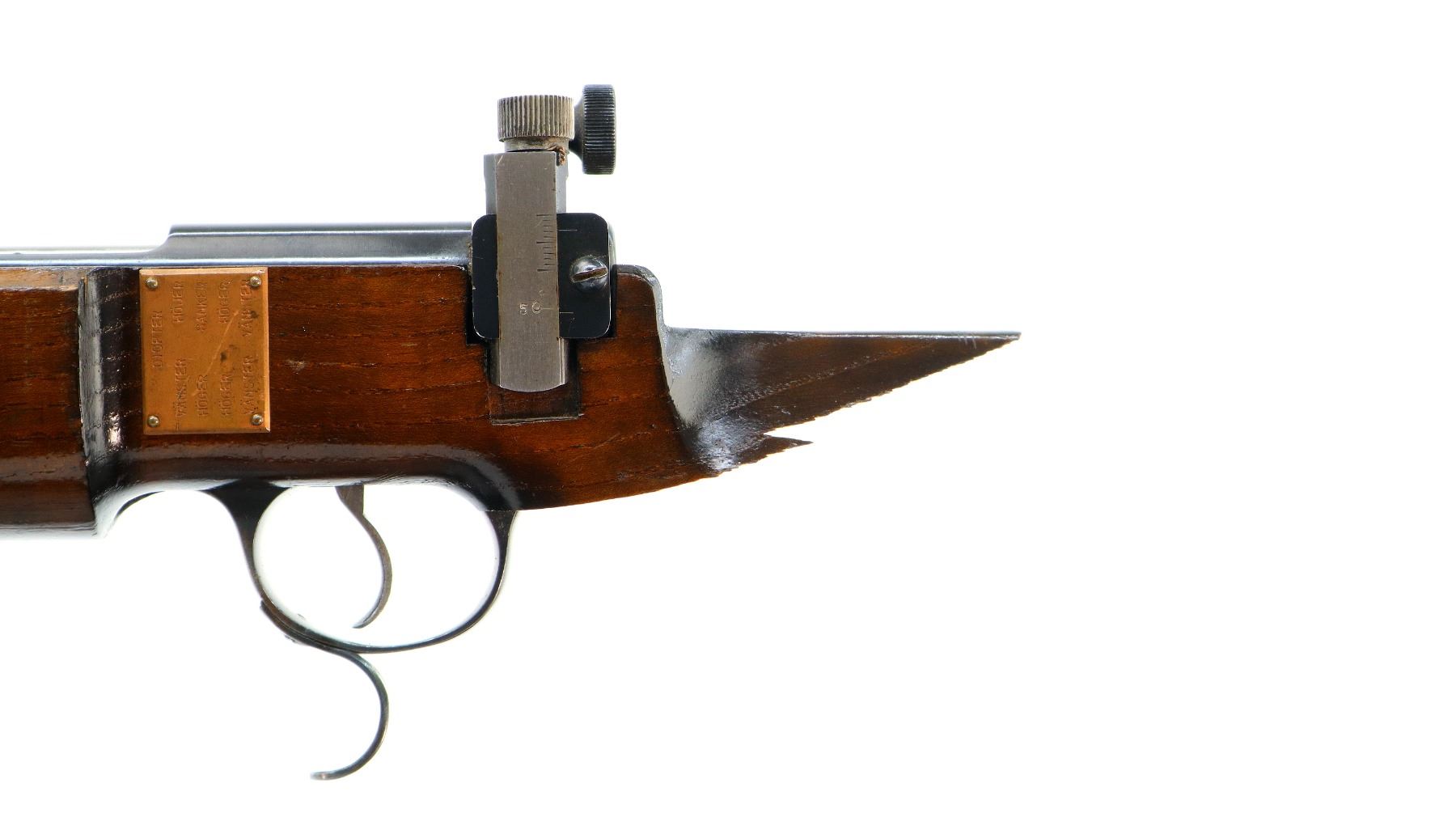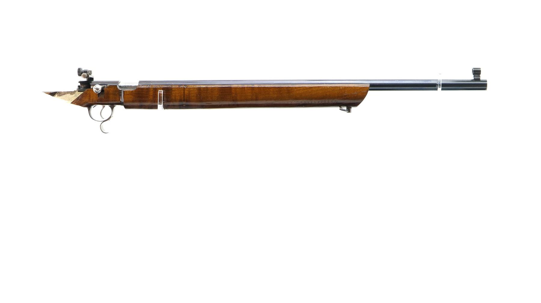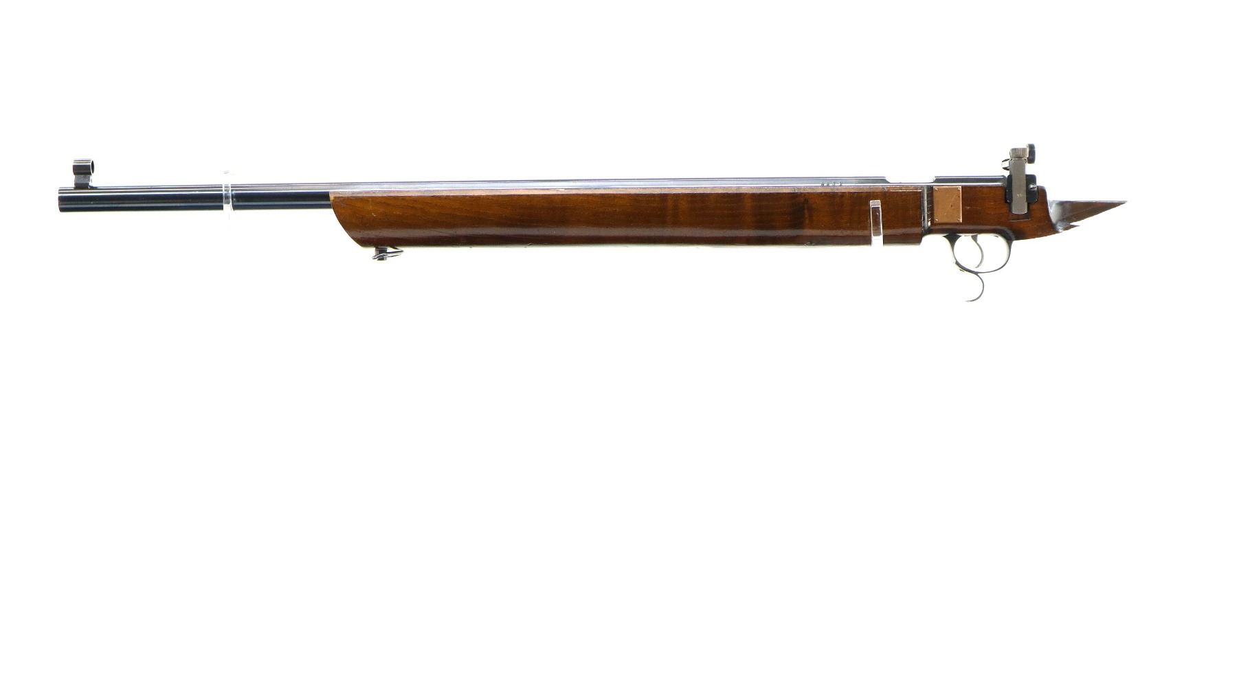 Main Description: Globe front sight with insert and ramp, adjustable rear peep sight, blued finish, heavy barrel, smooth bolt knob, extractor is present. Two piece wood stock, heavy forearm, thumb hole pistol grip, stock broken off through wrist, cheek rest, grooved adjustable hooked alloy butt plate, finger rest trigger guard, short rail under forearm and front sling swivel only.