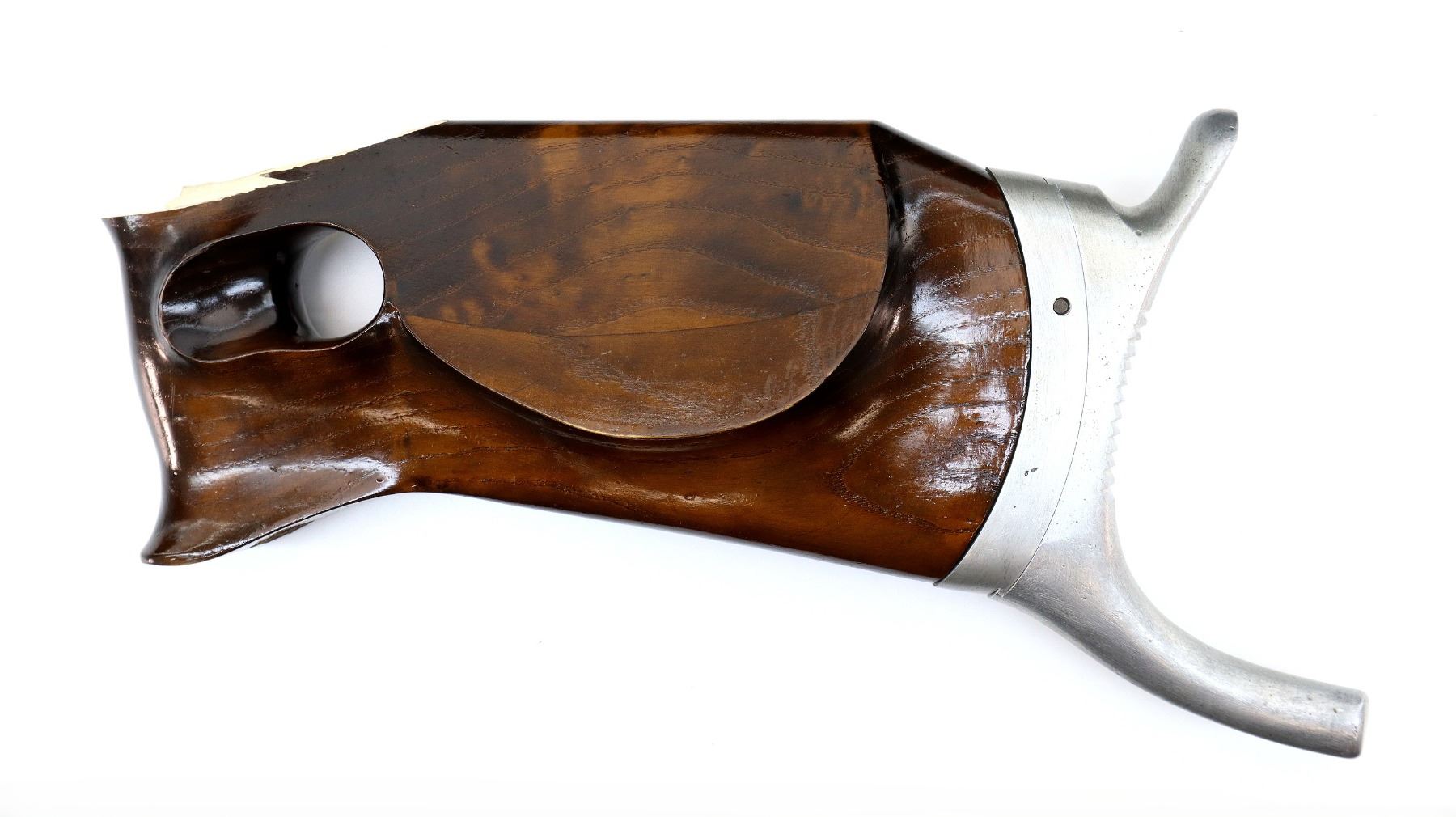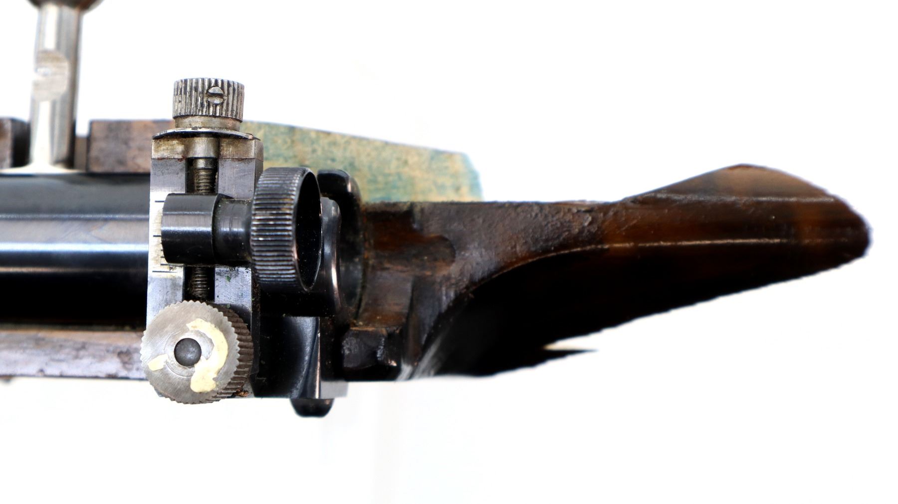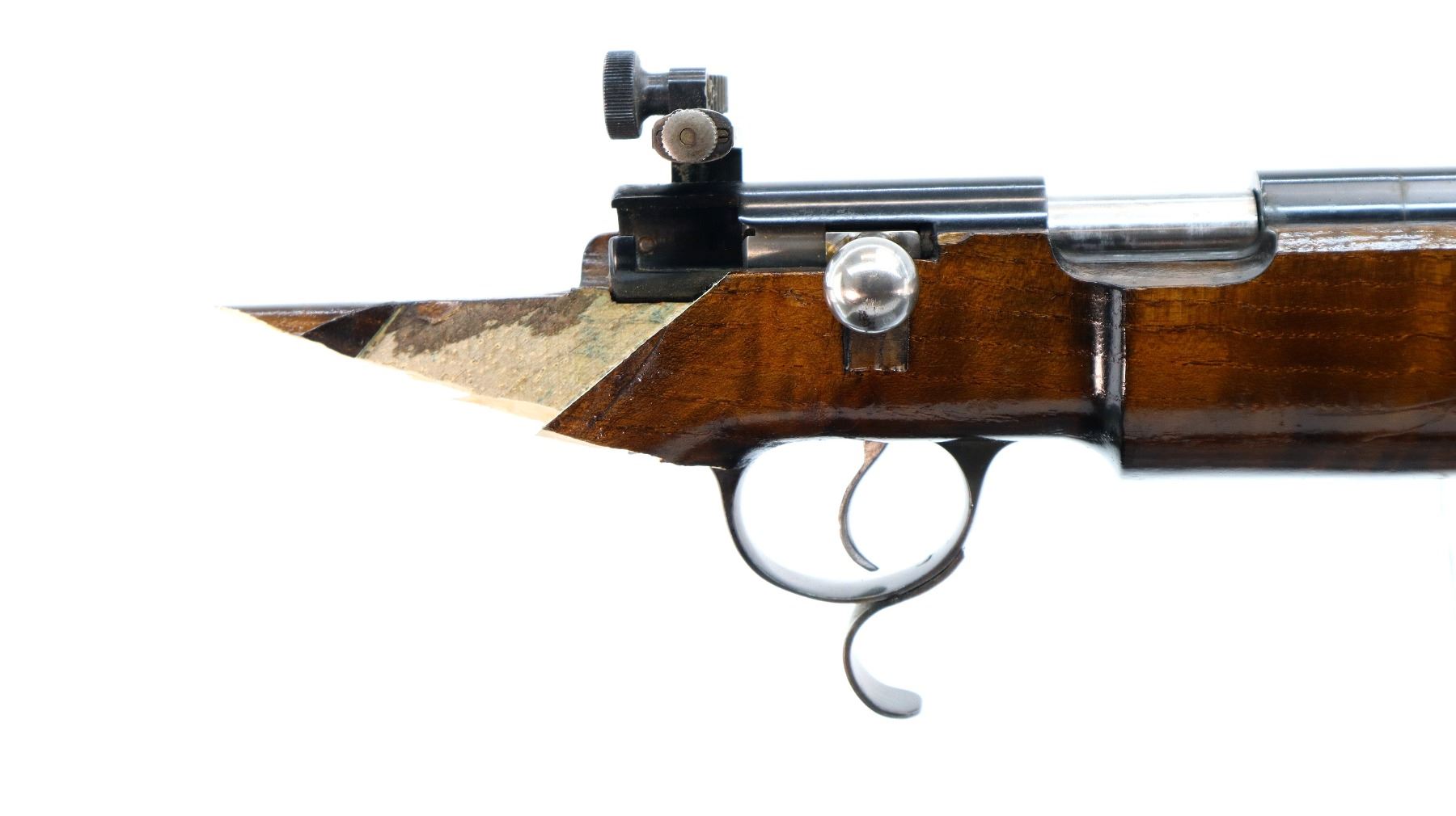 Main Description: Globe front sight with insert and ramp, adjustable rear peep sight, blued finish, heavy barrel, smooth bolt knob, extractor is present. Two piece wood stock, heavy forearm, thumb hole pistol grip, stock broken off through wrist, cheek rest, grooved adjustable hooked alloy butt plate, finger rest trigger guard, short rail under forearm and front sling swivel only.