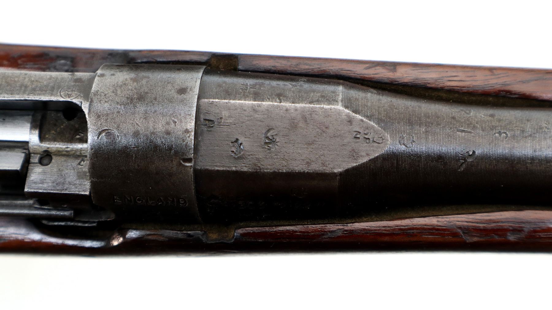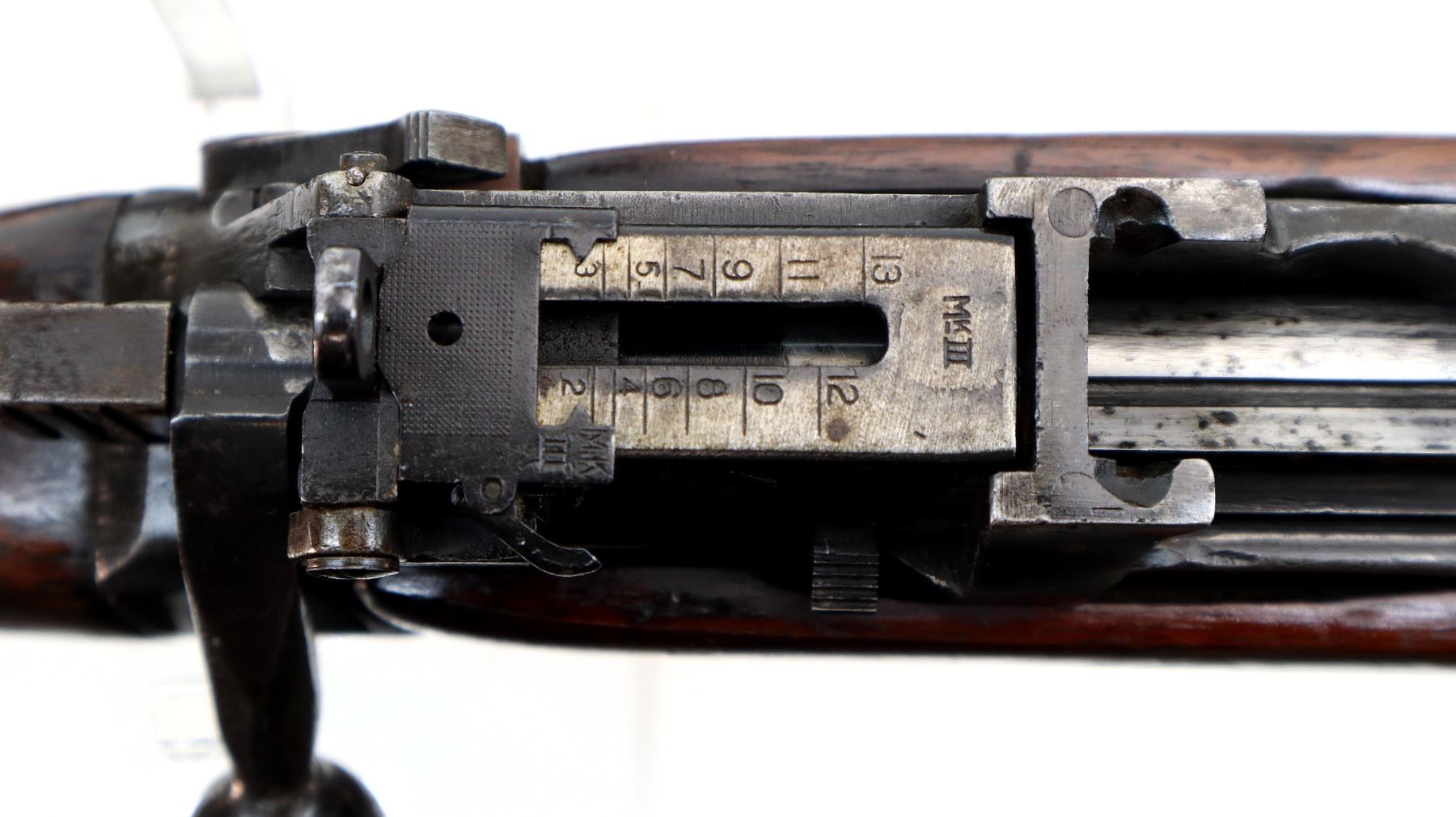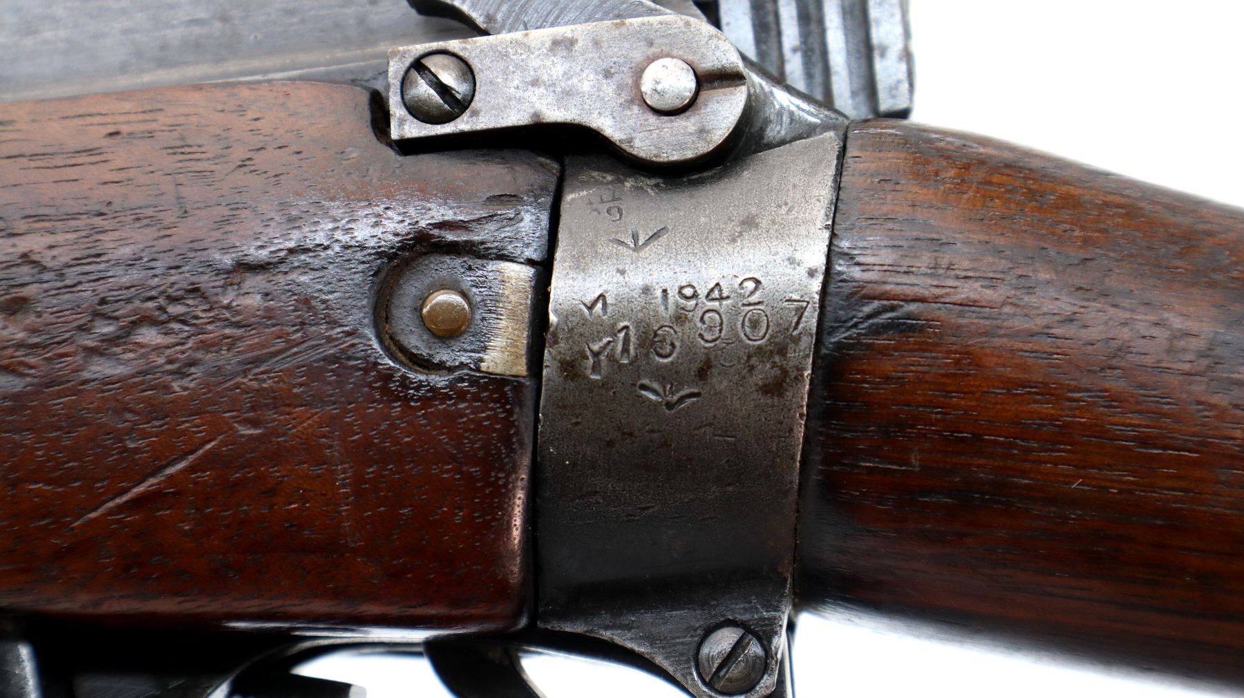 Wear: Metal finish turning silver grey with pitting, light rust spots, scratches, handling marks and wear. Stocks show marks, scratches and wear.