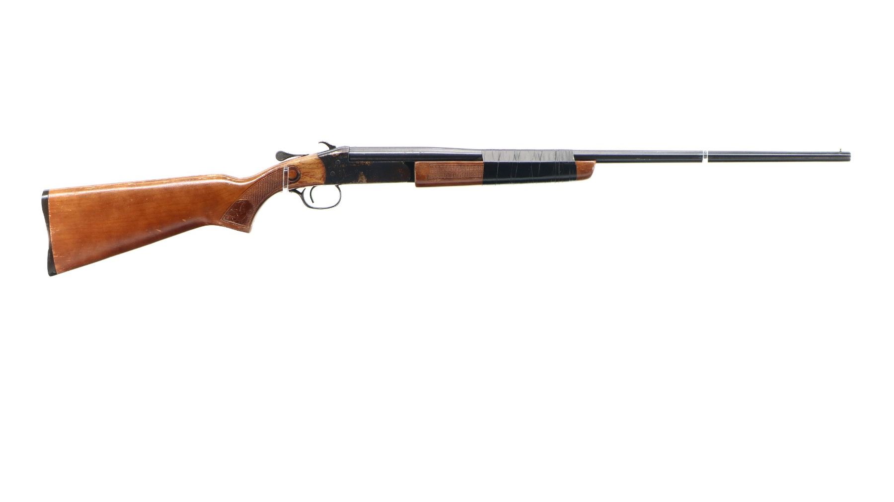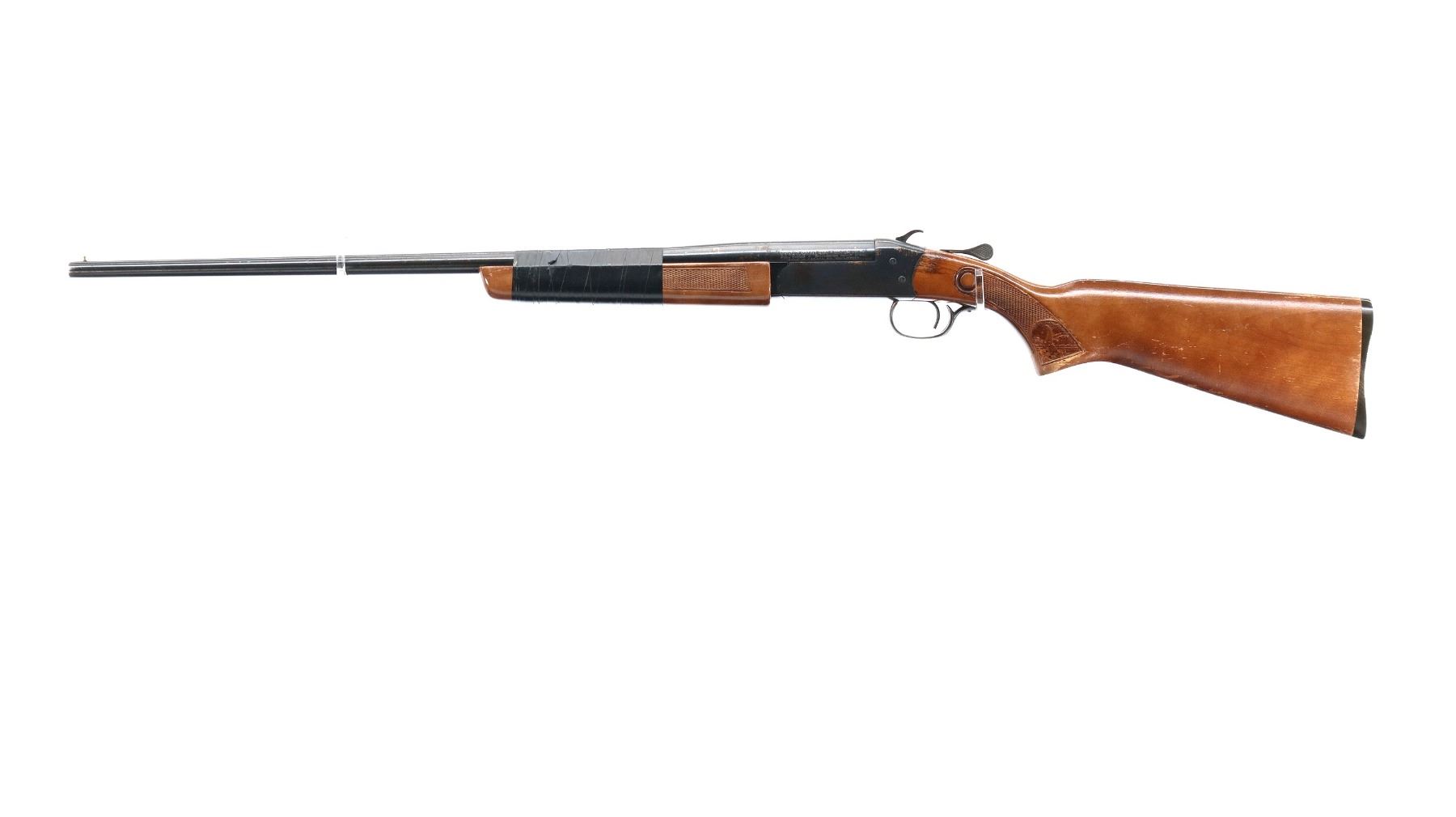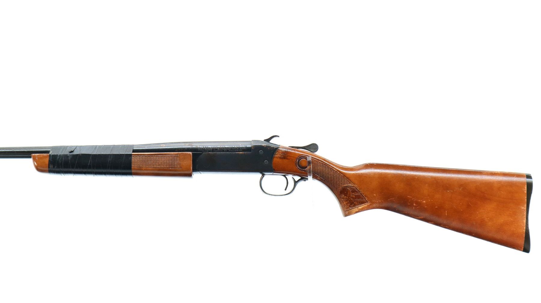 Main Description: Brass bead, blued finish, grooved spur hammer, ejector. Two piece wood stocks, checkered forearm wrapped with black tape, possibly requires adjustment parts and repair. Checkered pistol grip, grooved black polymer butt plate.