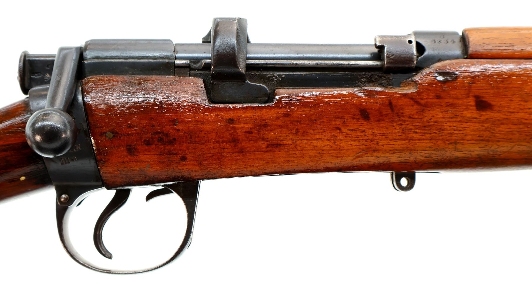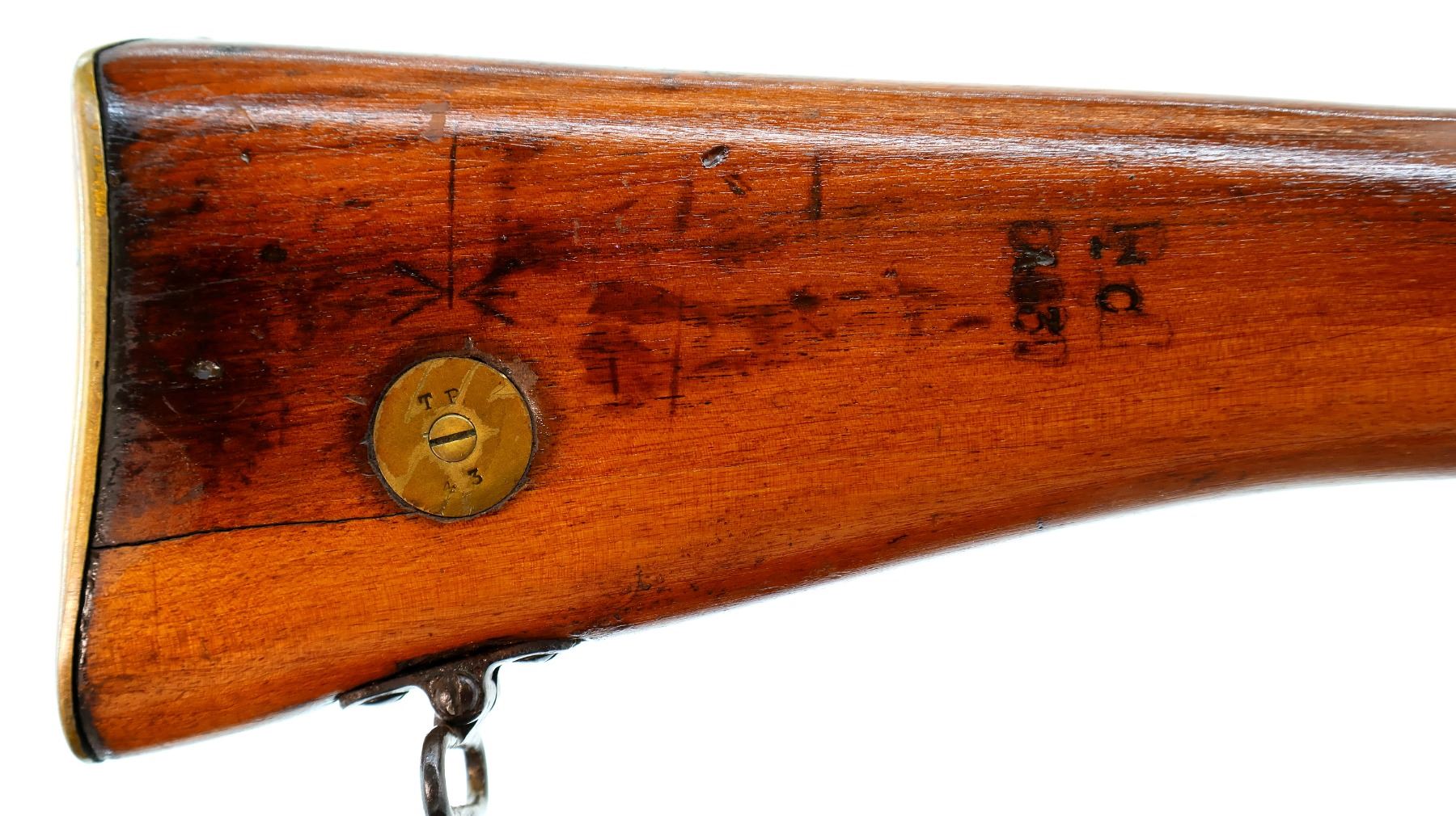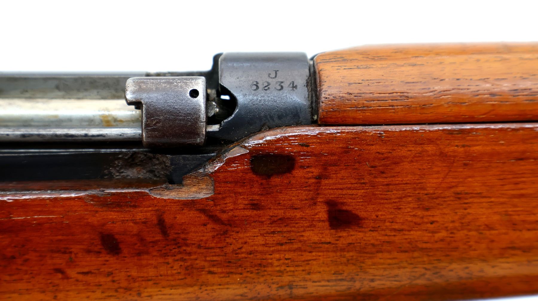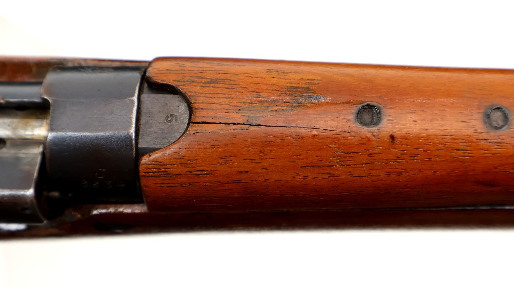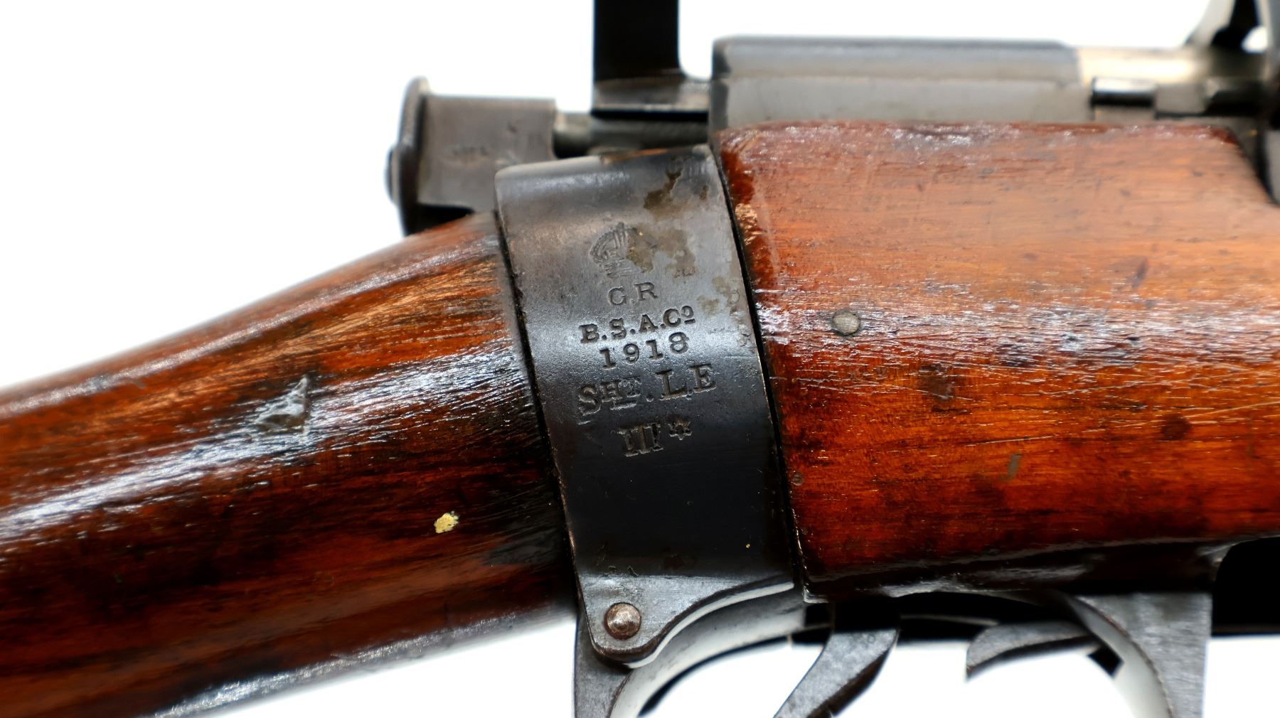 Main Description: Manufactured by BSA Co 1918, bolt mismatched. Blade front sight with ramp, adjustable u notched rear sight, blued finish. Three piece sporterized wood stocks, handguard is cracked, pistol grip, smooth brass butt plate with trap, brass stock disk marked TP43, stock cracked from toe to bottom of grip, sling swivels.