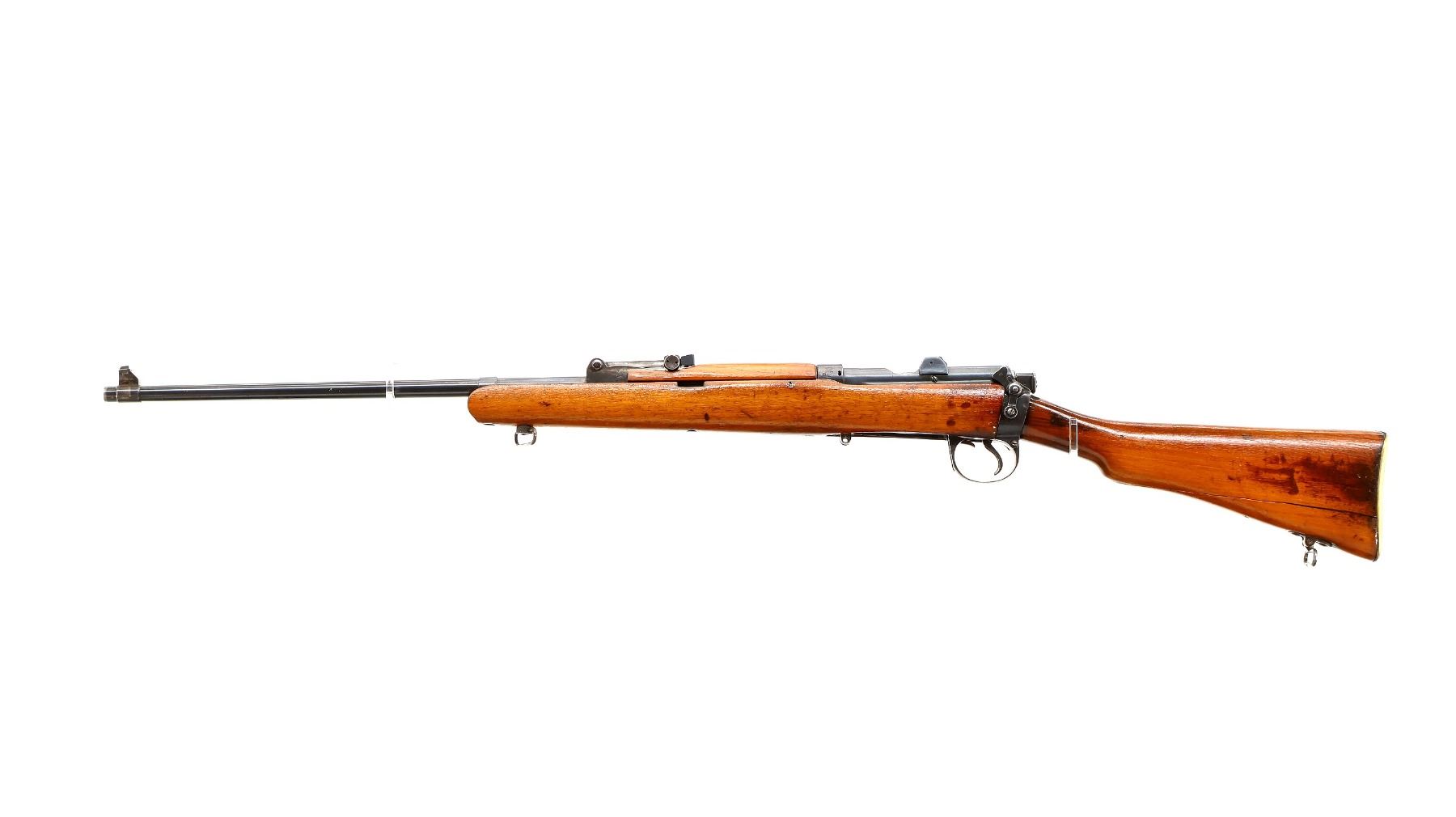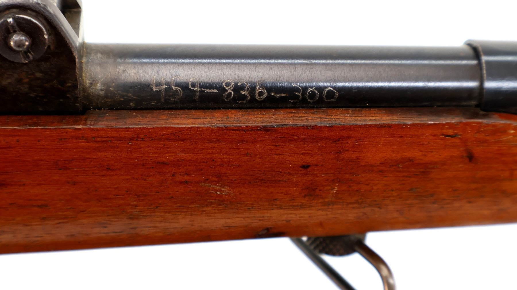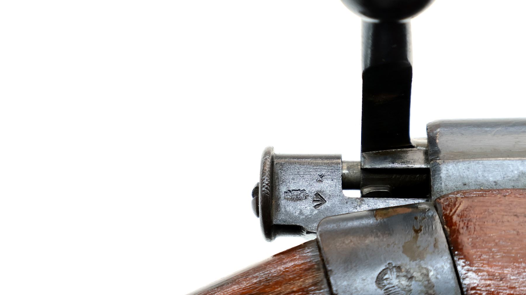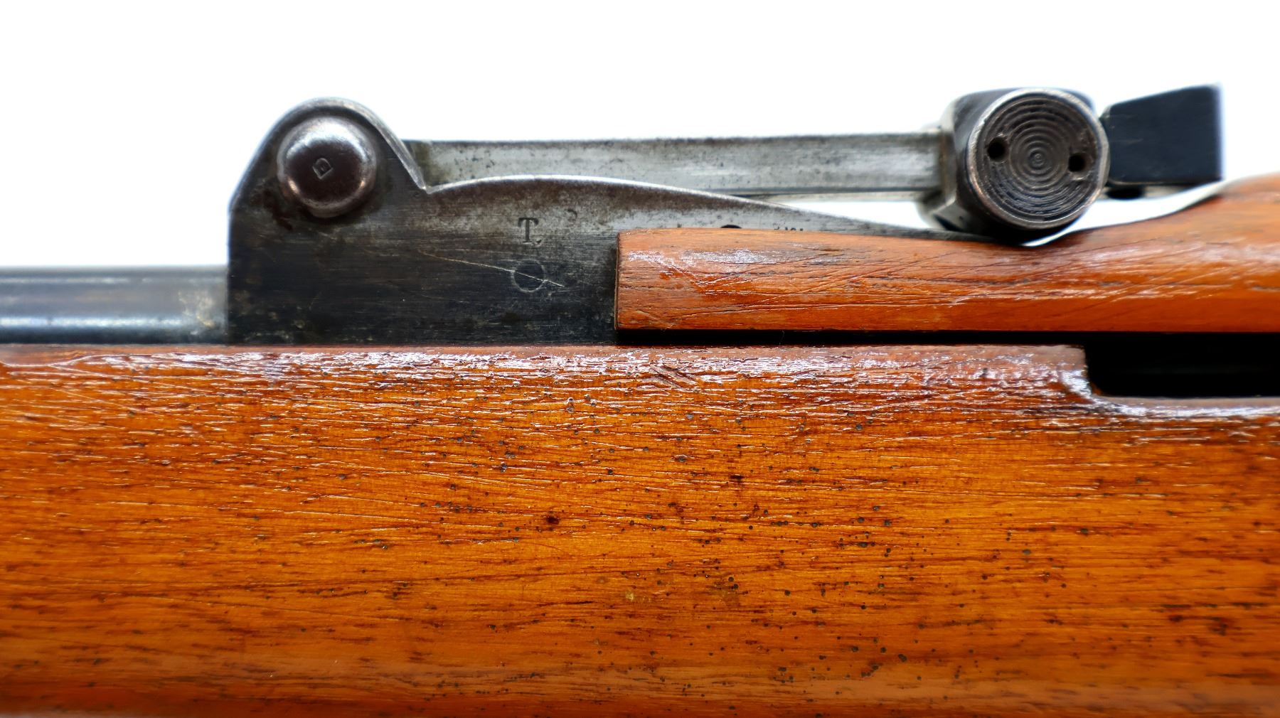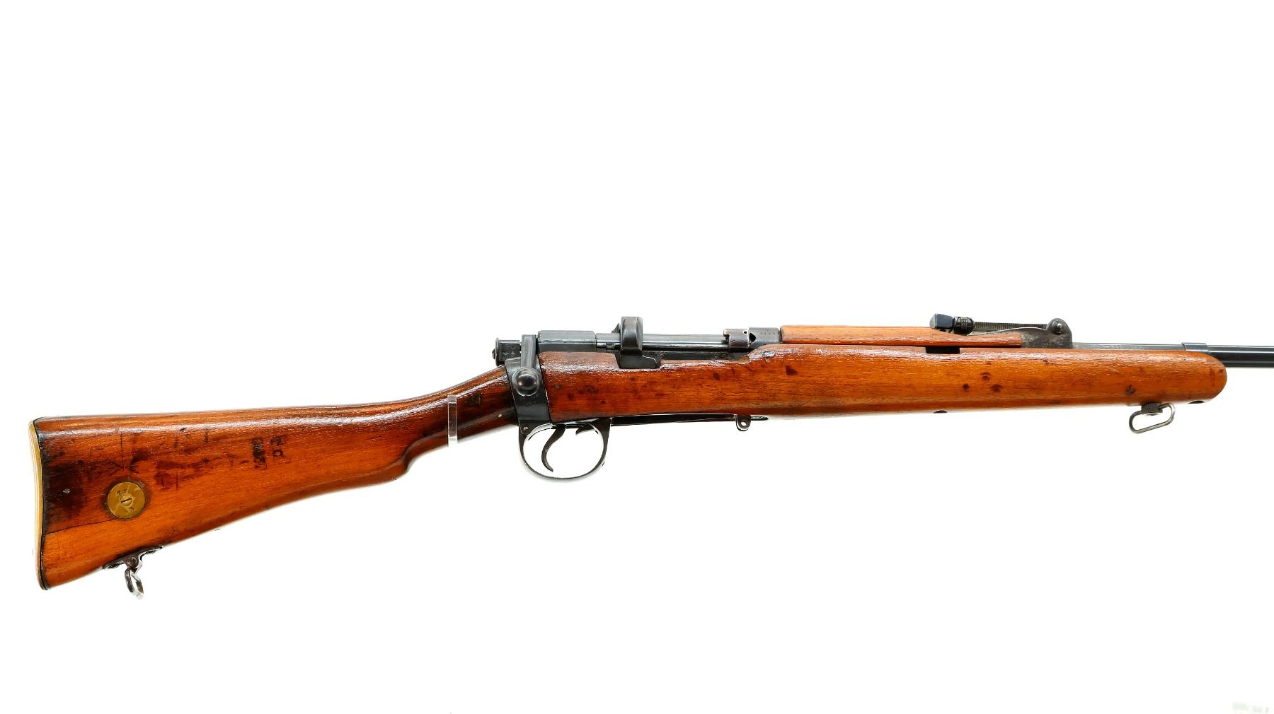 Main Description: Manufactured by BSA Co 1918, bolt mismatched. Blade front sight with ramp, adjustable u notched rear sight, blued finish. Three piece sporterized wood stocks, handguard is cracked, pistol grip, smooth brass butt plate with trap, brass stock disk marked TP43, stock cracked from toe to bottom of grip, sling swivels.