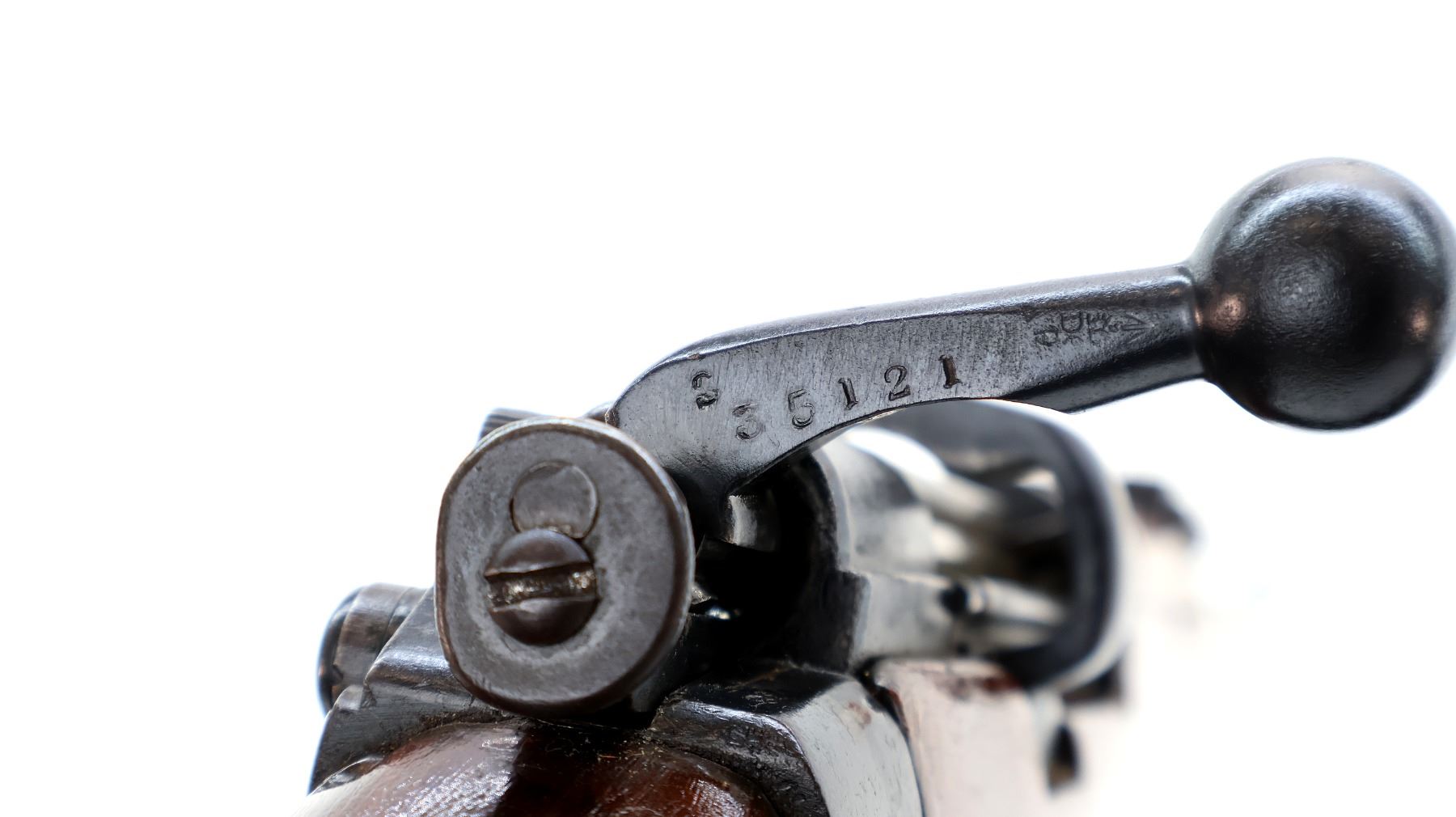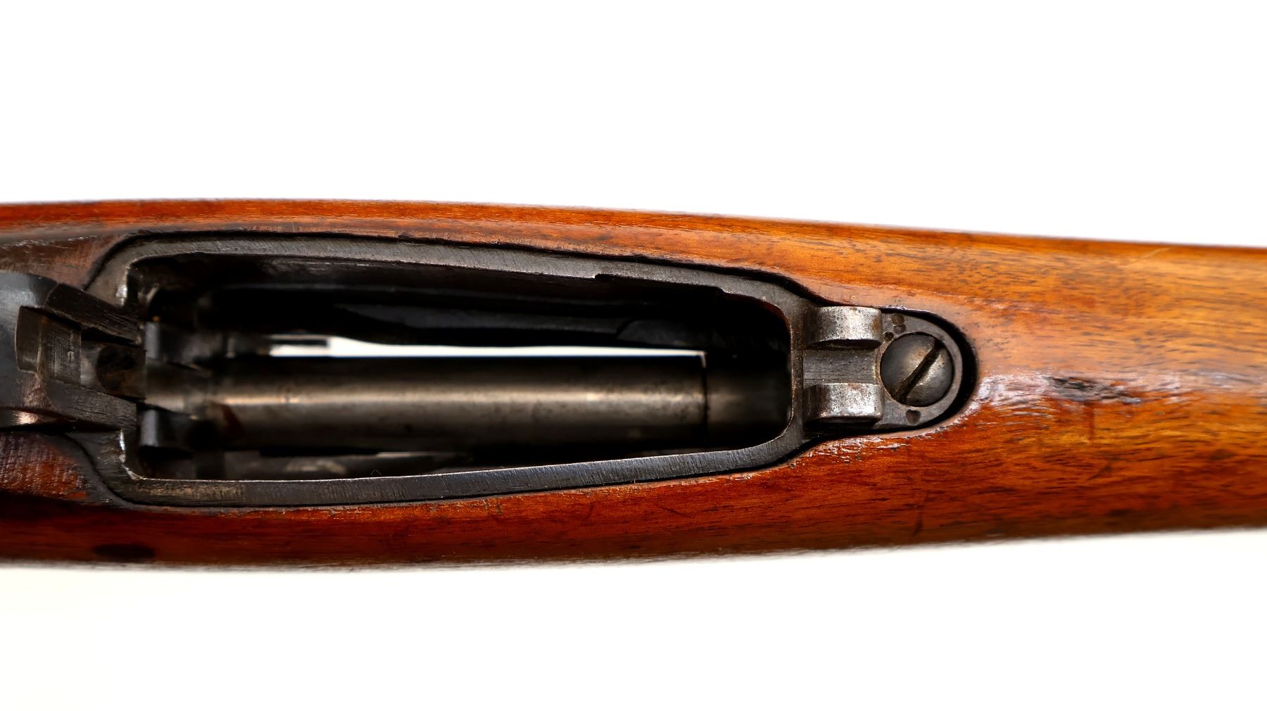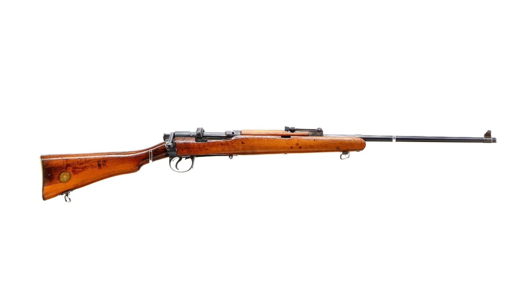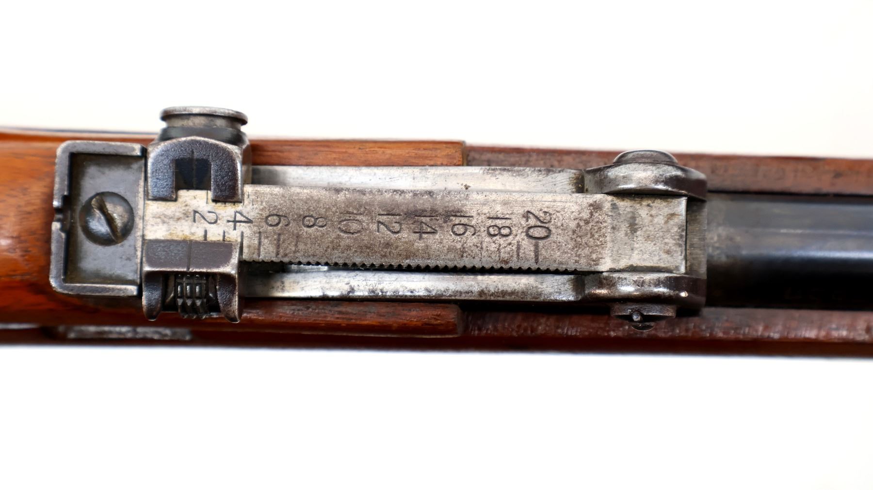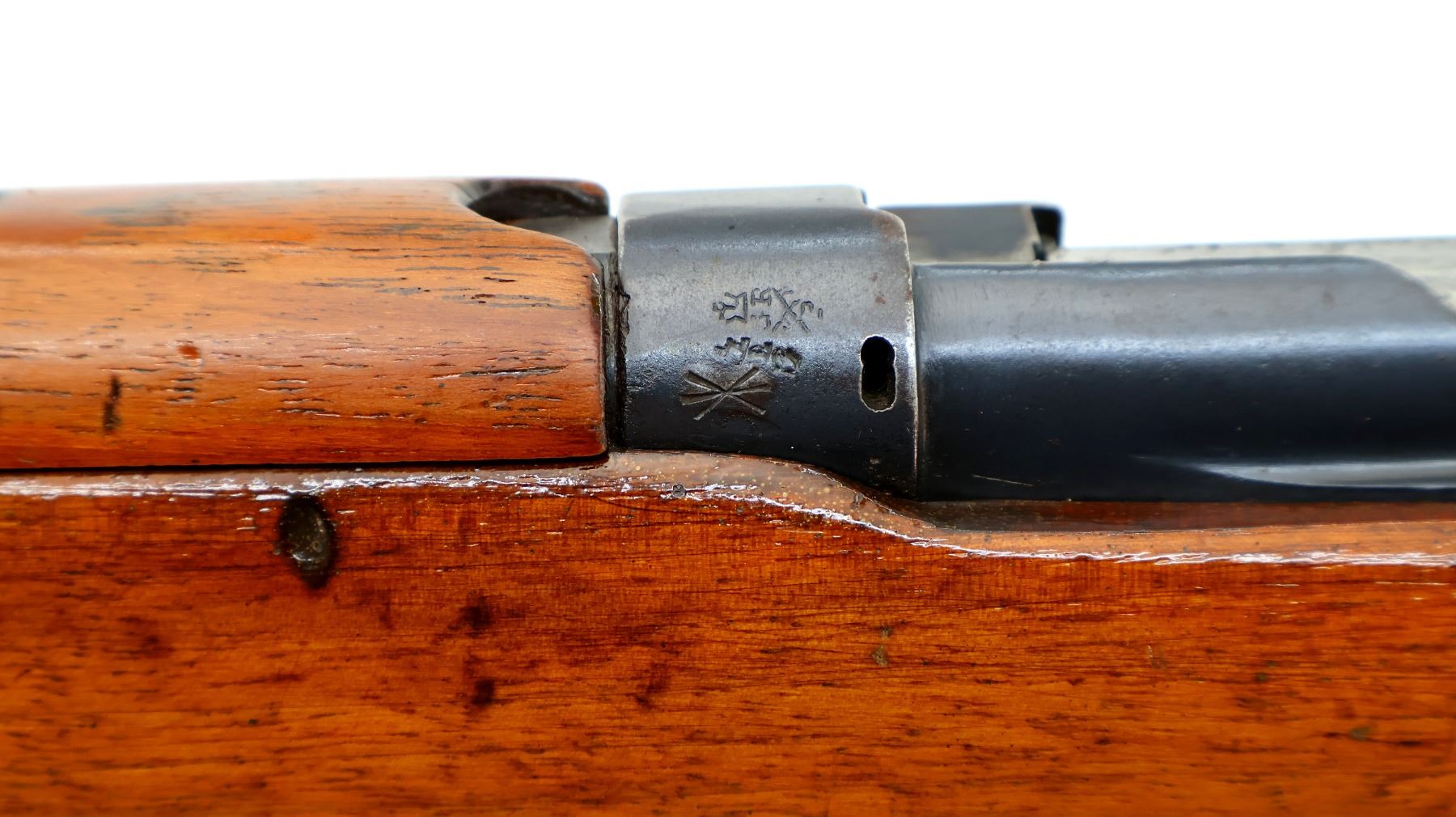 Main Description: Manufactured by BSA Co 1918, bolt mismatched. Blade front sight with ramp, adjustable u notched rear sight, blued finish. Three piece sporterized wood stocks, handguard is cracked, pistol grip, smooth brass butt plate with trap, brass stock disk marked TP43, stock cracked from toe to bottom of grip, sling swivels.