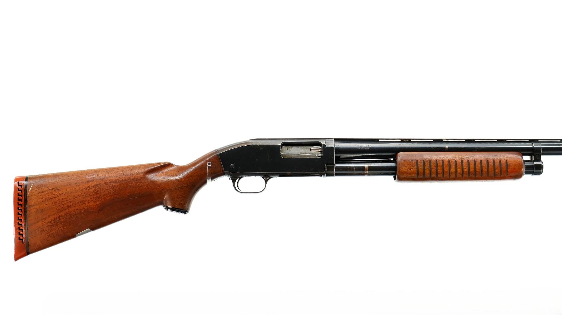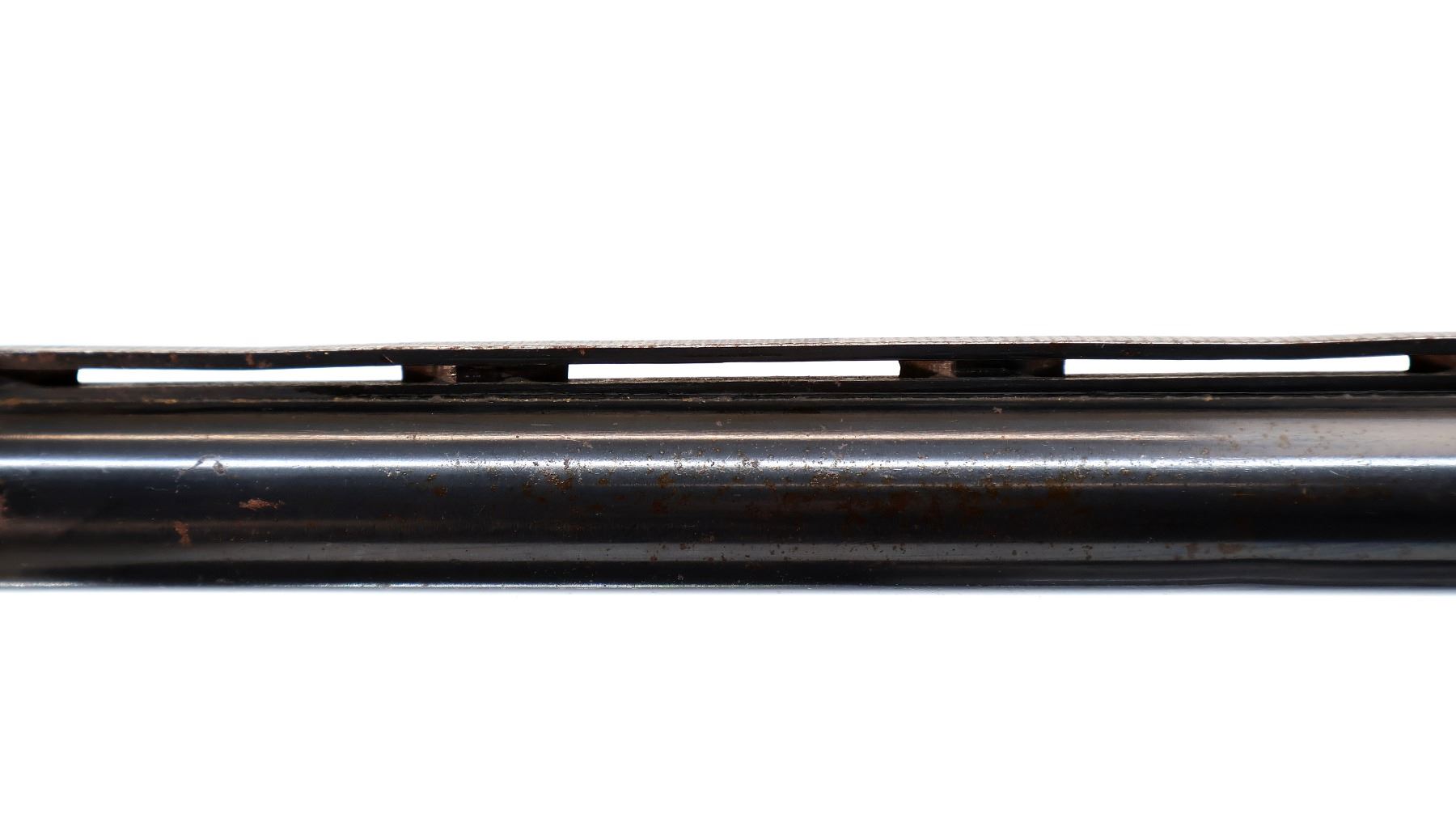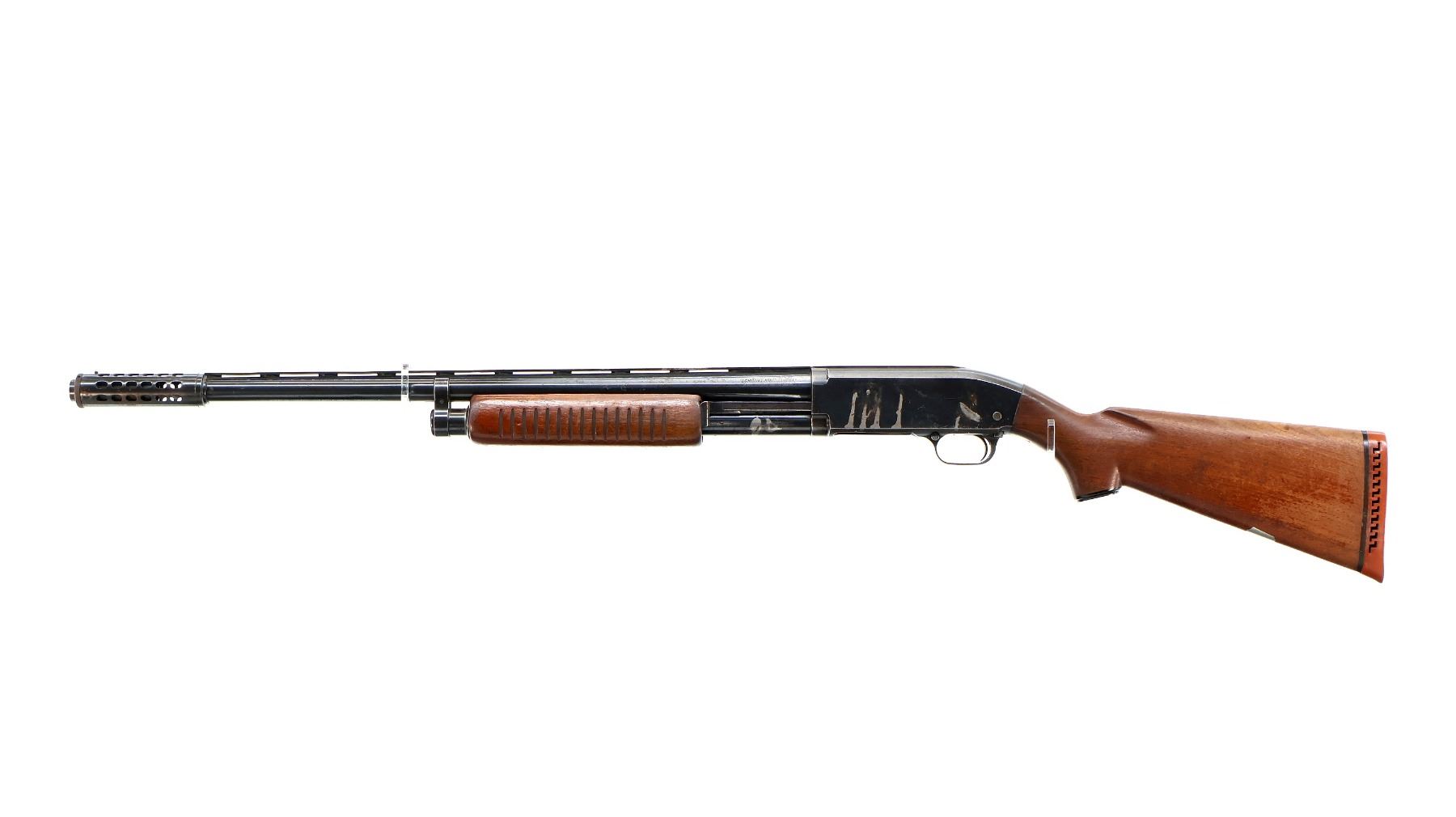 Main Description: Brass front and white mid rib beads, blued finish, vent rib with two shallow dents and ported brake installed, jewelled bolt. Two piece wood stocks, grooved forearm, pistol grip cracked behind receiver, red vented rubber recoil pad, vanity plate, grip cap.