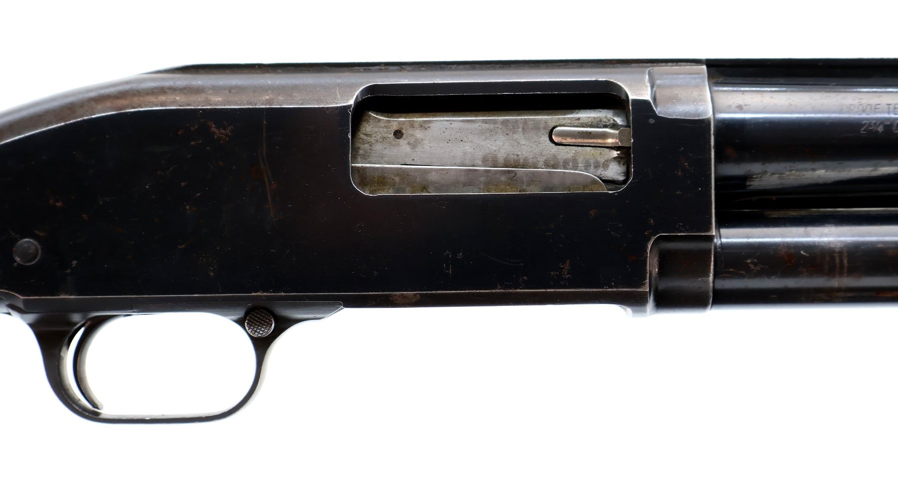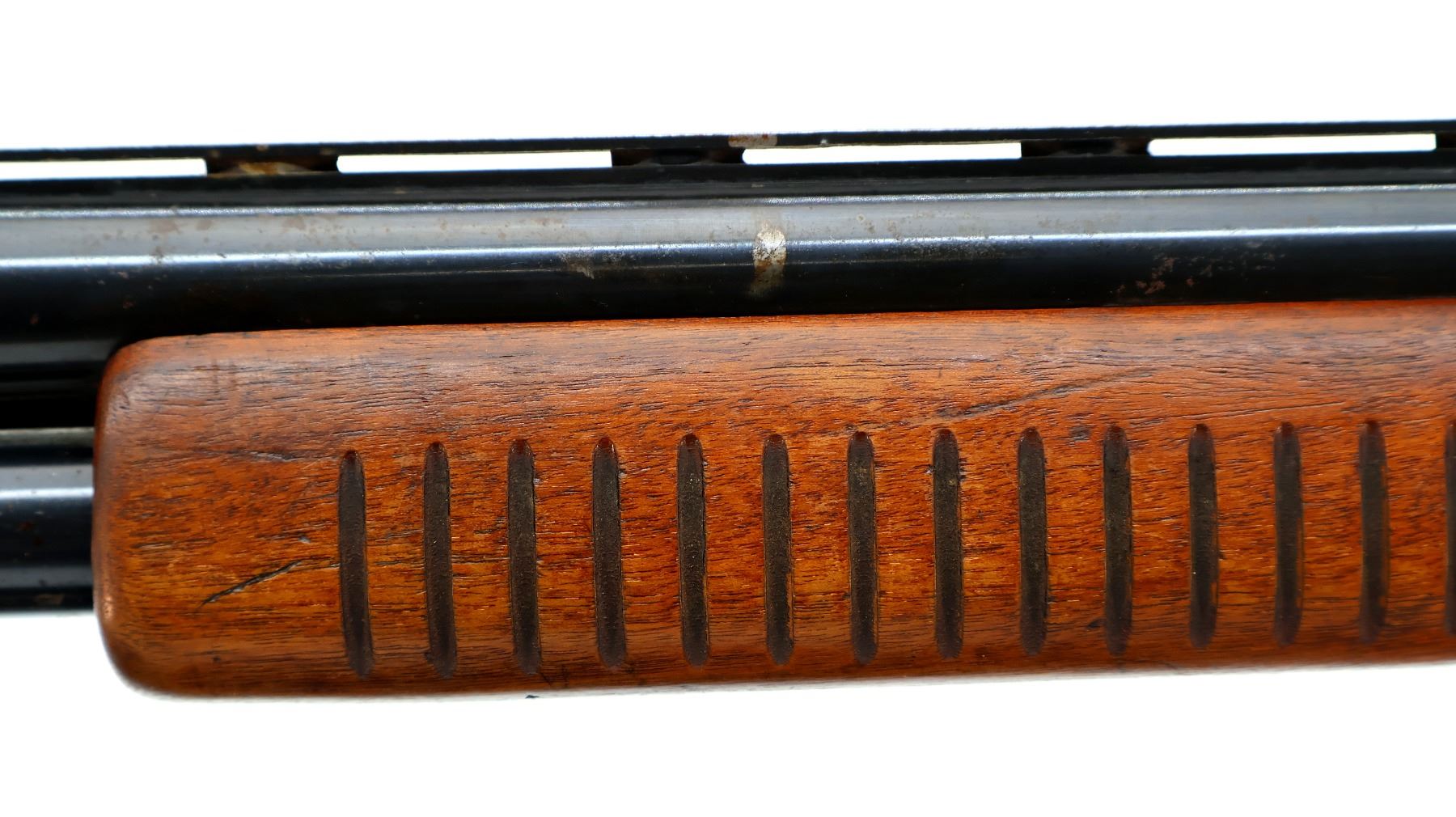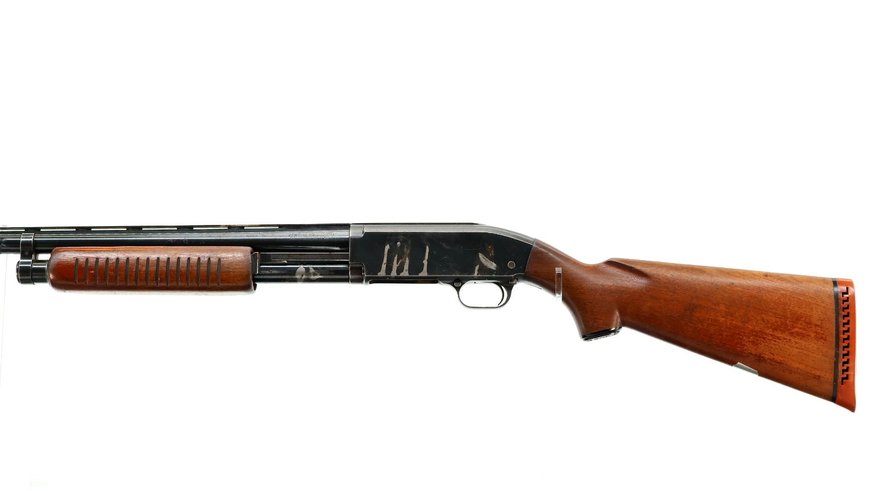 Main Description: Brass front and white mid rib beads, blued finish, vent rib with two shallow dents and ported brake installed, jewelled bolt. Two piece wood stocks, grooved forearm, pistol grip cracked behind receiver, red vented rubber recoil pad, vanity plate, grip cap.