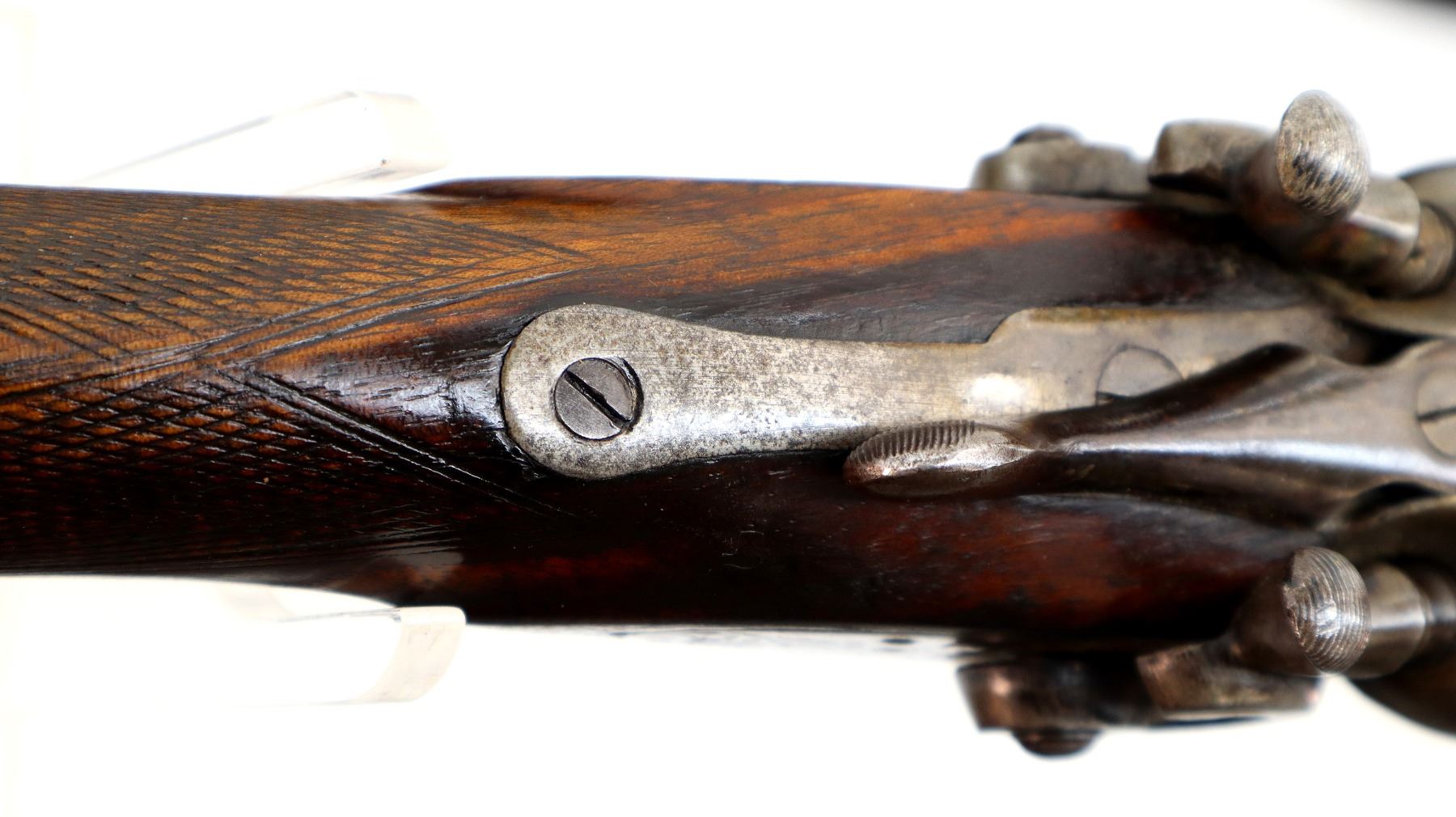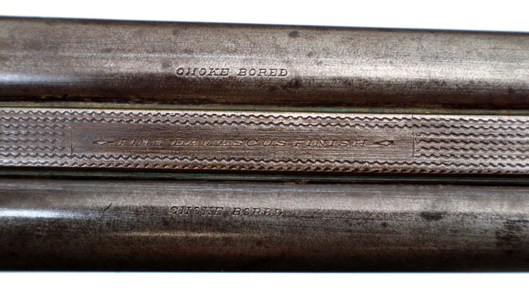 Main Description: Brass bead, Damascus barrels with grooved rib that are loose on face, engraved side locks and grooved spur hammers that function, extractor, double triggers. Two piece wood stocks, checkered forearm and pistol grip, chipped and cracked behind locks, receiver and tang, checkered black polymer butt plate which is broken, stock chipped at toe, vanity plate.